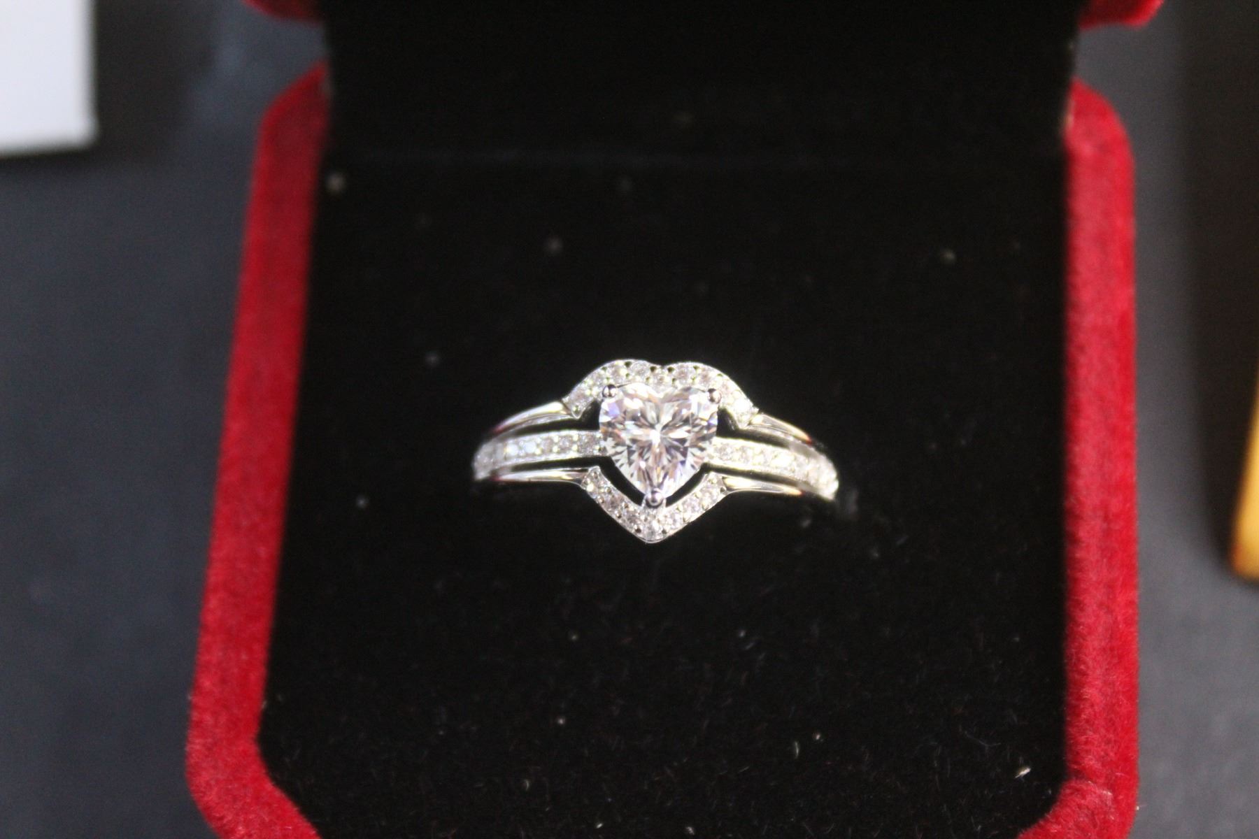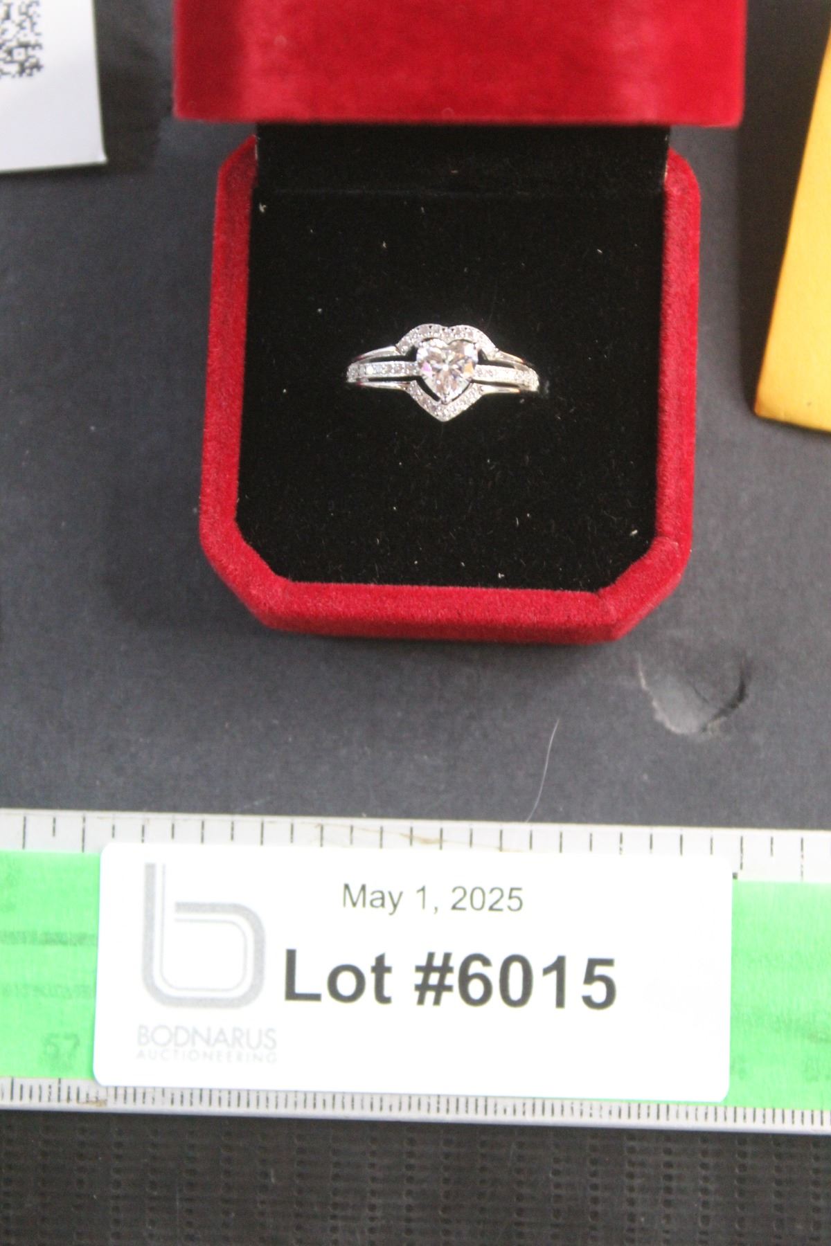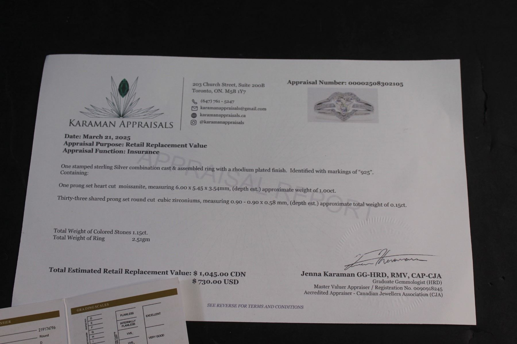 1.00 CT GRA CERTIFIED HEART CUT MOISSANITE STONE VVS D COLOR WITH 33 ROUND BRILLIANT CUT CUBIC ZIRCONIA SET IN SHANKS SET IN 925 SILVER RING SIZE 7 RETAIL VALUE $1045