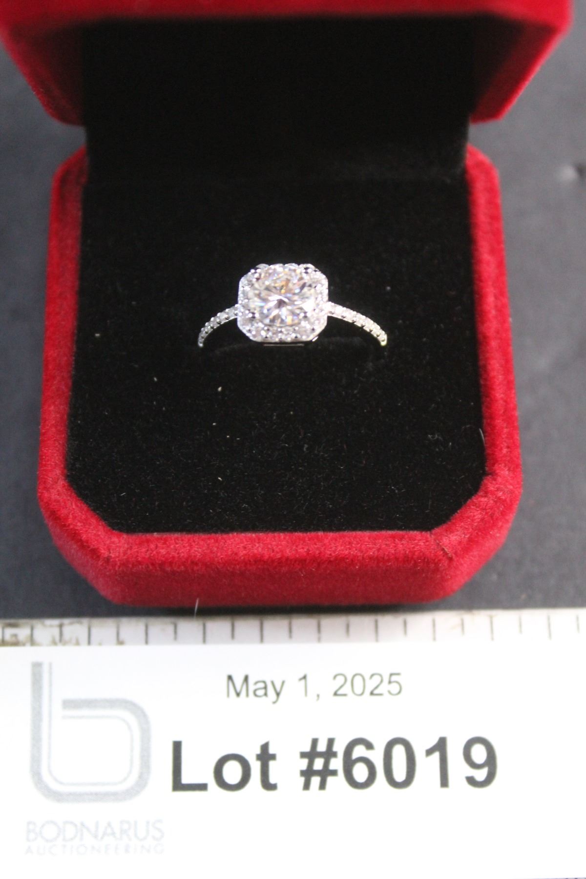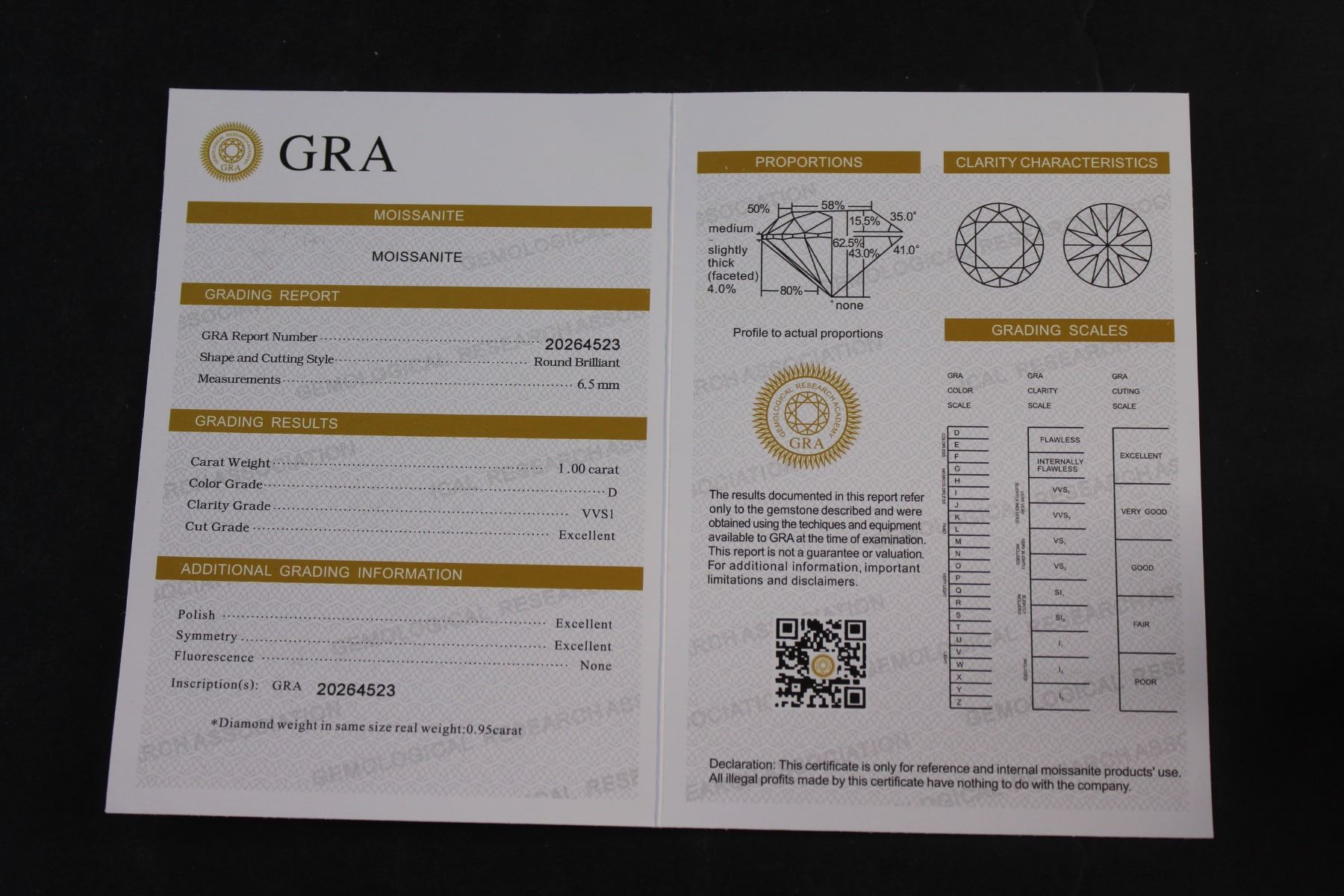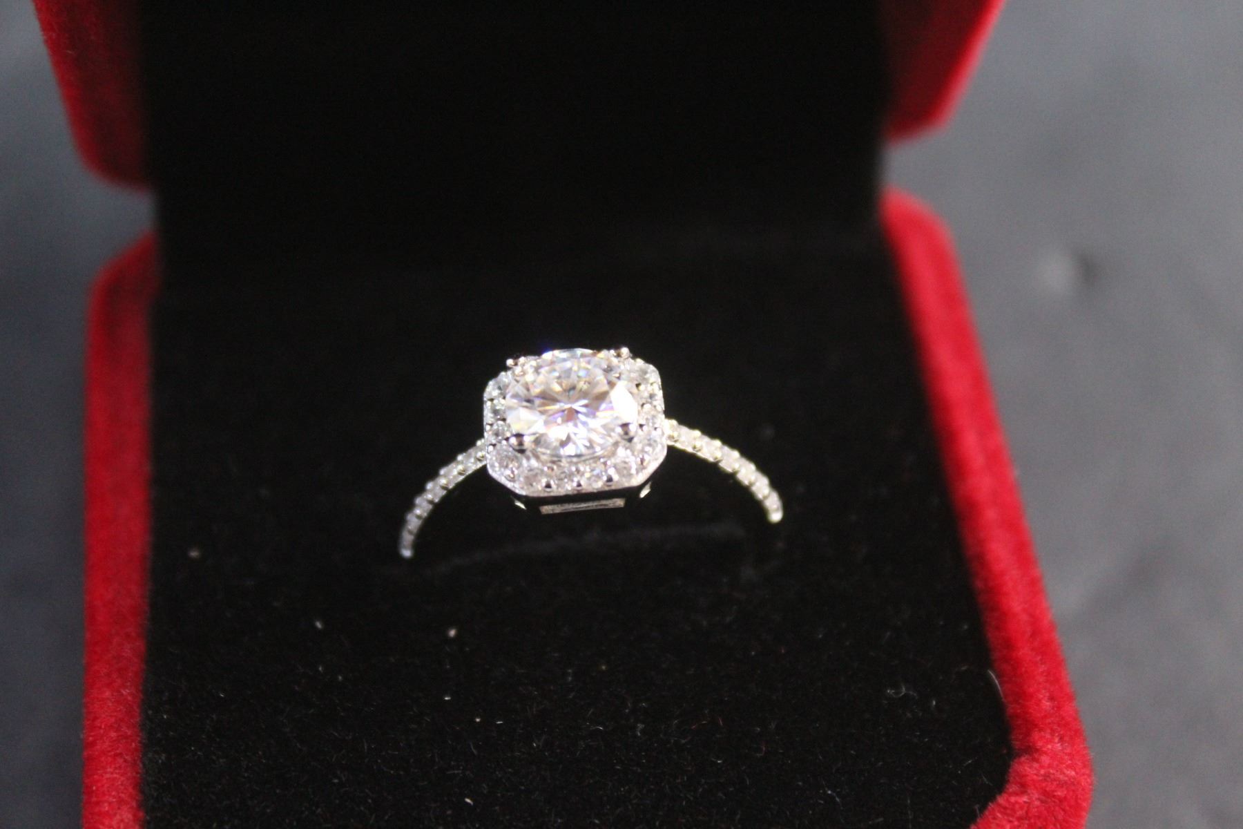 1.00 CT GRA CERTIFIED ROUND BRILLIANT CUT MOISSANITE STONE VVS D COLOR WITH 28 ROUND BRILLIANT CUT CUBIC ZIRCONIA SET IN SQUARE SHAPED HALO AND IN SHANKS SET IN 925 SILVER RING SIZE 6 RETAIL VALUE $1100