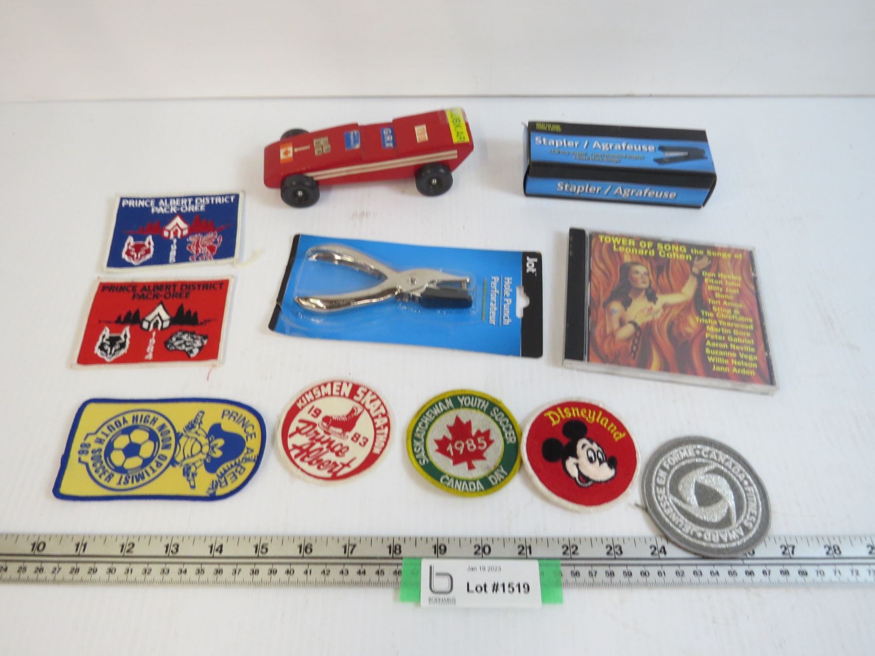 (1) CD - Stapler - Hole Punch - Wooden Car - Patches/Emblems