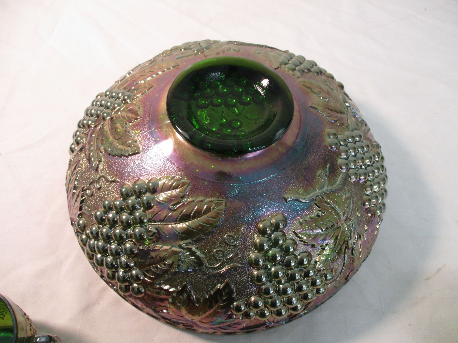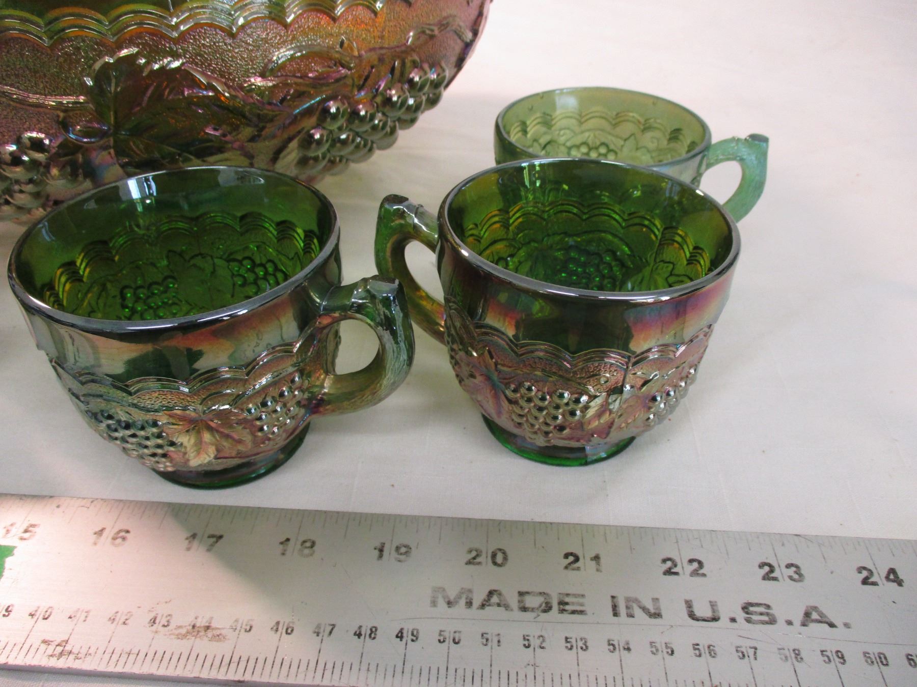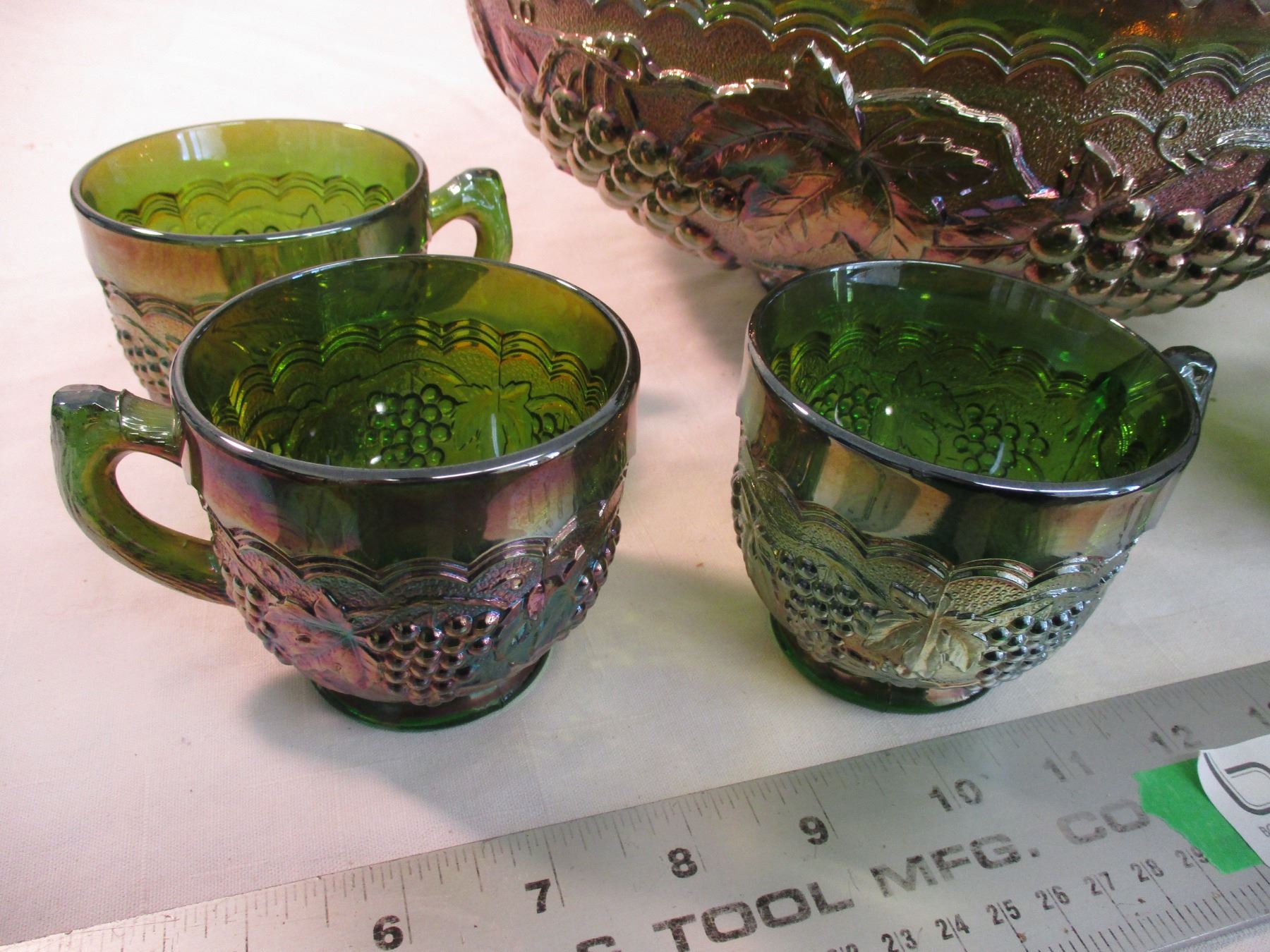 (1) Large + (6) Small - green carnival glass bowl + cups