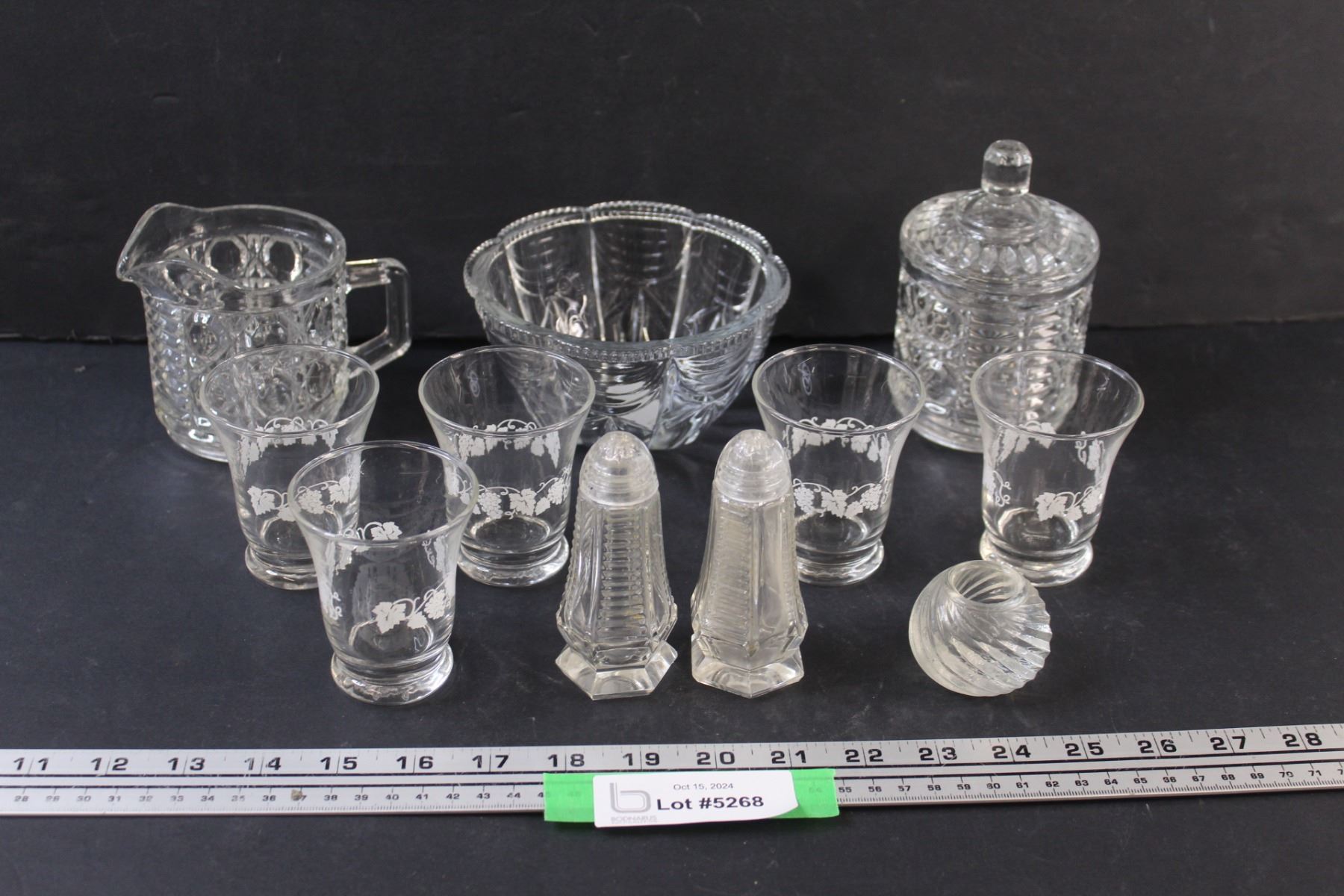(10) Clear Glass Lot: Cream & Sugar Dishes, Candy Dish, Glasses, Salt & Pepper Shakers, Candleholder