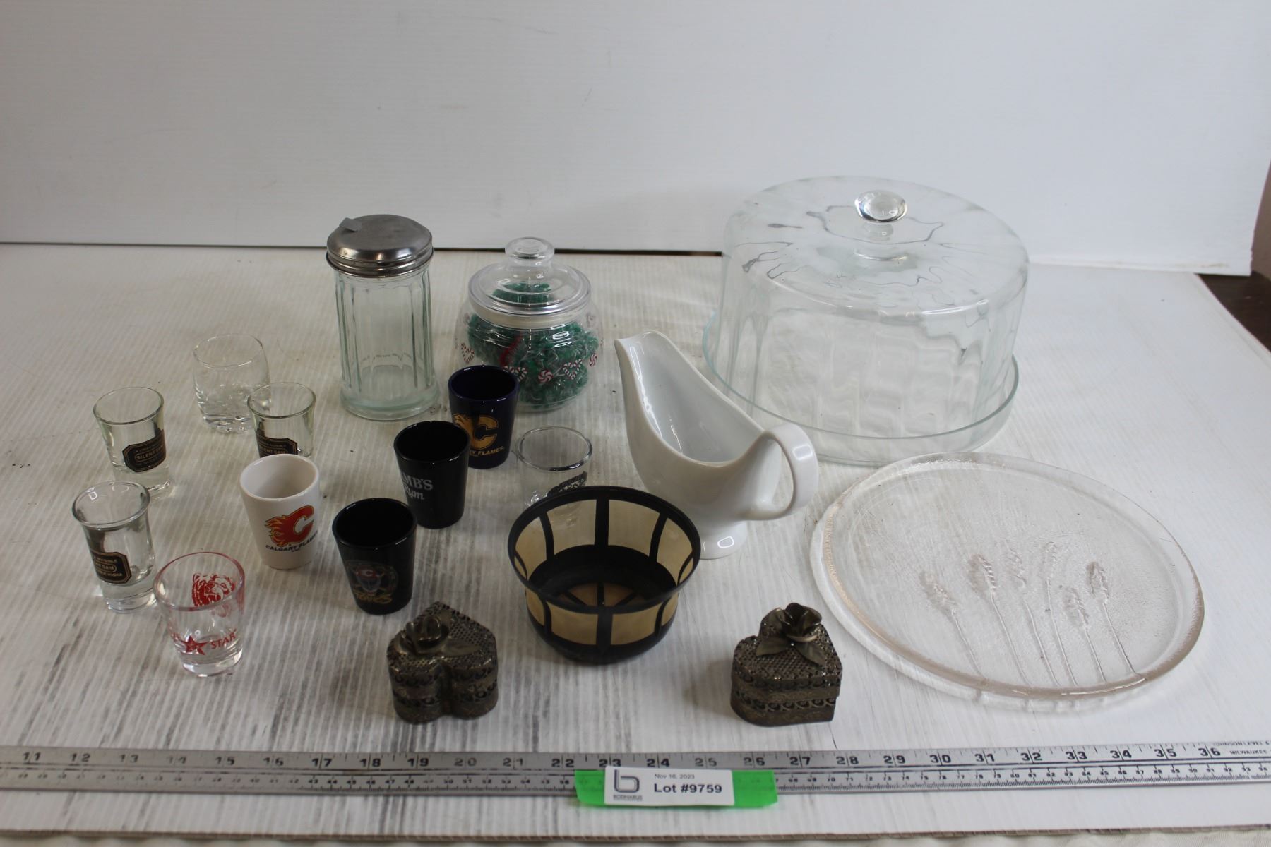 (10) Shot Glasses, Gravy Boat, Glass Cake Display, Misc.