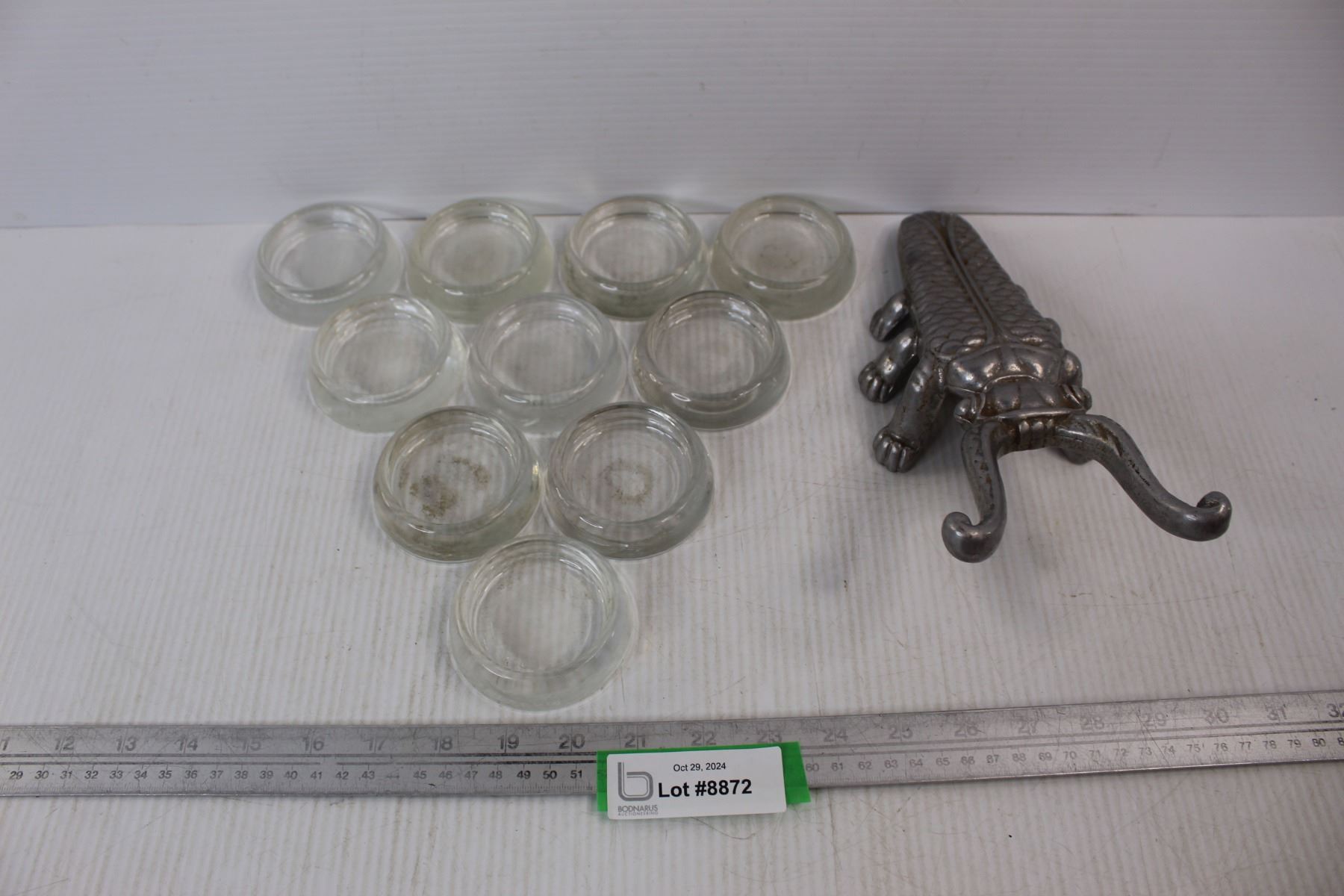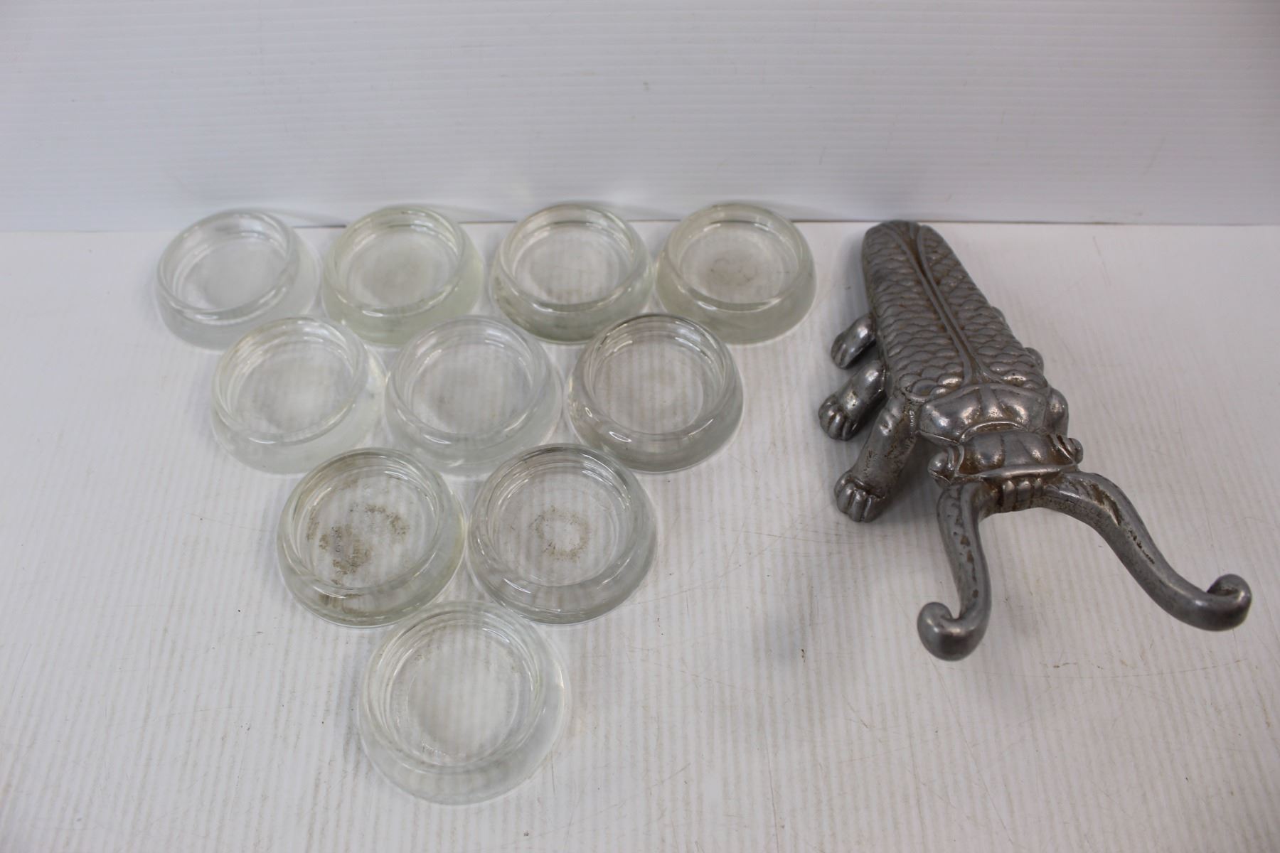 10'' Vintage Aluminum Beetle Shaped Boot Jack, (10) Glass Furniture Leg Coasters