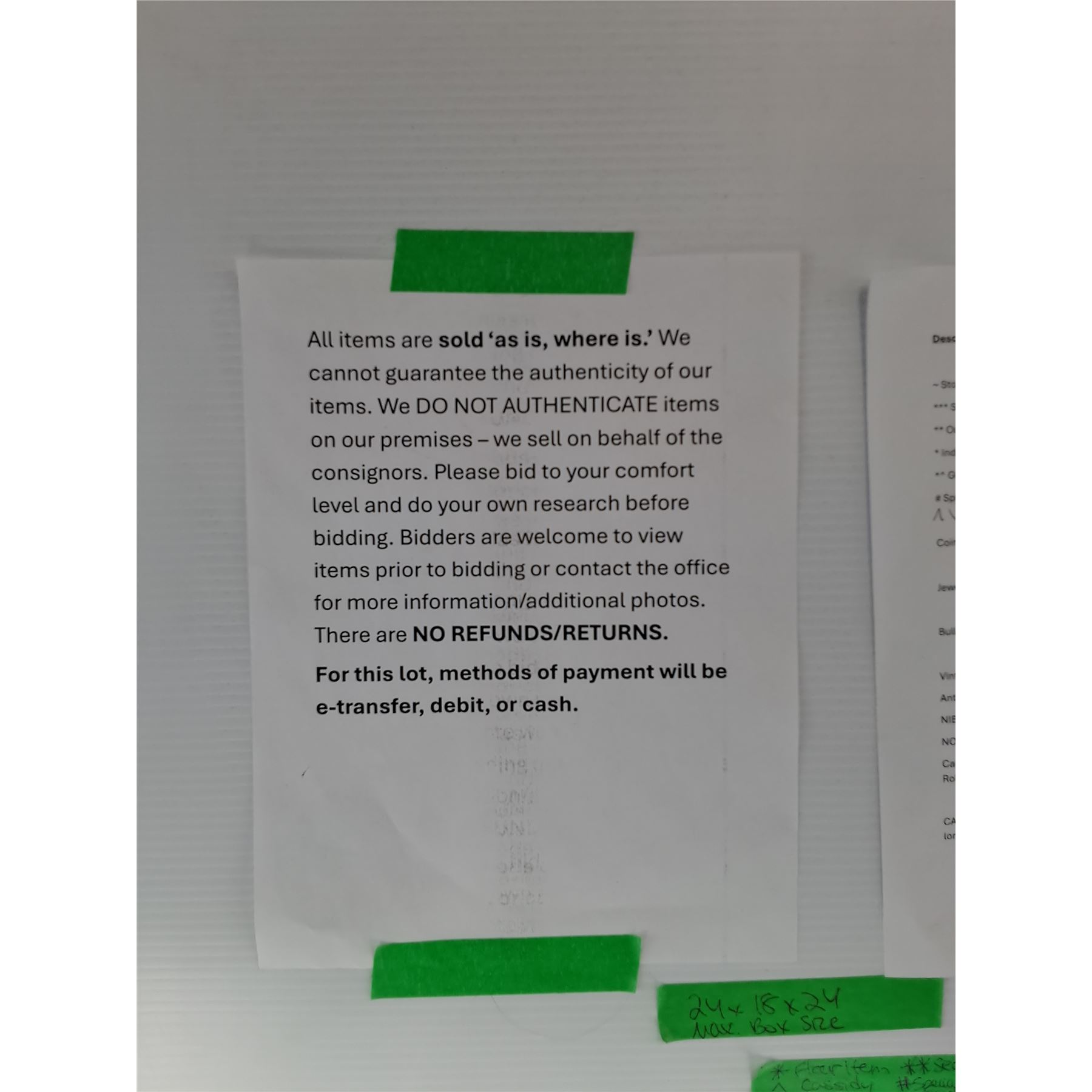 If you are wanting to hold on items for another auction coming up, let us know within 24 hours (maximum hold: 2 auctions). Please give 15 to 30 days for items to be collected, packed, payment processed and shipped out.