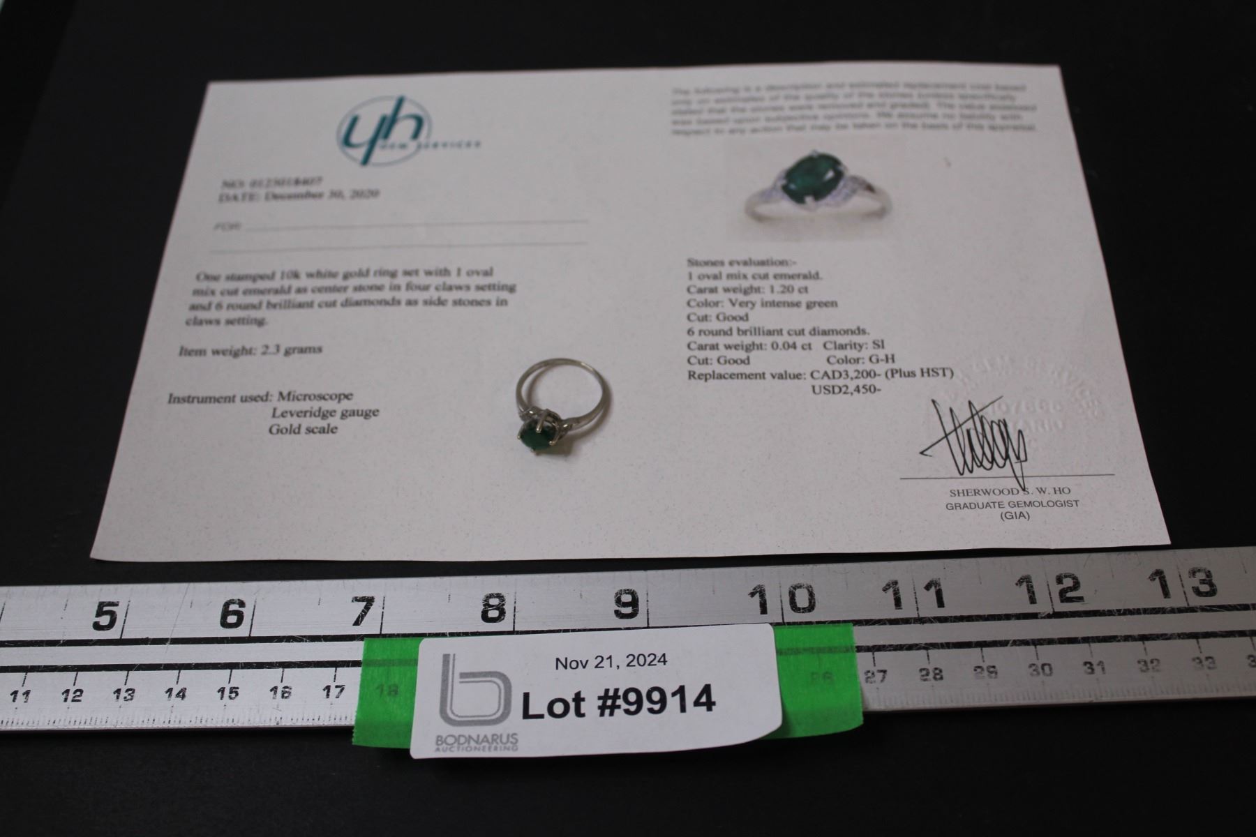 ^ 10K White Gold Ring, Set with Oval Mix Cut Emerald, Six Round Cut Diamonds, w/Certificate