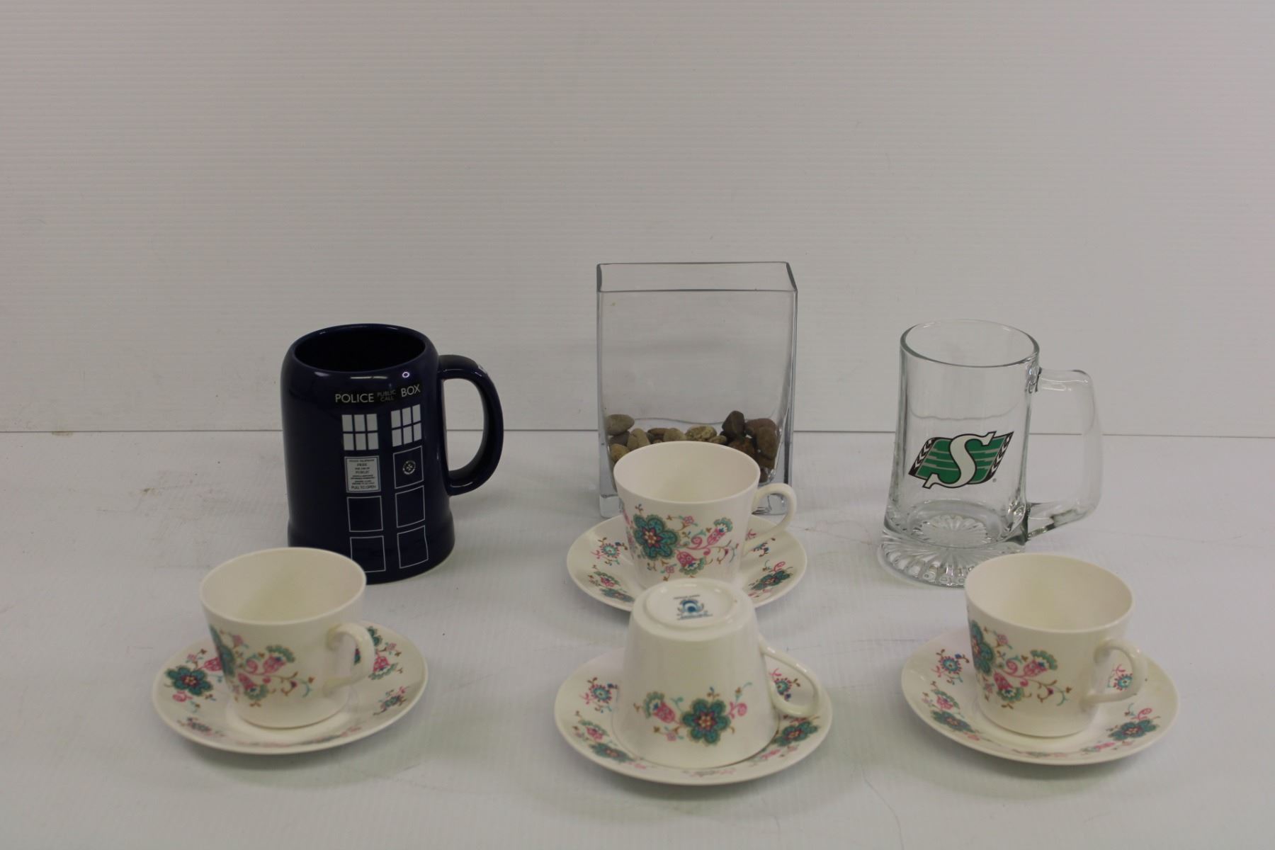 (11) Lot of Tea Cup 8 Piece Set; Rider Mug; Police Mug; Square Glass Vase with Decorative Rocks