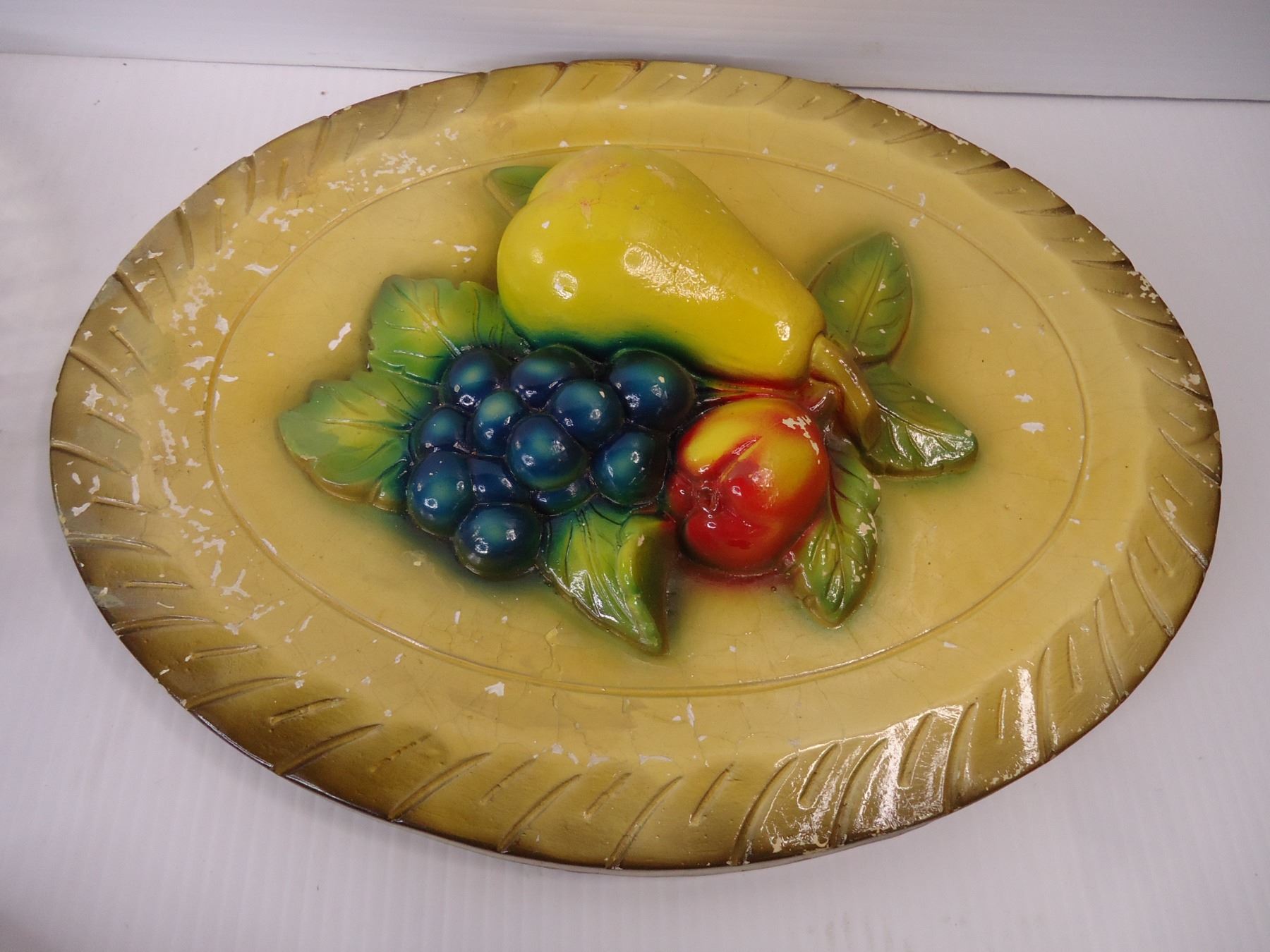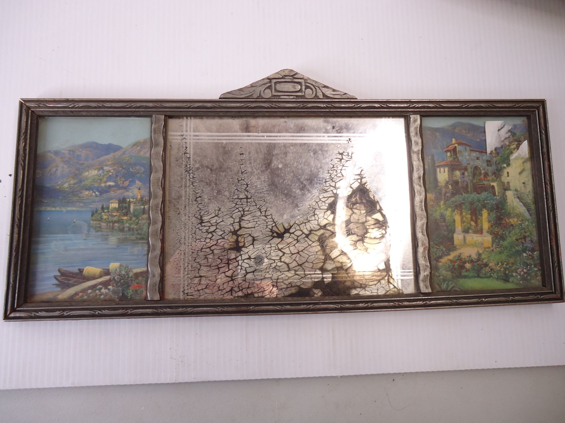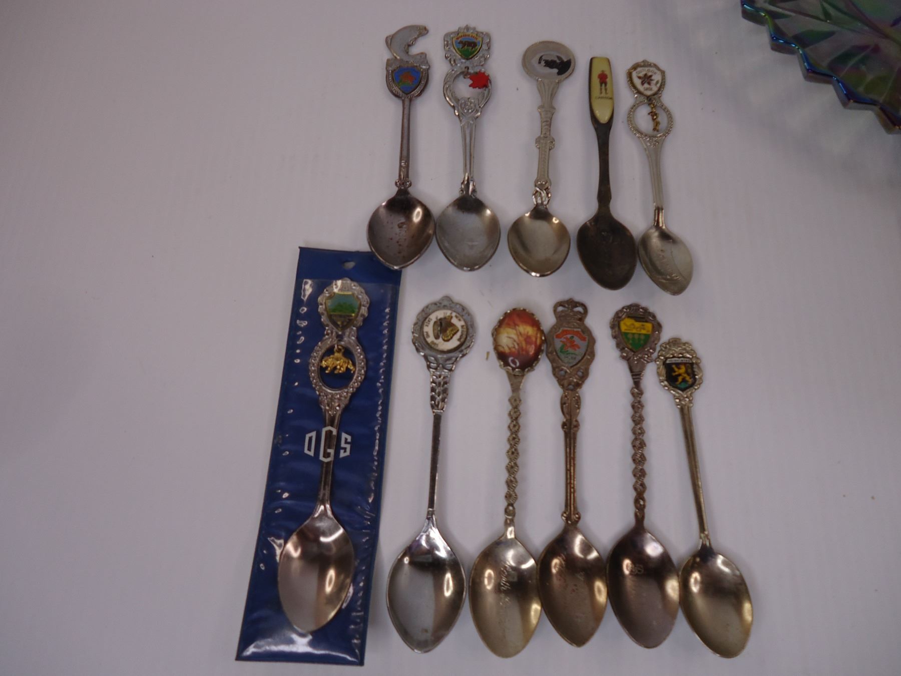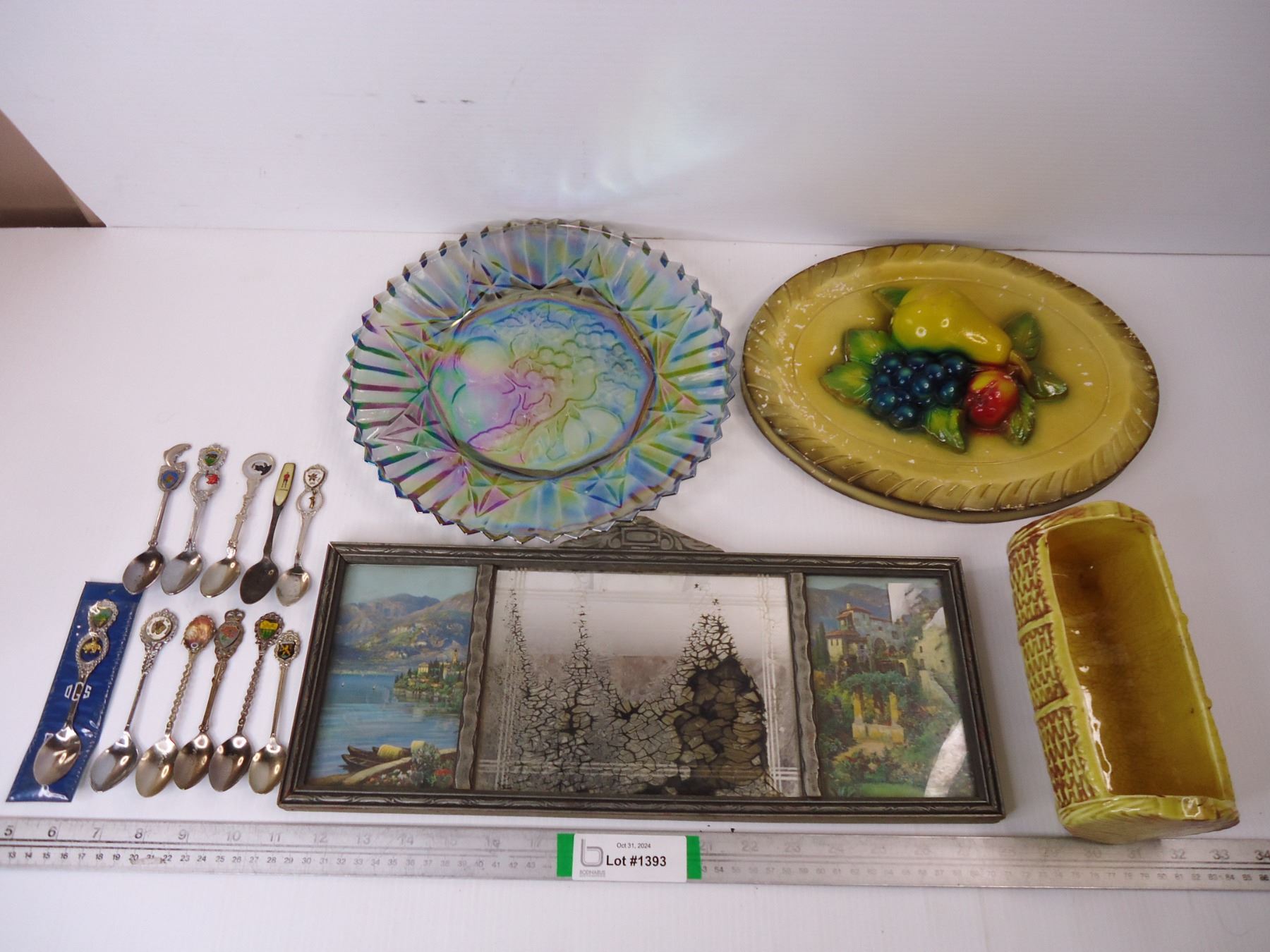 (11) Souvenir Spoons, Chalkware Fruit Plate, Iridescent Plate, Pottery Planter and Mirror/Picture Combo