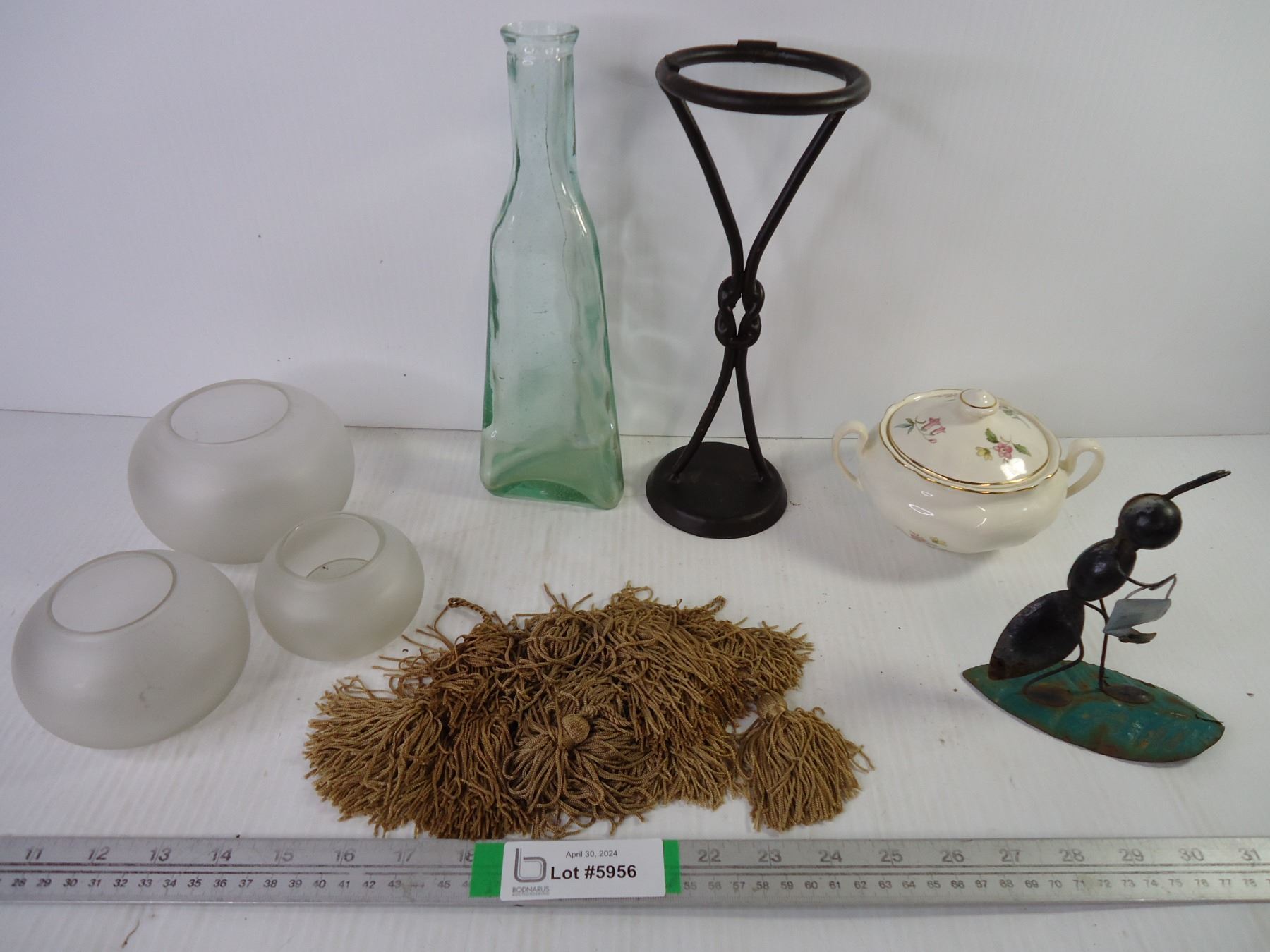 (12) Tassels,(3) Candle Holders, Sugar Container, Metal Ant Ornament, Deco Glass Bottle and Metal Candle Holder