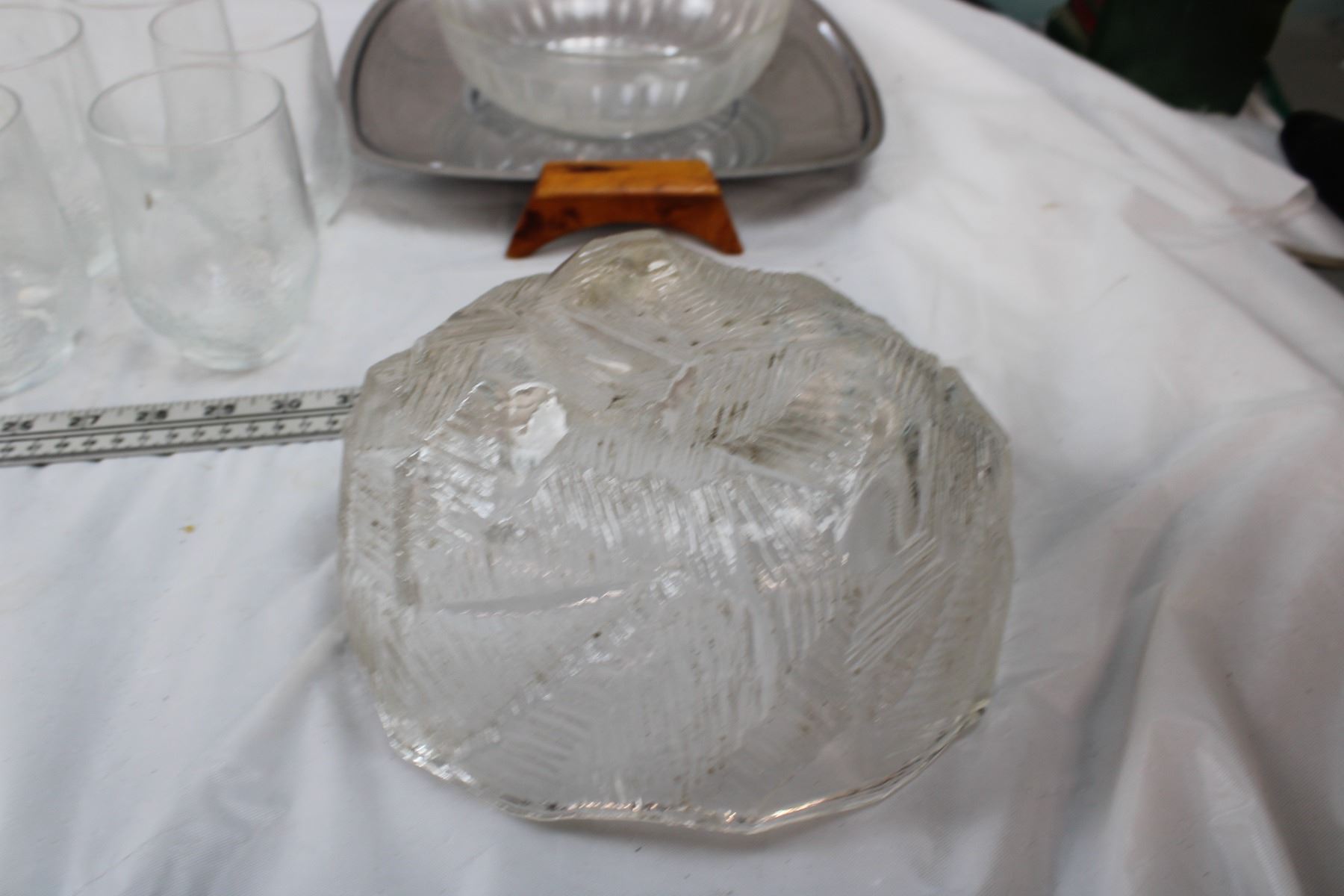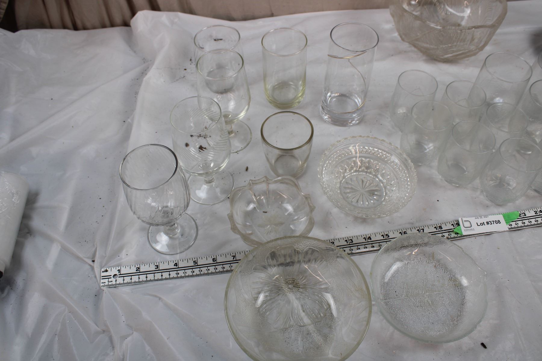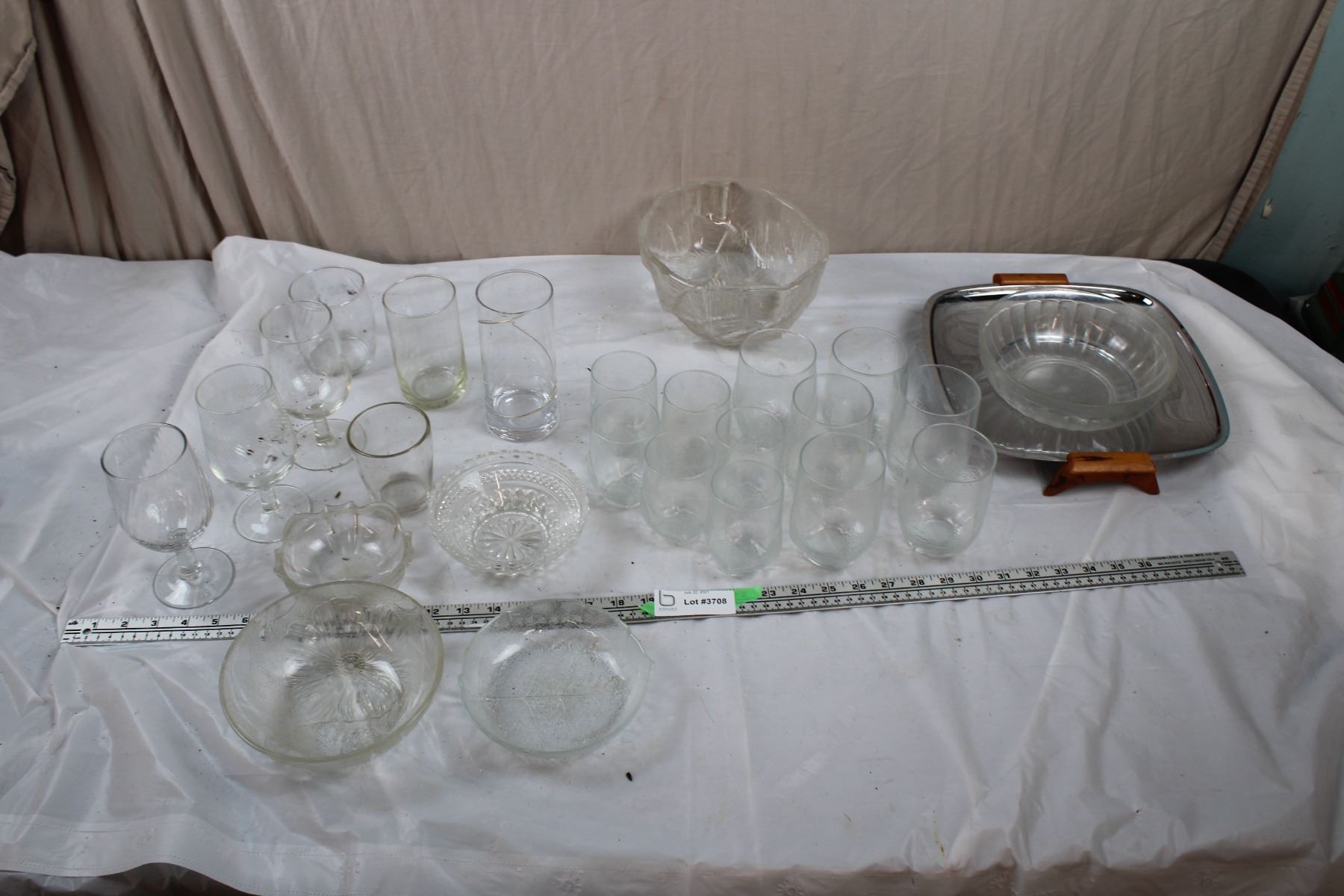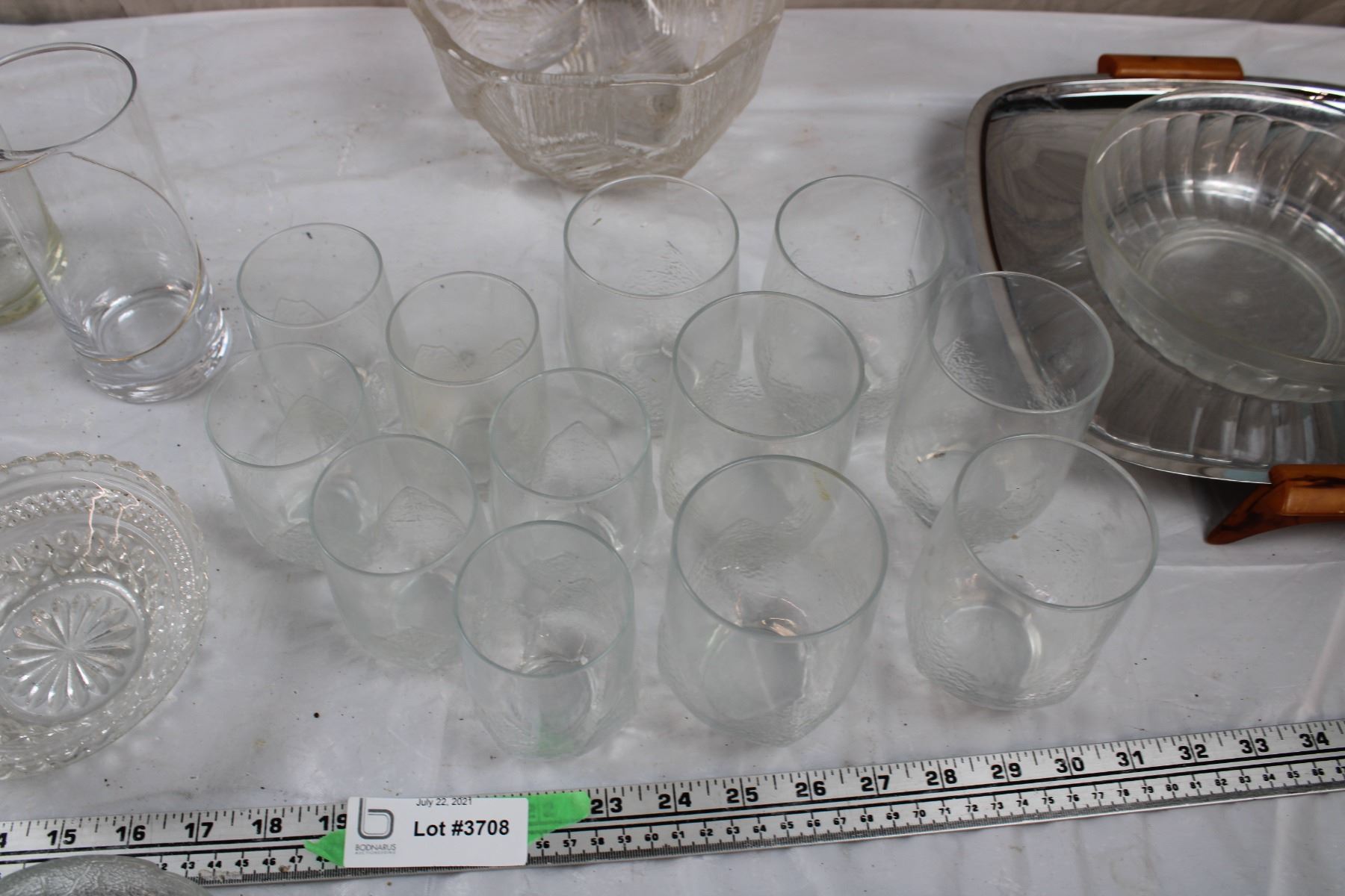 12cup etched glass set with unique candy bowl, metal serving tray + miscellaneous glassware