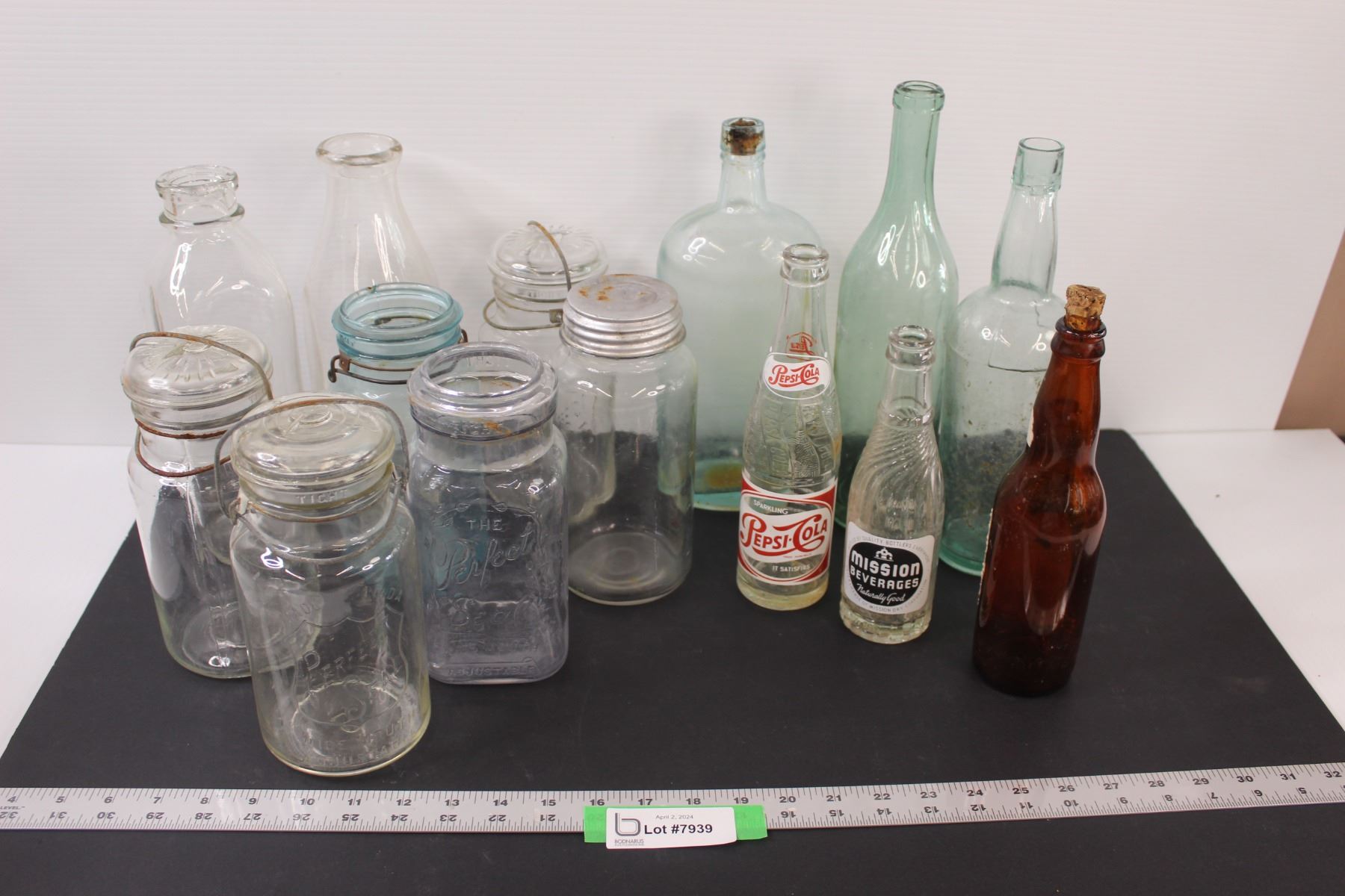 (14) Glass Bottles: Mason Clamp-Top Jars, Milk Jugs, Pepsi, Misc.