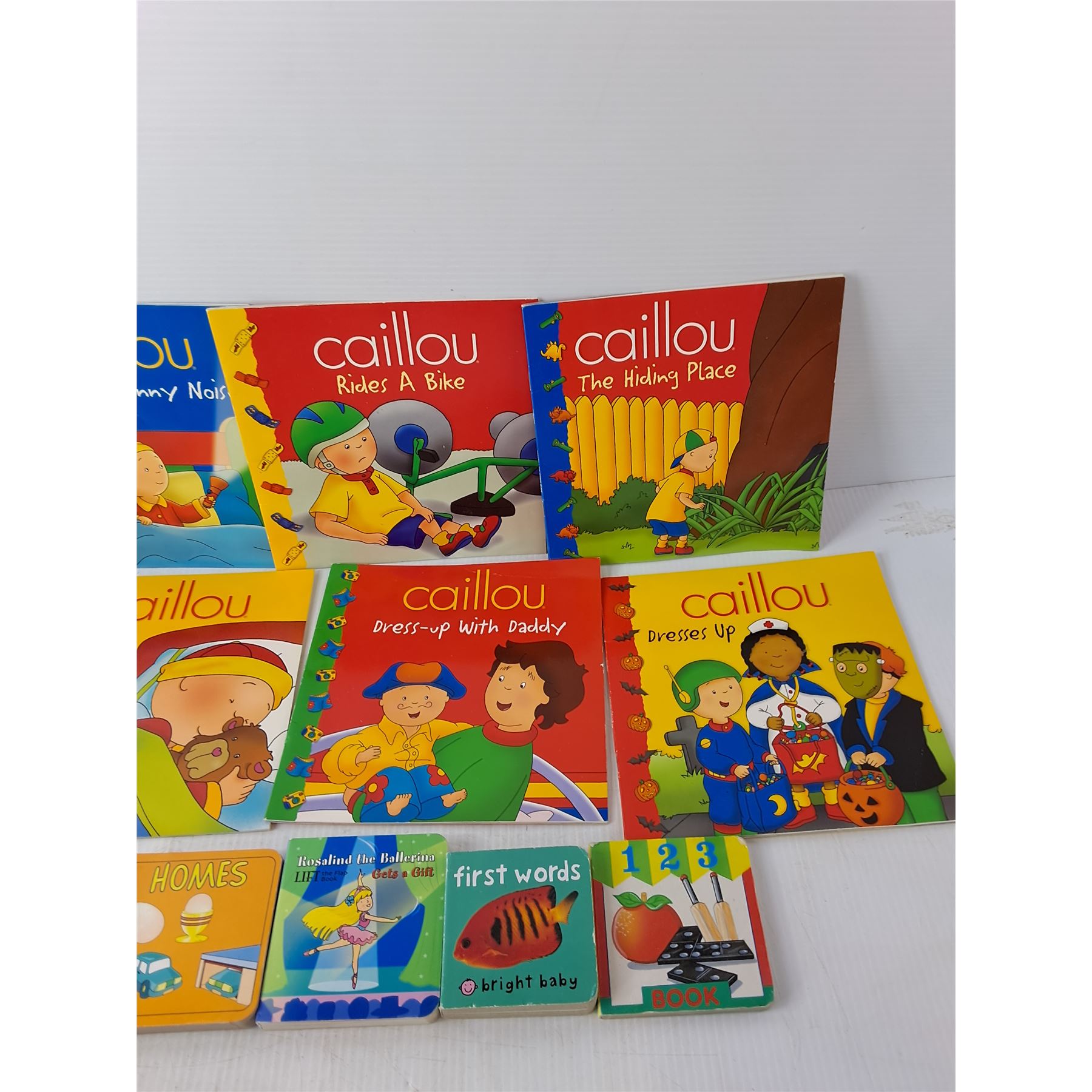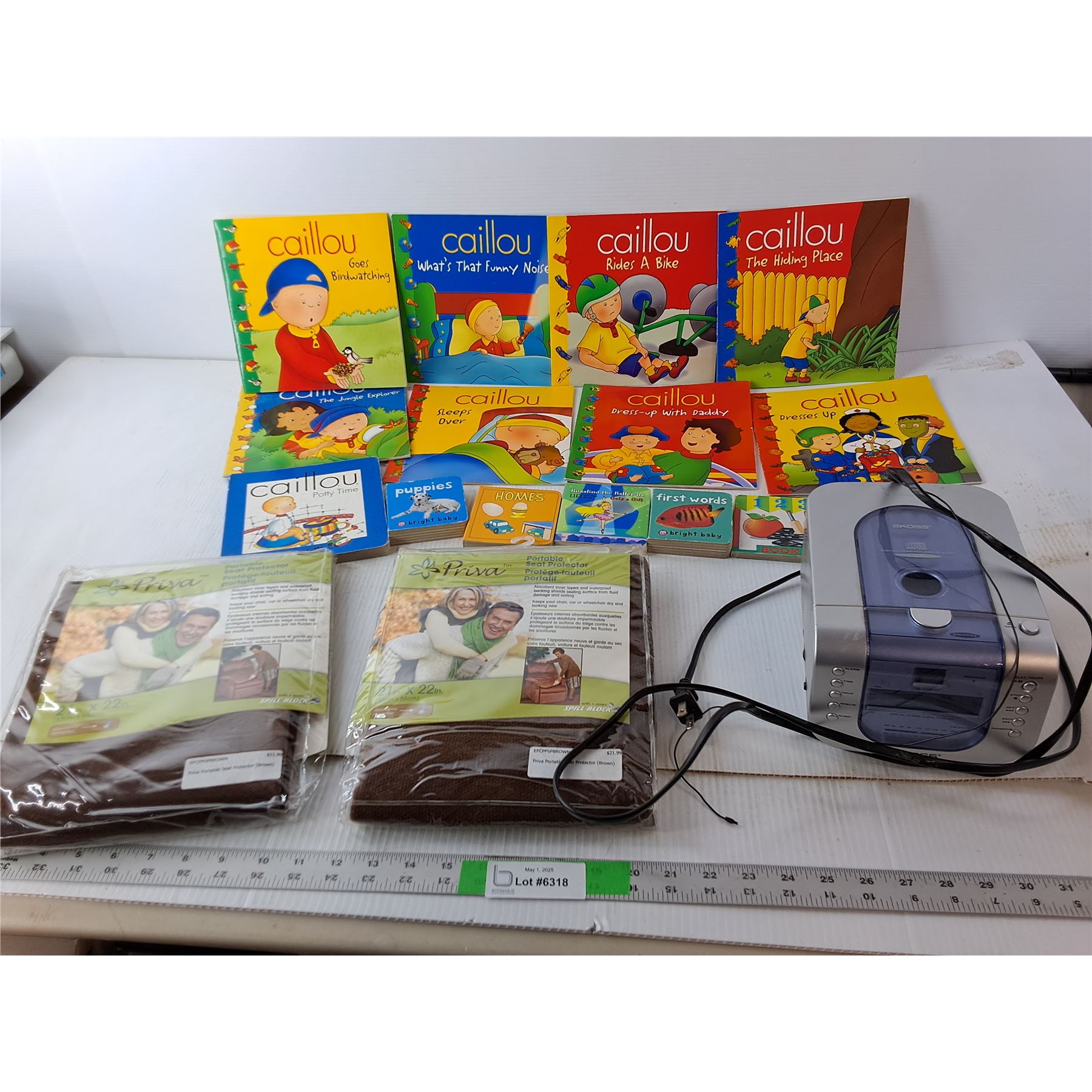 (14) Kids Books- Cailou, Other, (2) Seat Covers, Koss Alarm Clock/Cd Player-Powers On