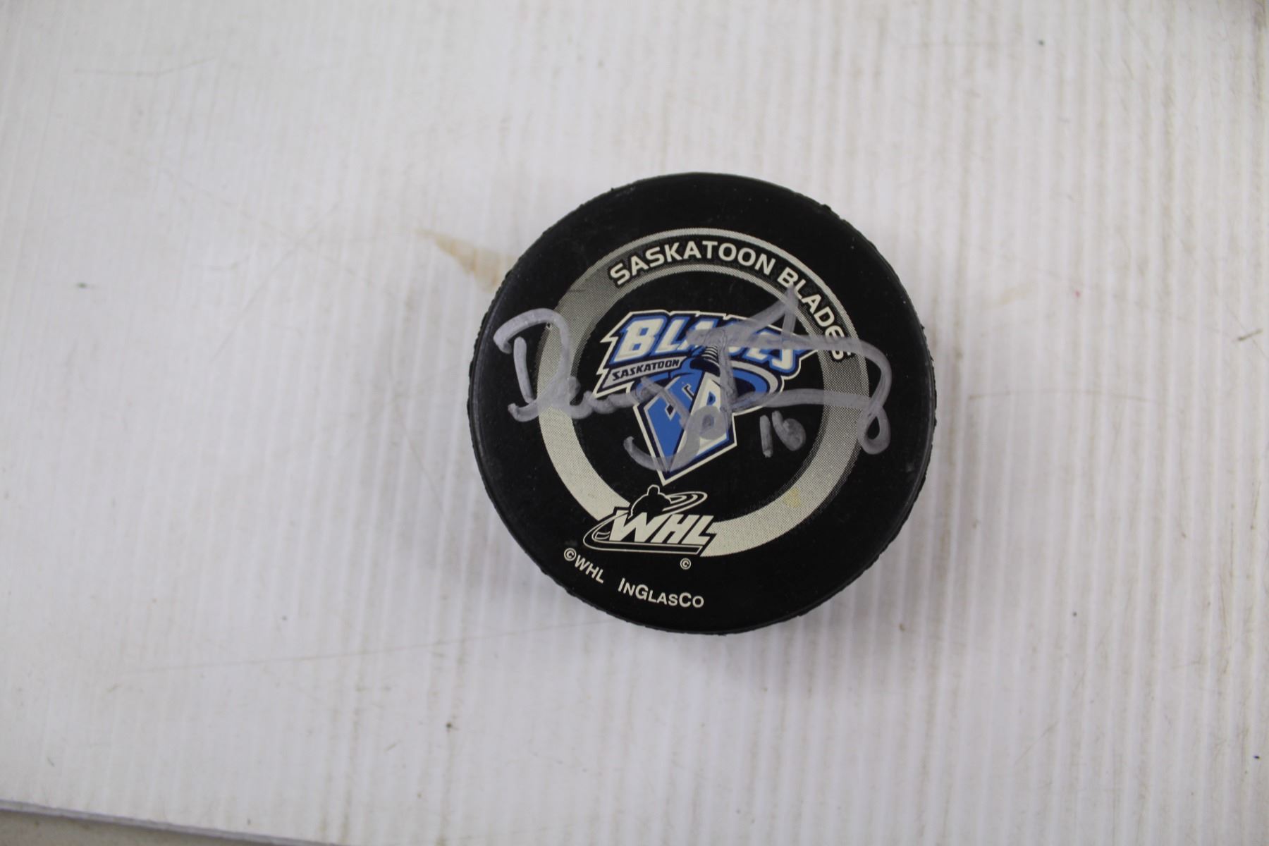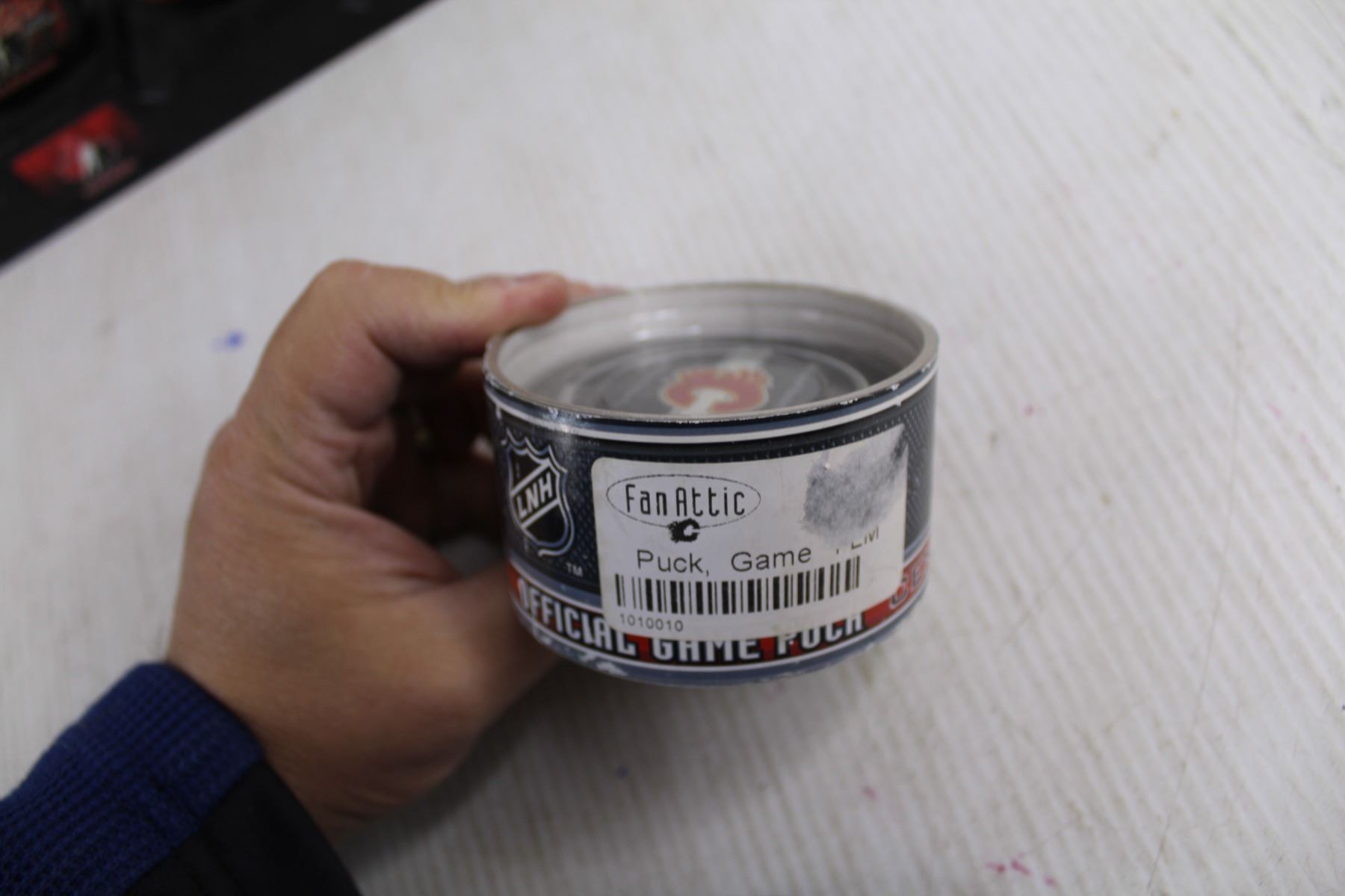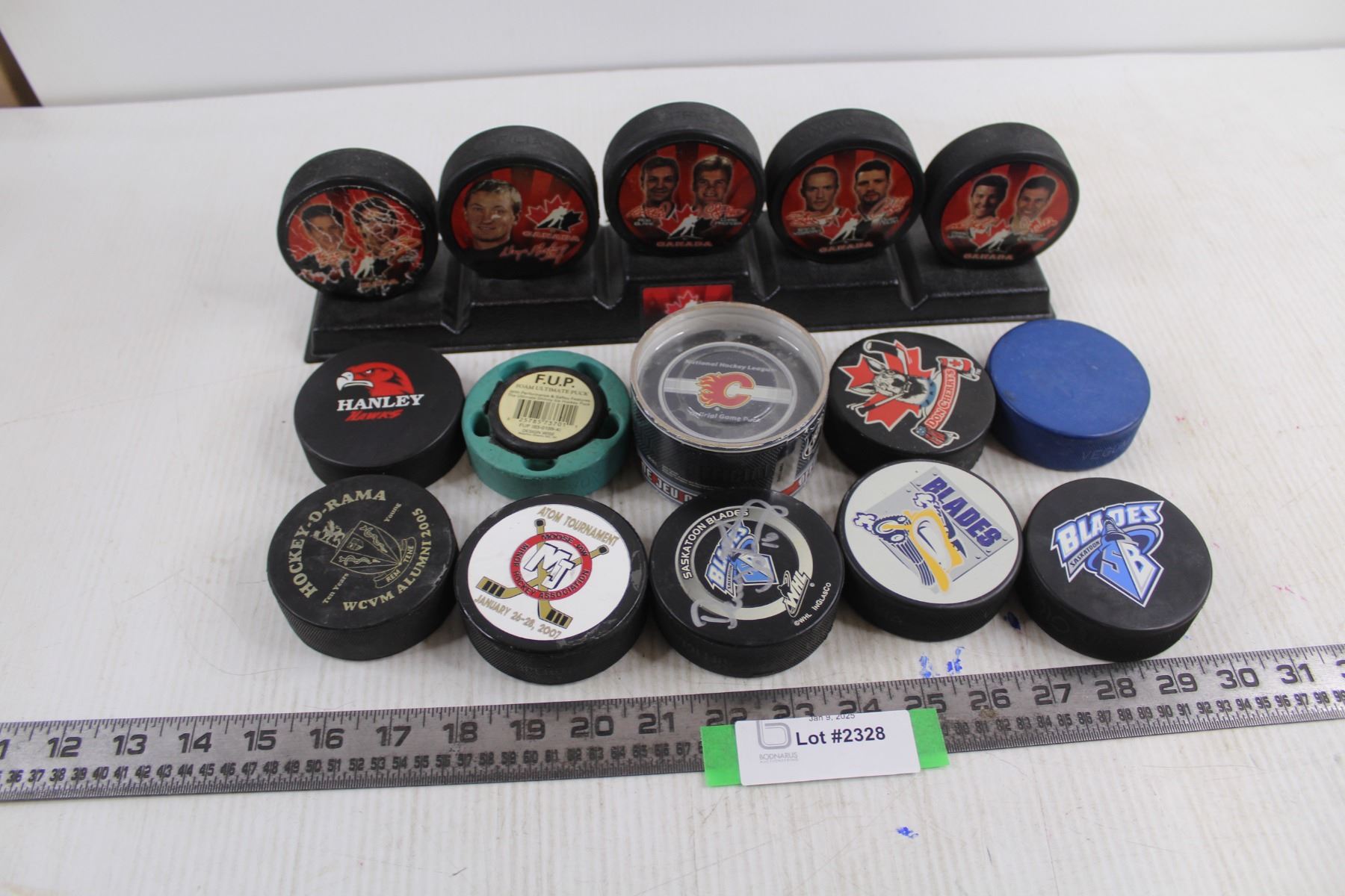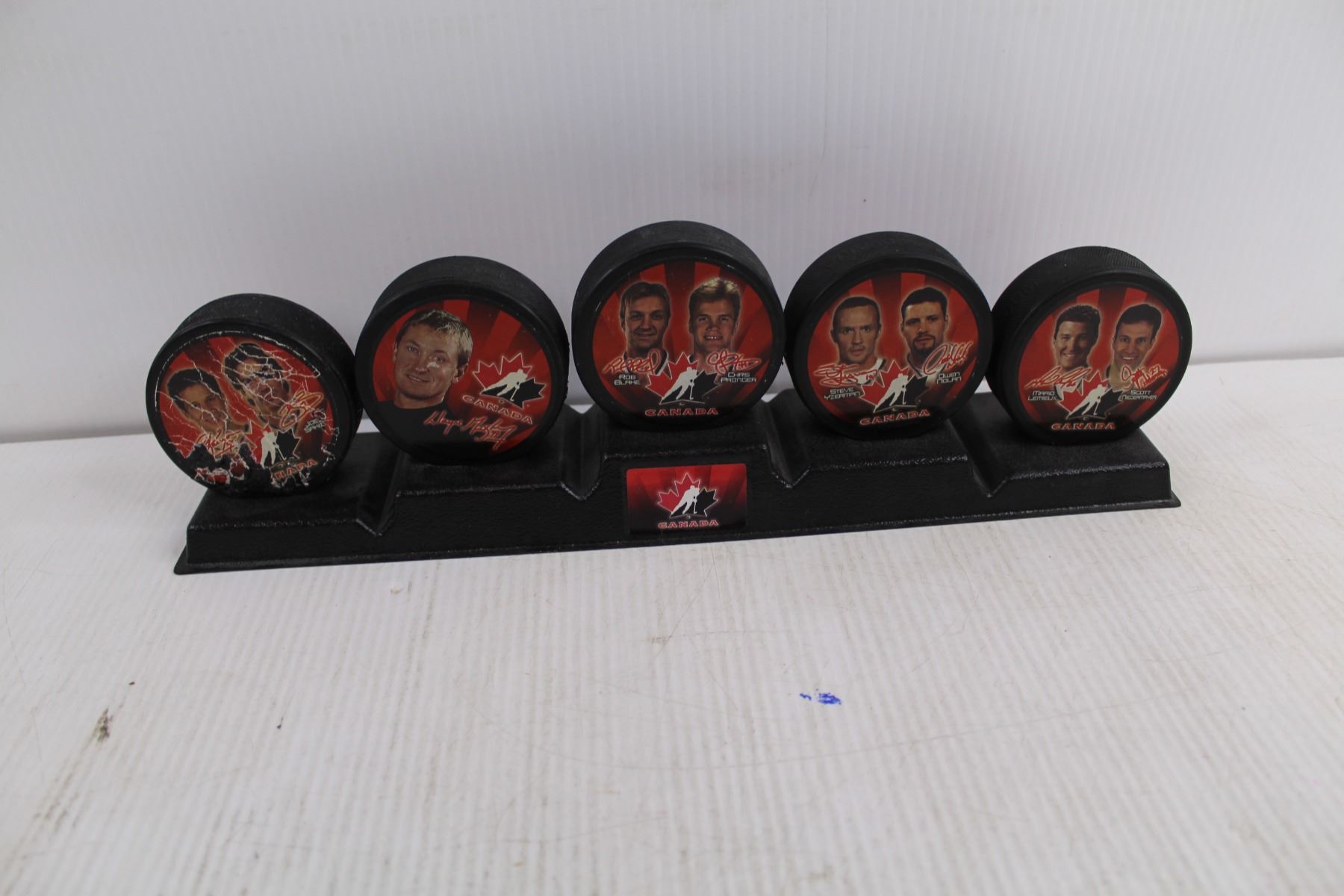 (15) Hockey Pucks (Set of 5 Team Canada with Plastic Platform, Autographed Saskatoon Blades, Official Game Puck Calgary Flames)