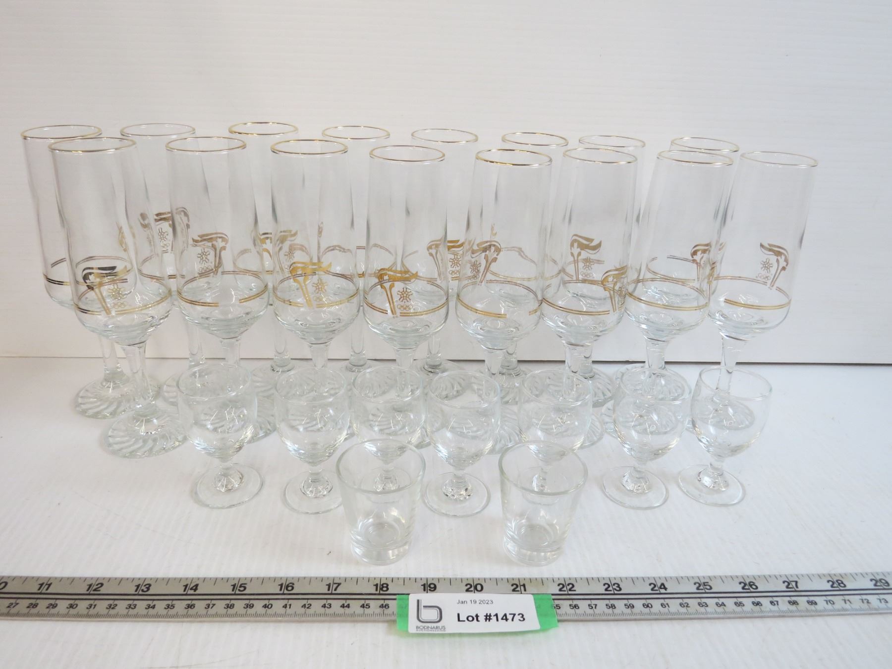 (16) Olympic Glasses - (7) Sm Glasses - (2) Shot Glasses