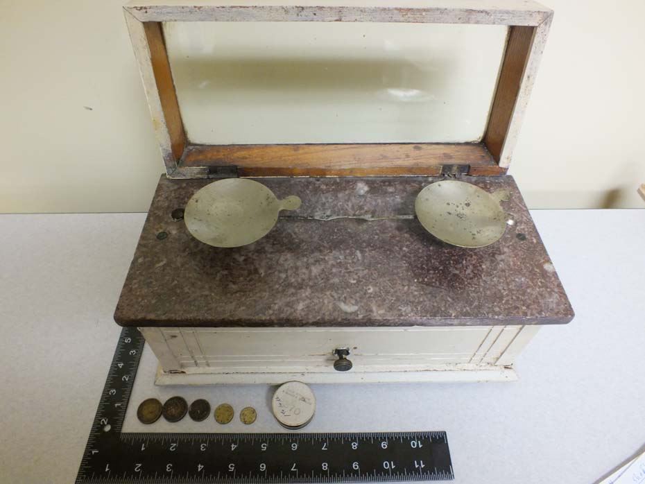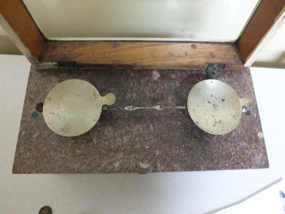 Henry Troemner Balence Scale, marble top has the dram coin weights