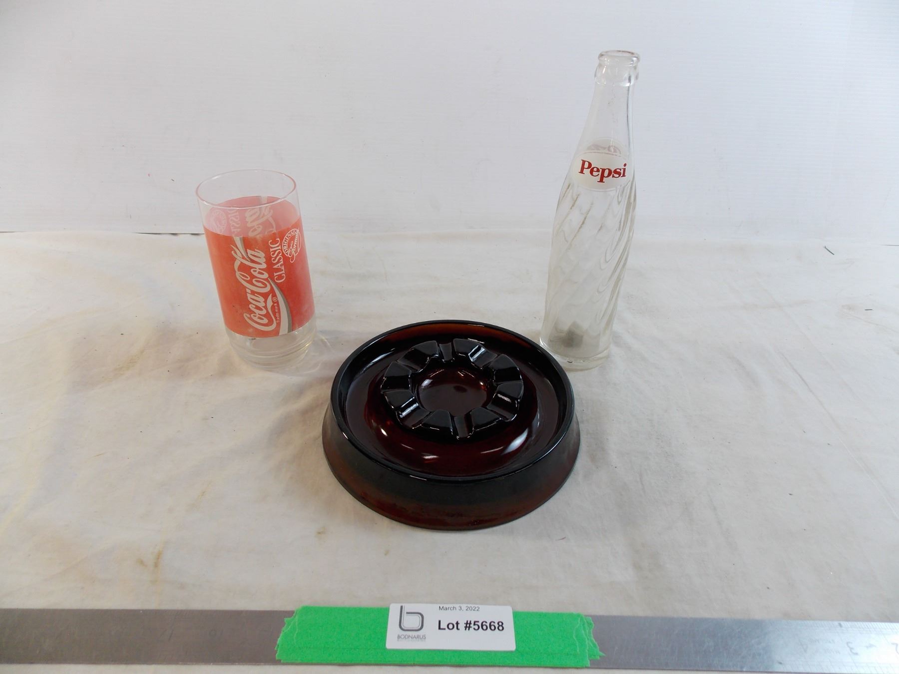 1962 Pepsi bottle, vintage Ashtray + coca cola cup