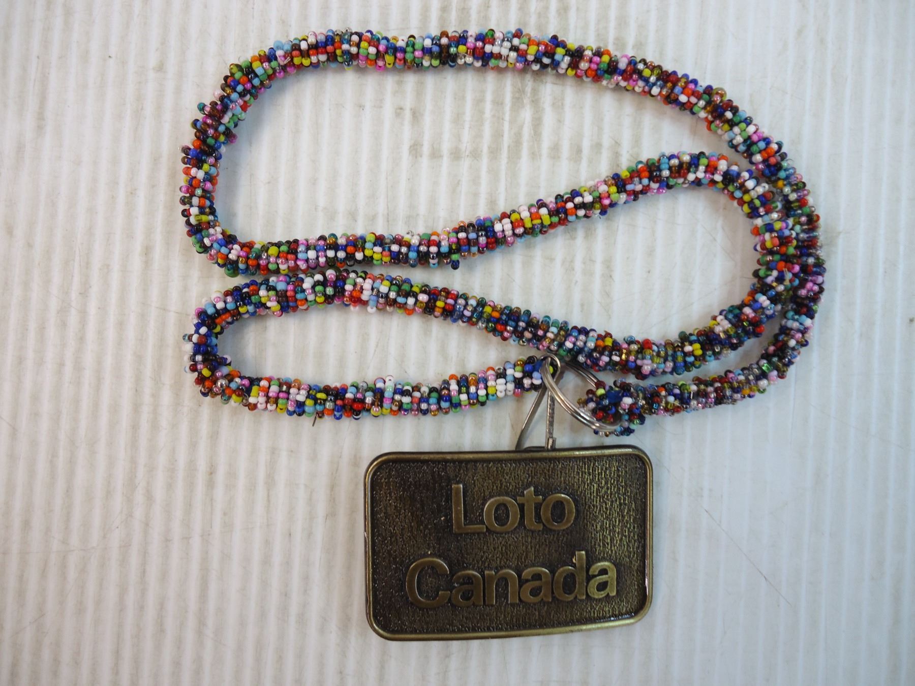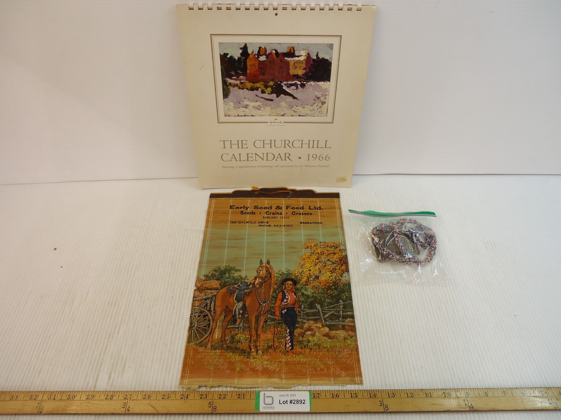 1966 Churchill Calendar, Saskatoon Advertising Wall Hanger, Lotto Canada Belt Buckle on Beaded Lanyard