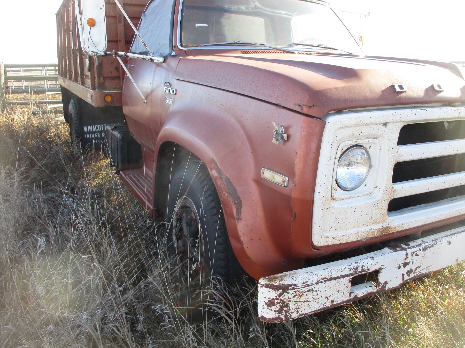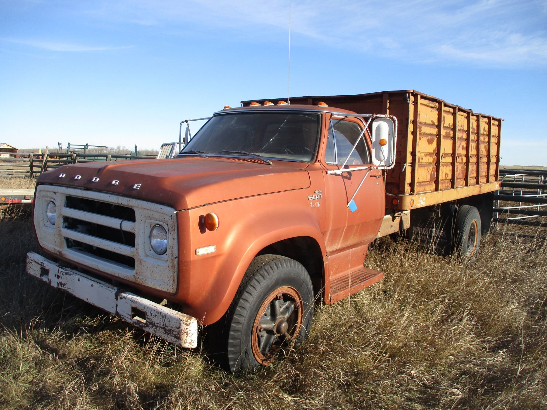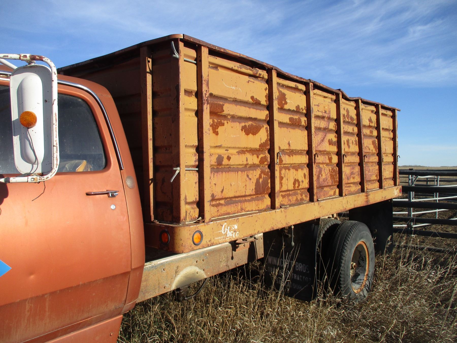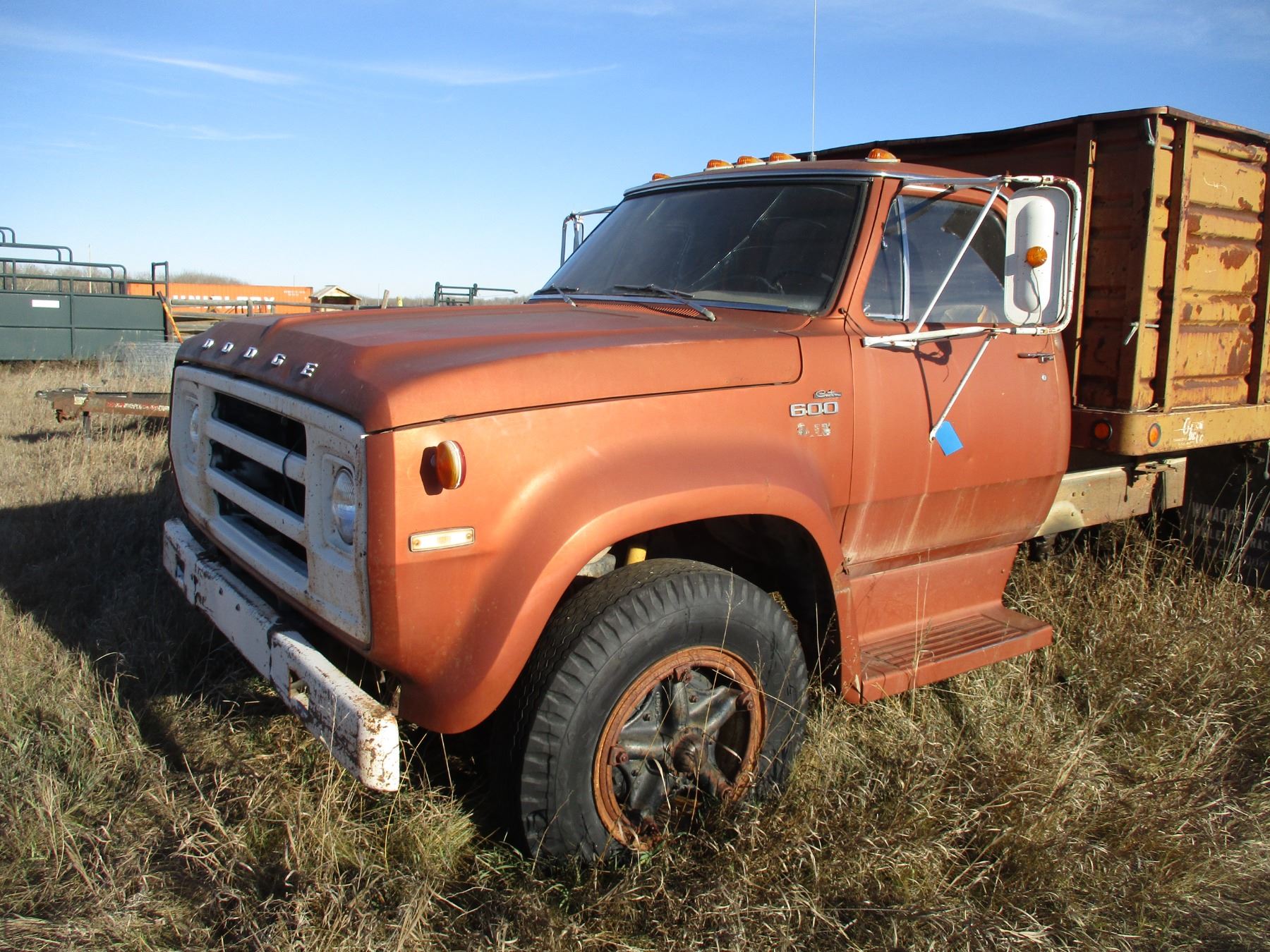 1976 Dodge 600 Grain Truck, 14 Foot Metal Box, Dual Rear Wheels, 71,500 Miles, 2 Speed Axle, Running, Single Ram Hoist, Missing Passenger Side Window, Serial Number D61FL4J005558
