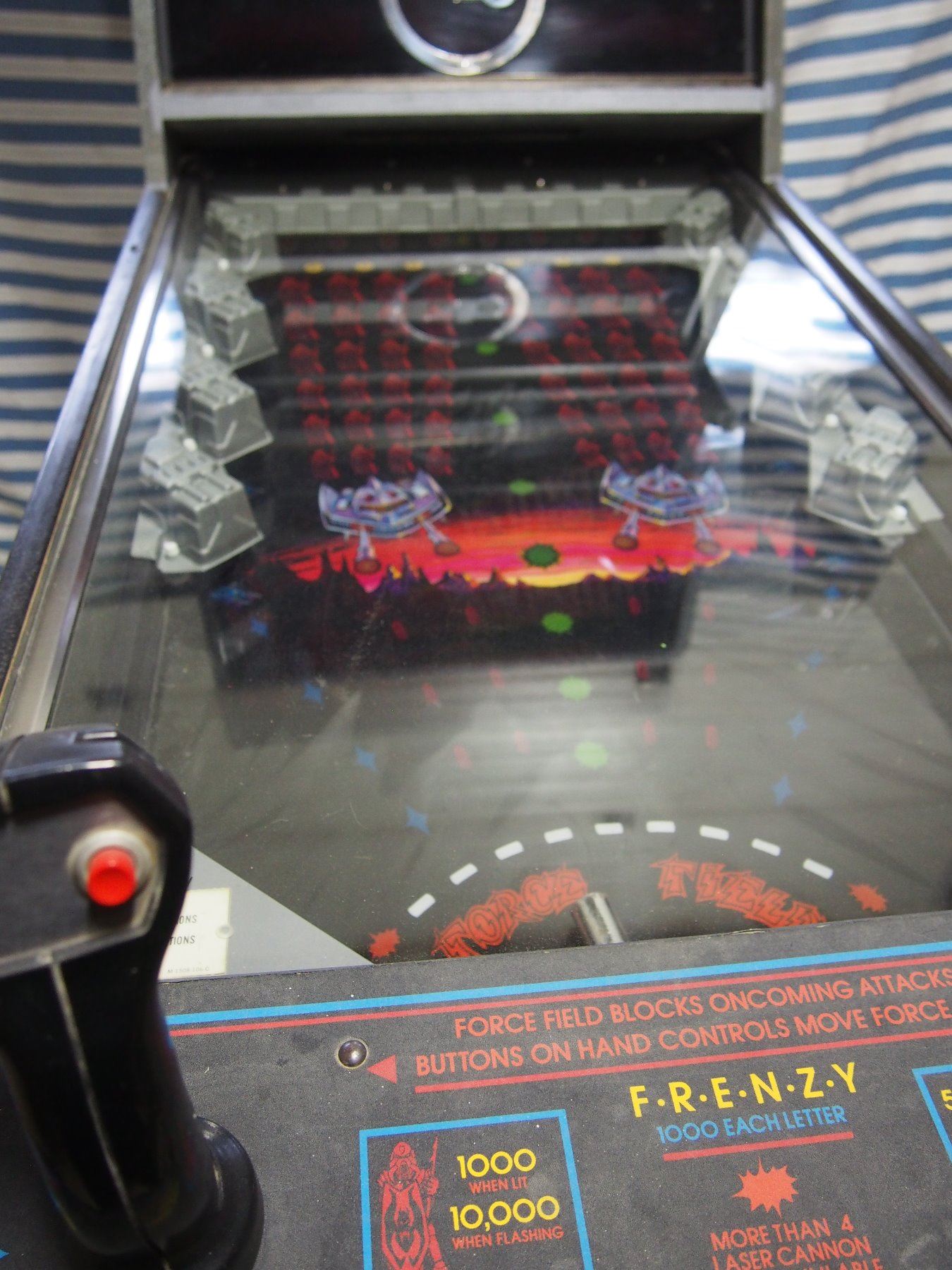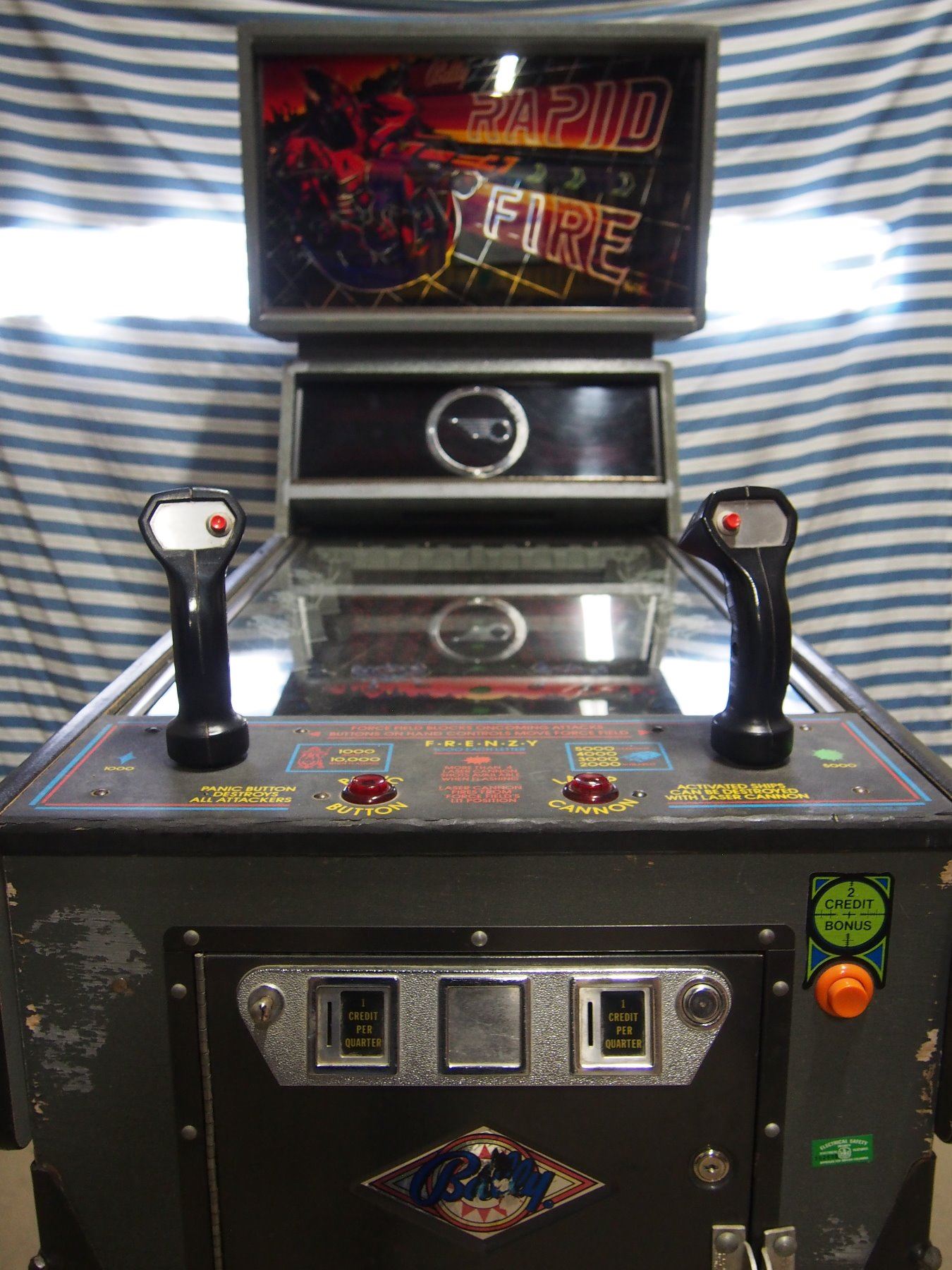 You control a swivel cannon that shoots 1/2" steel balls at advancing alien invaders who approach from the front and sides. The Rapid Fire Cannon shoots about 100-140 balls per minute.