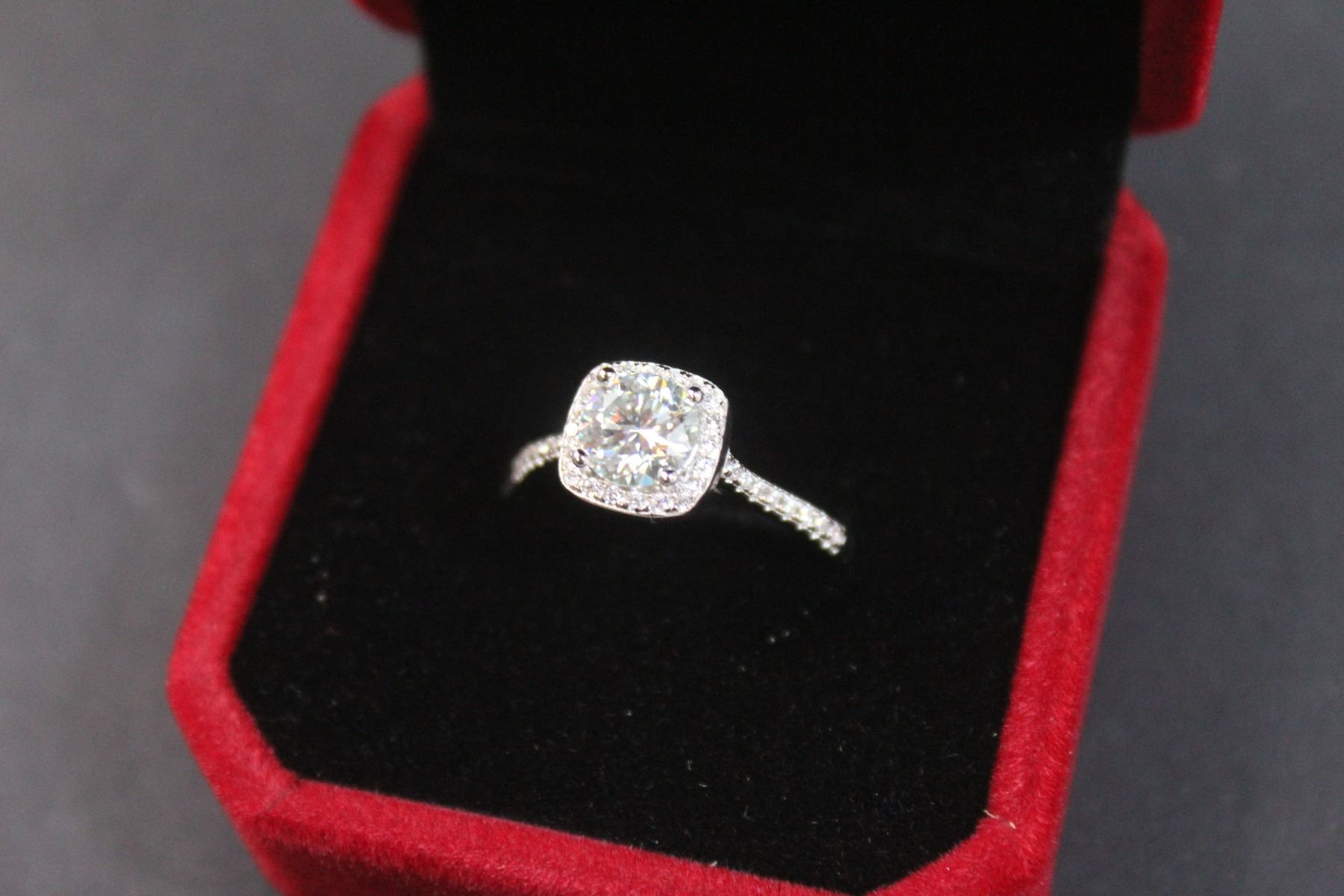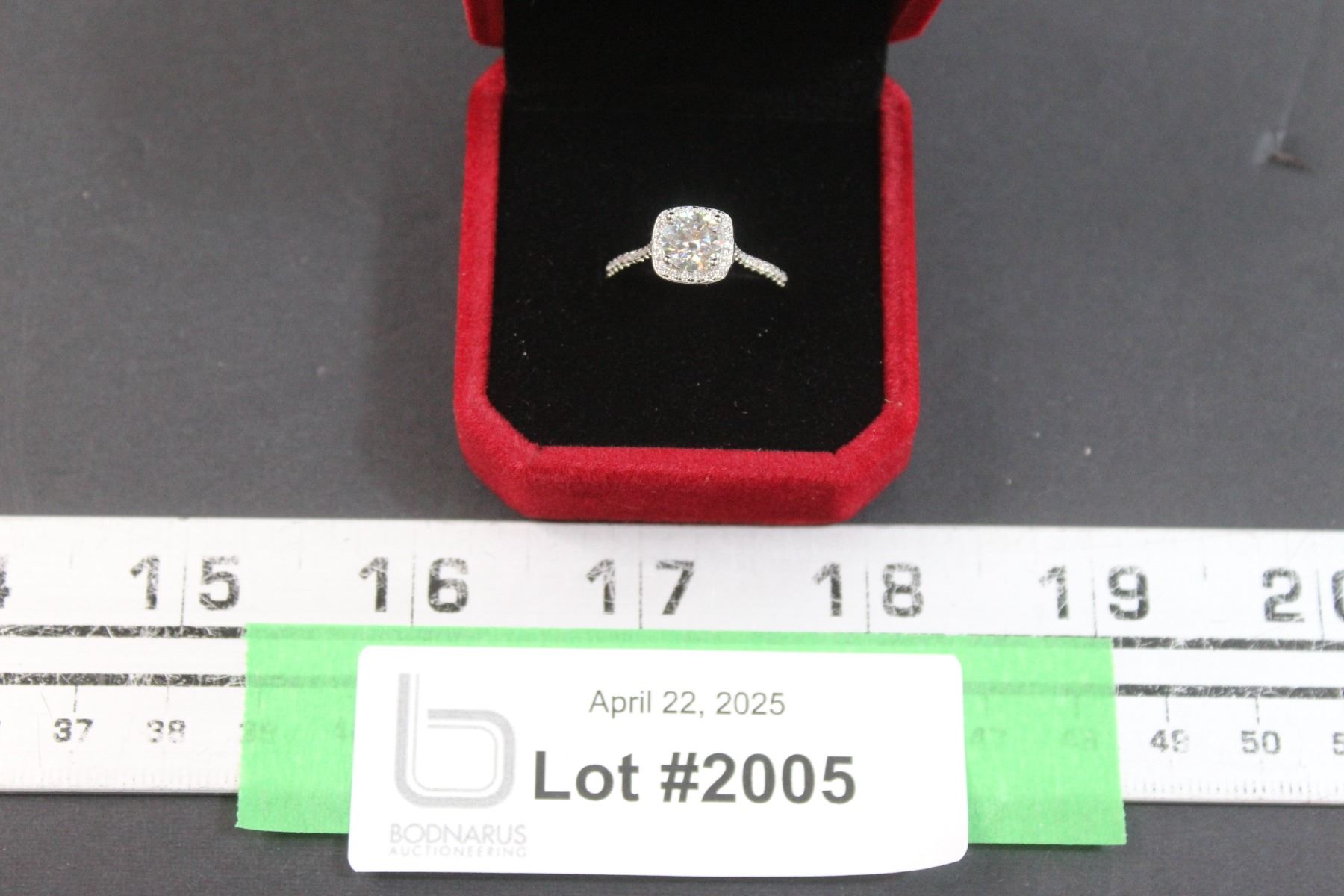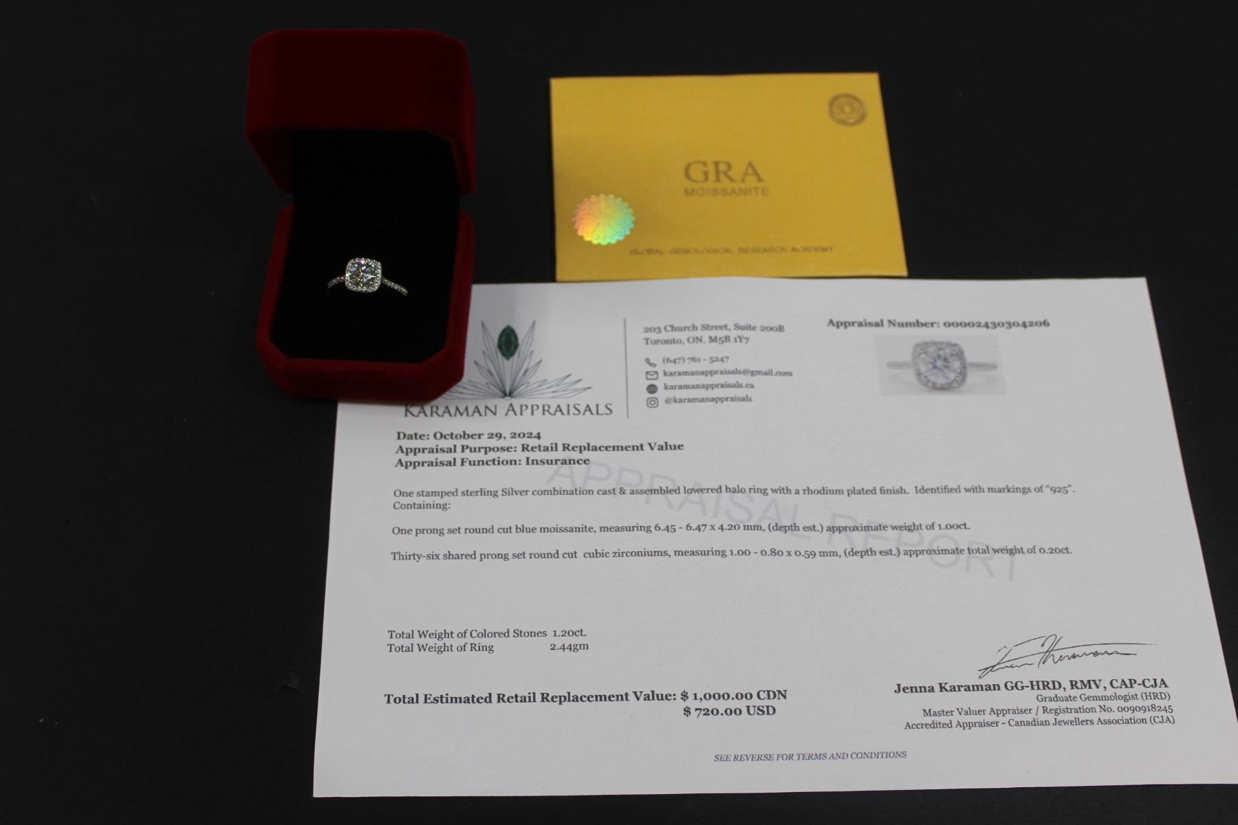 ^ 1ct. GRA Certified Round Brilliant Cut Moissanite Stone VVS D Color w/(36) Rounf Brilliant Cut Cubic Zirconia Set in Square Halo Set in Sterling Silver - Ring Size 6.5