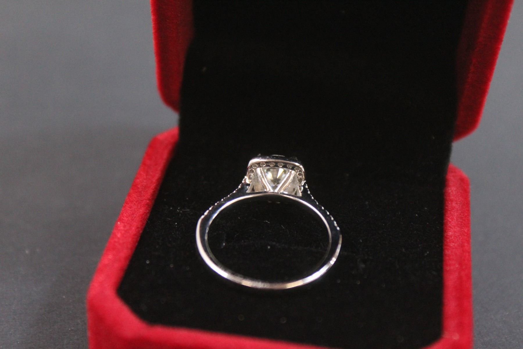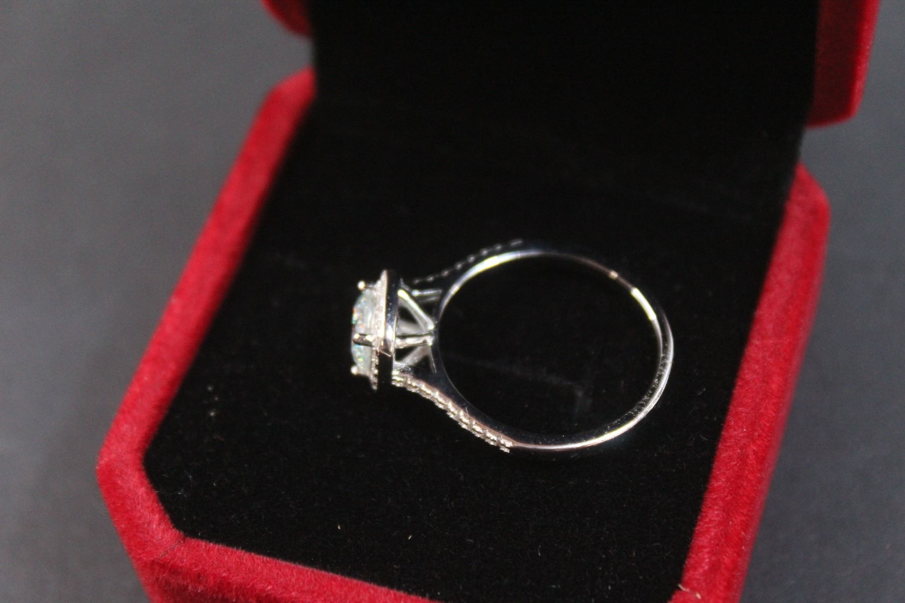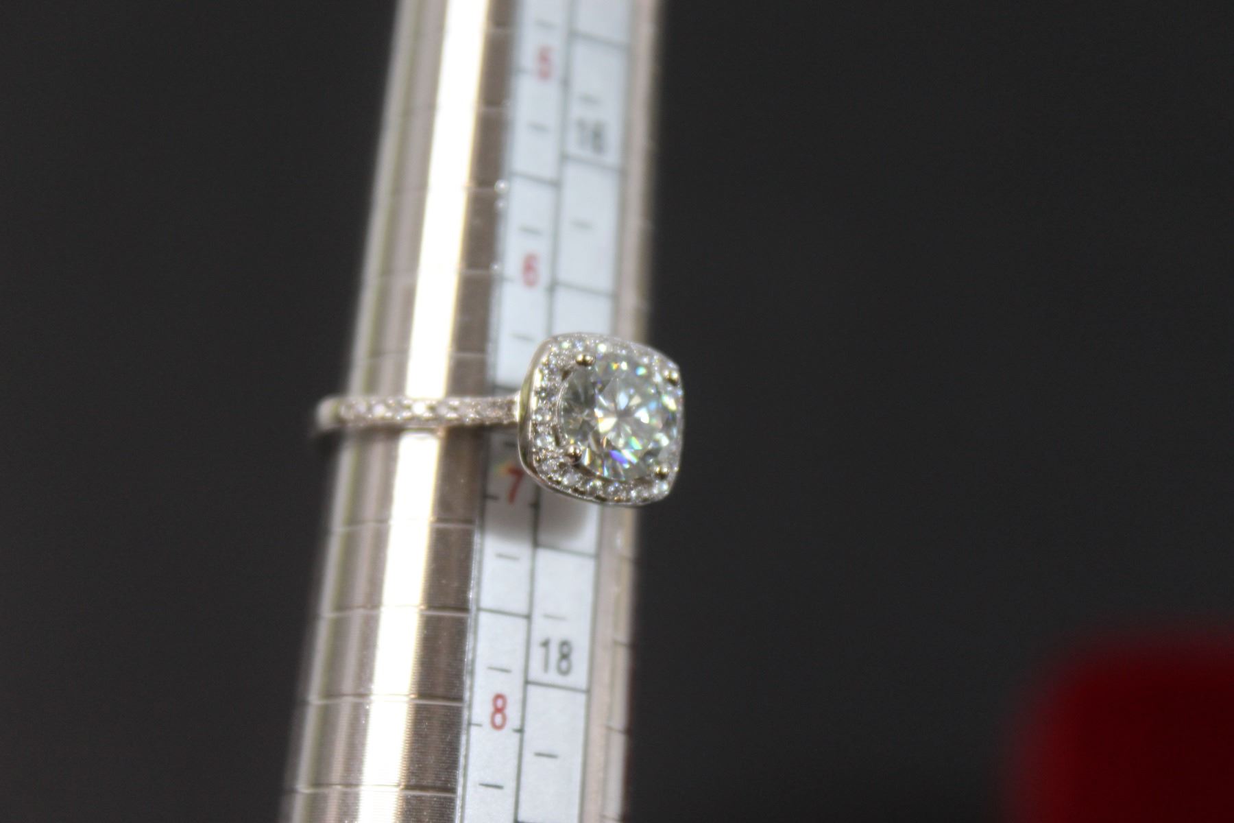 ^ 1ct. GRA Certified Round Brilliant Cut Moissanite Stone VVS D Color w/(36) Rounf Brilliant Cut Cubic Zirconia Set in Square Halo Set in Sterling Silver - Ring Size 6.5