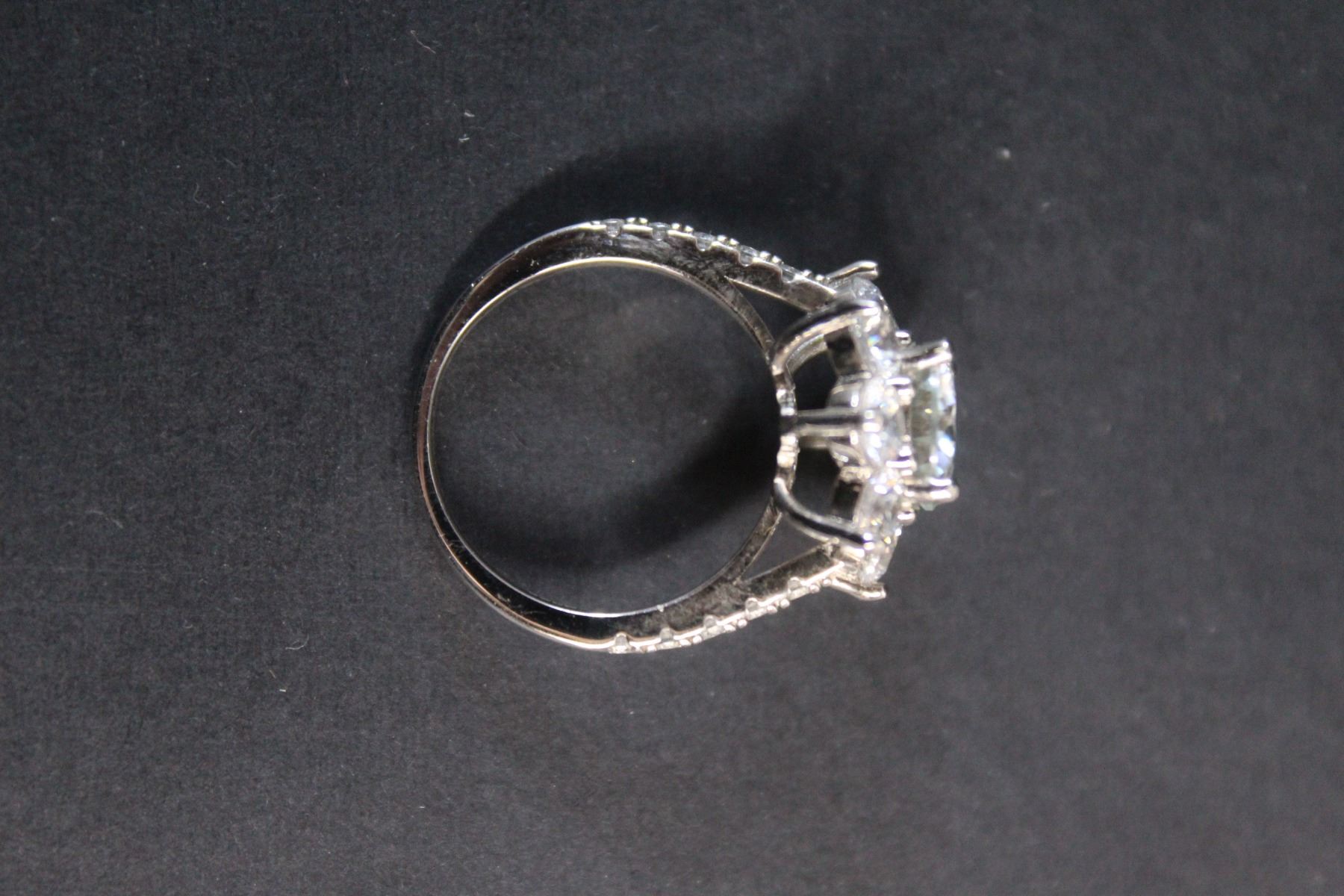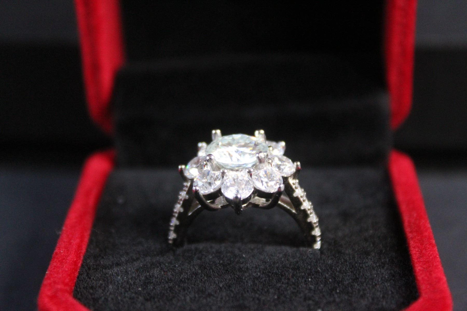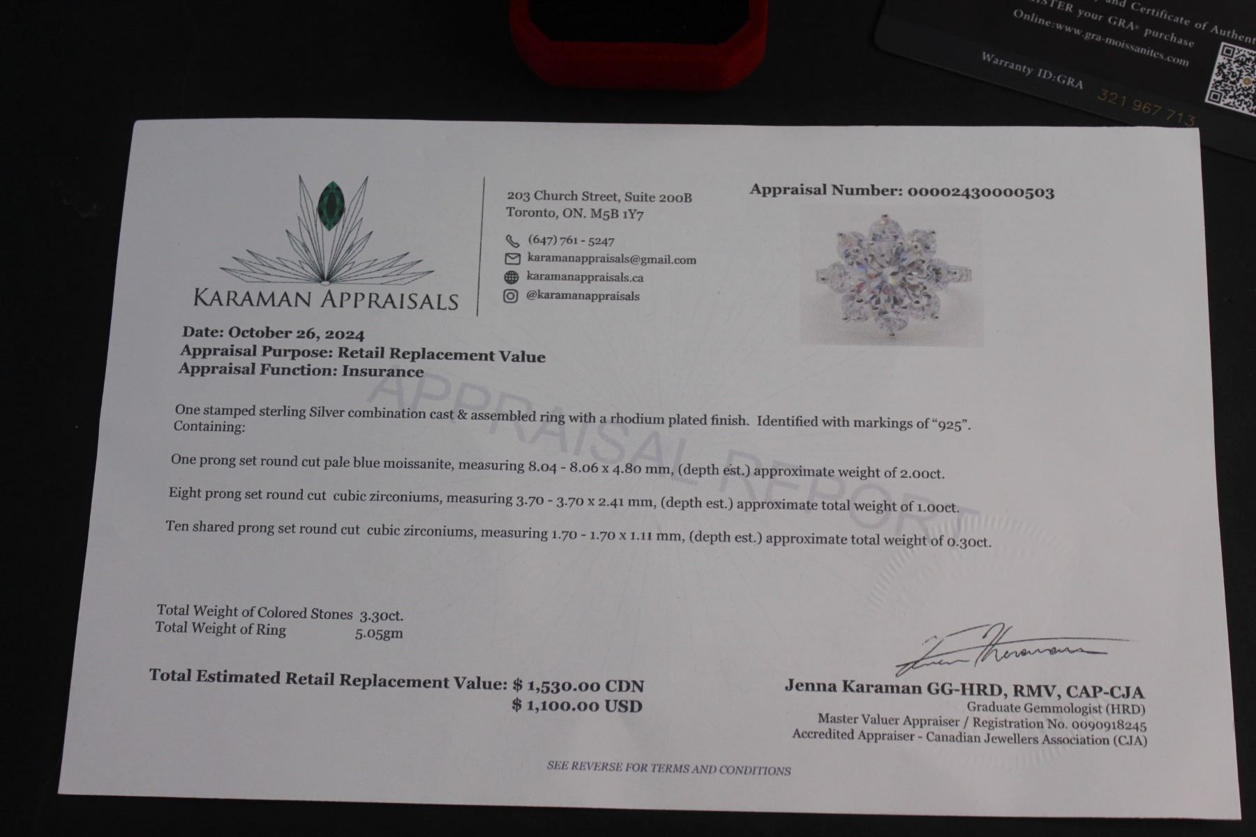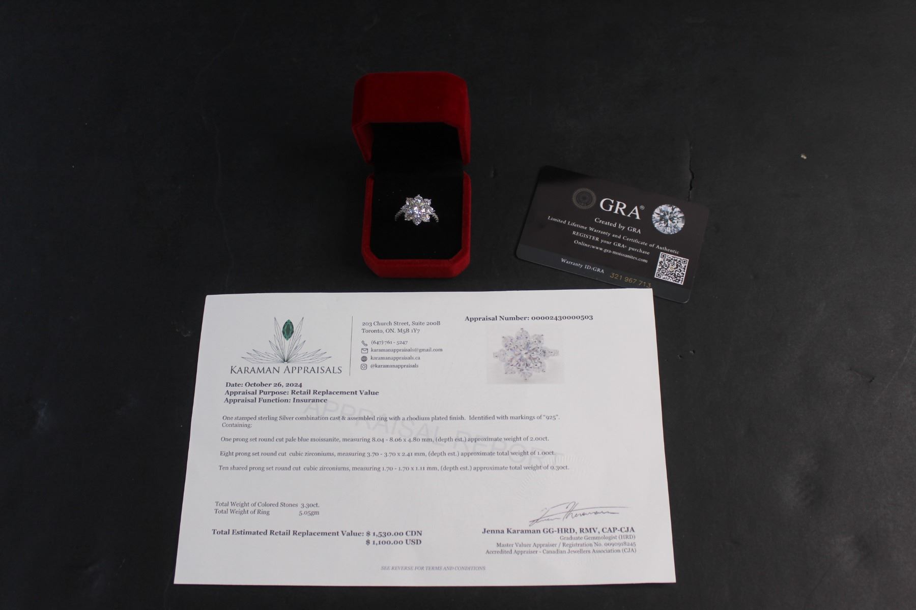^2.00 CT GRA Certified Round Brilliant Cut Moissanite VVS D Color with 8 Round Cut Cubic Zirconium Set Around The Center Weighing a Total 1.00 CT with 10 Round Cut CZ's in Shank Weighing Total 0.30 CT Set in 925 Silver Ring - Size 6 - Retail Value $1530