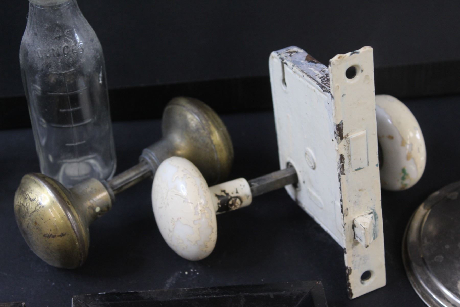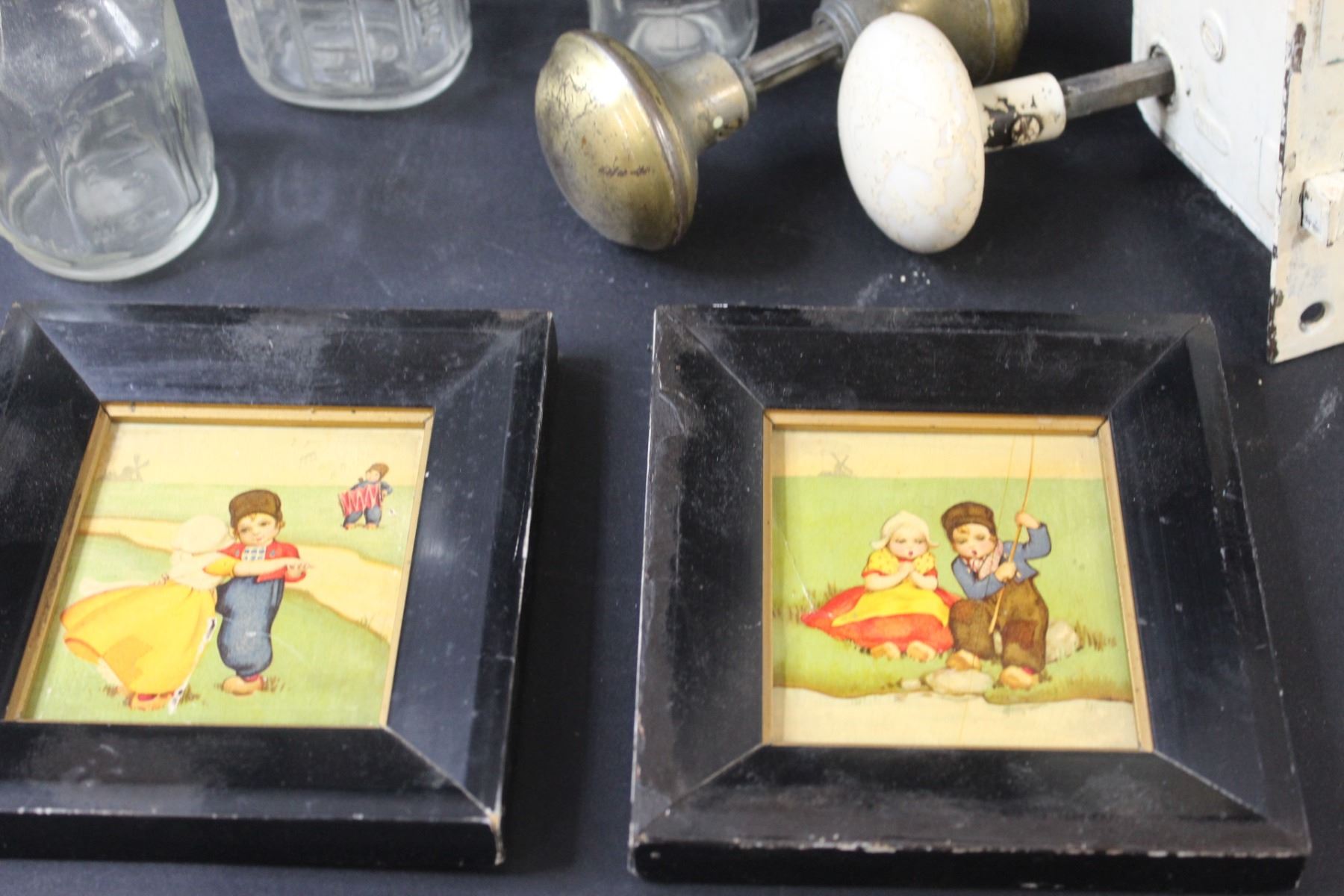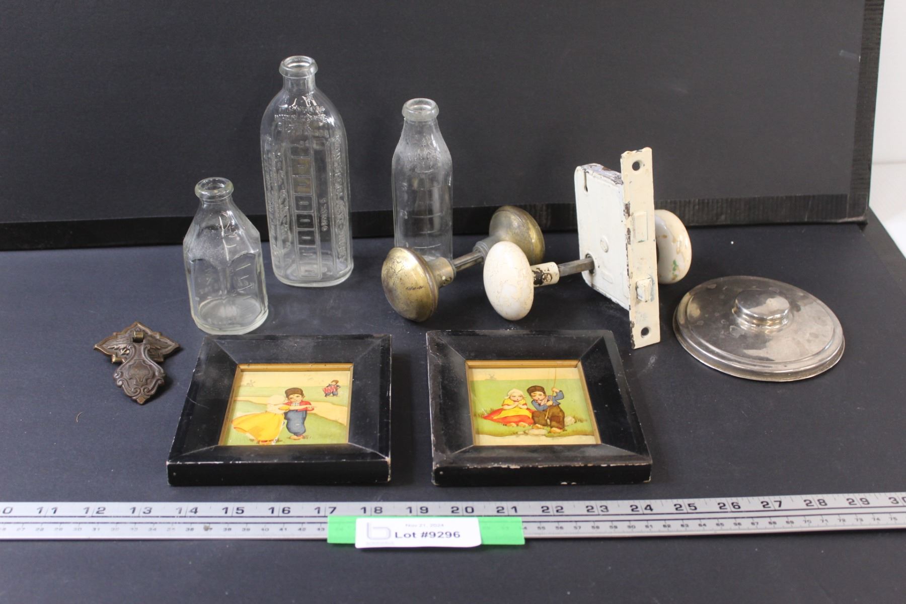 (2) Antique Door Knob Sets, (3) Medicinal Clear Glass Jars, (2) Dutch Vintage Pictures, Antique Drop Handle Knob, Metal Canister Lid - 4.5" Diameter