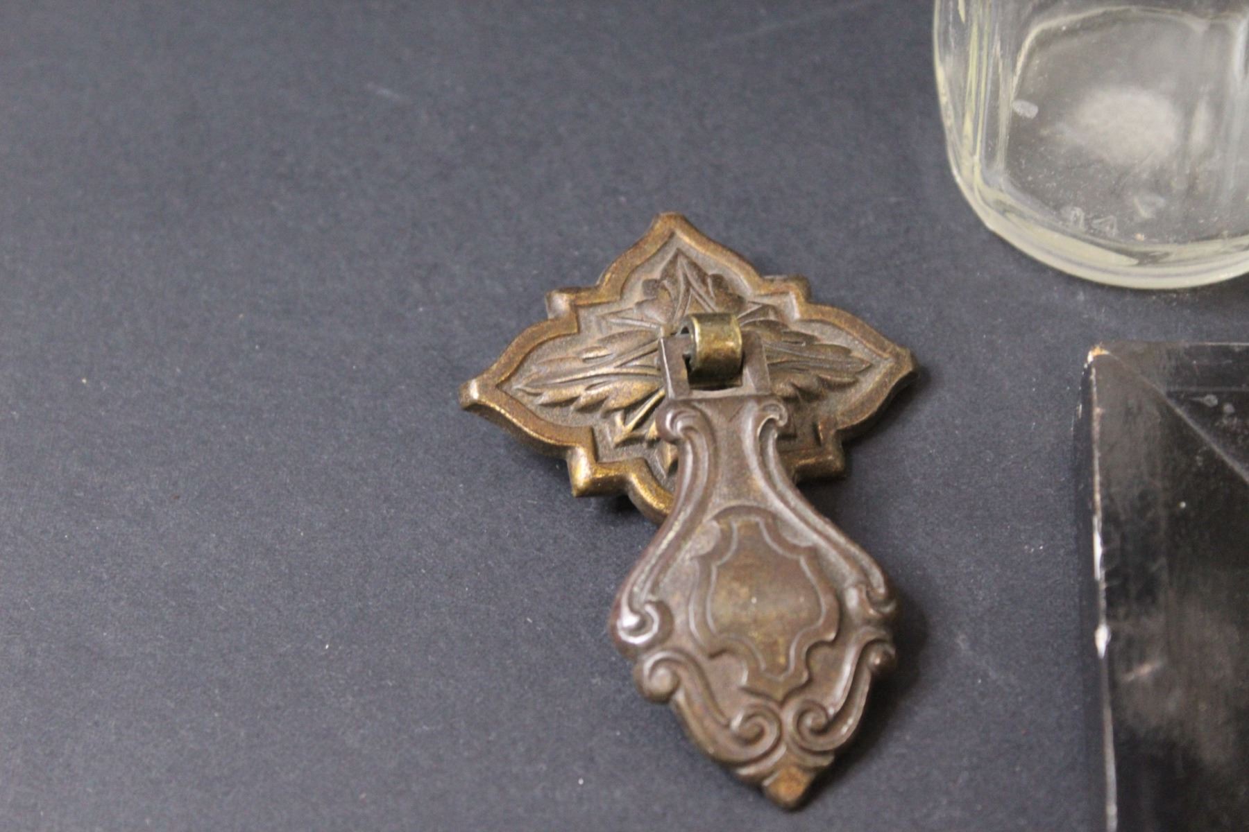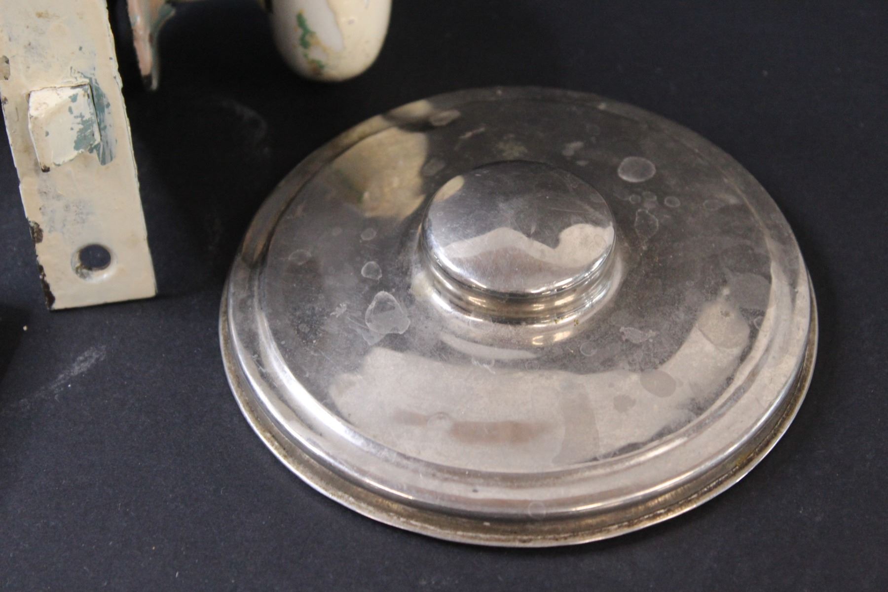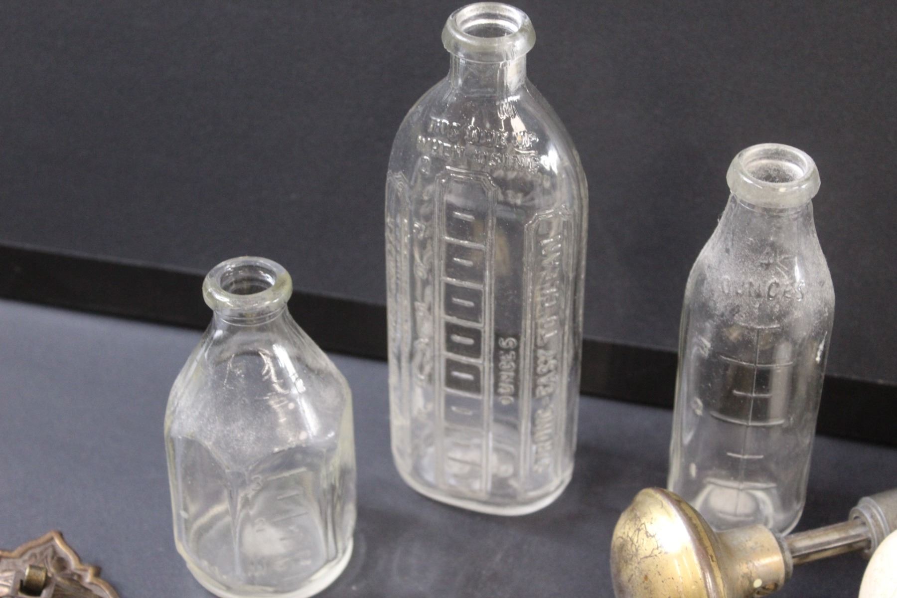 (2) Antique Door Knob Sets, (3) Medicinal Clear Glass Jars, (2) Dutch Vintage Pictures, Antique Drop Handle Knob, Metal Canister Lid - 4.5" Diameter