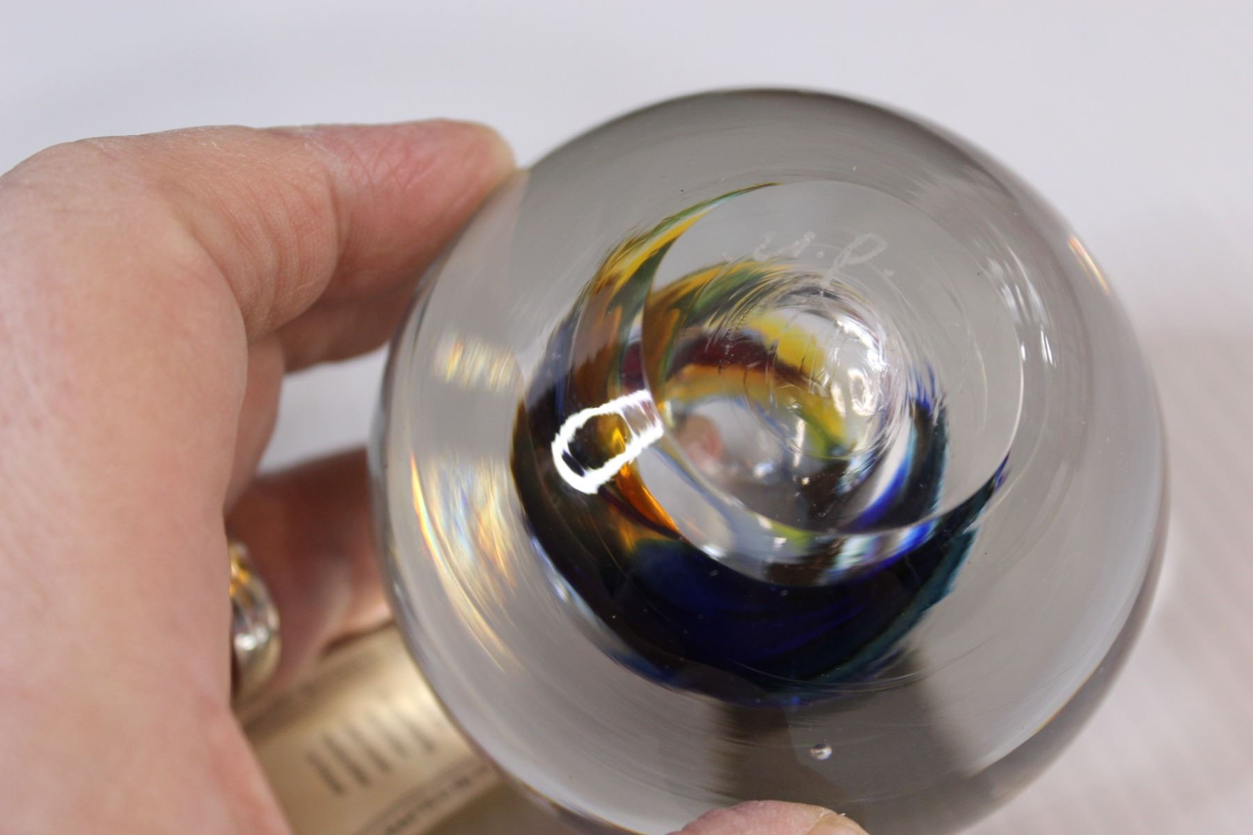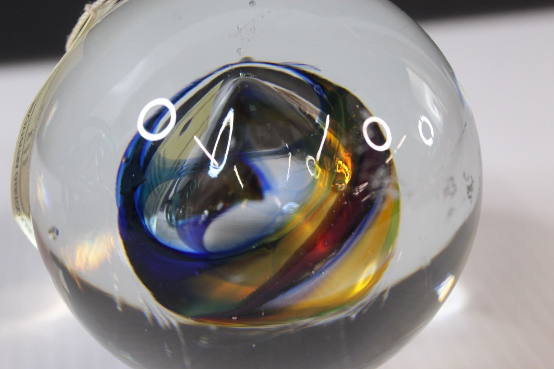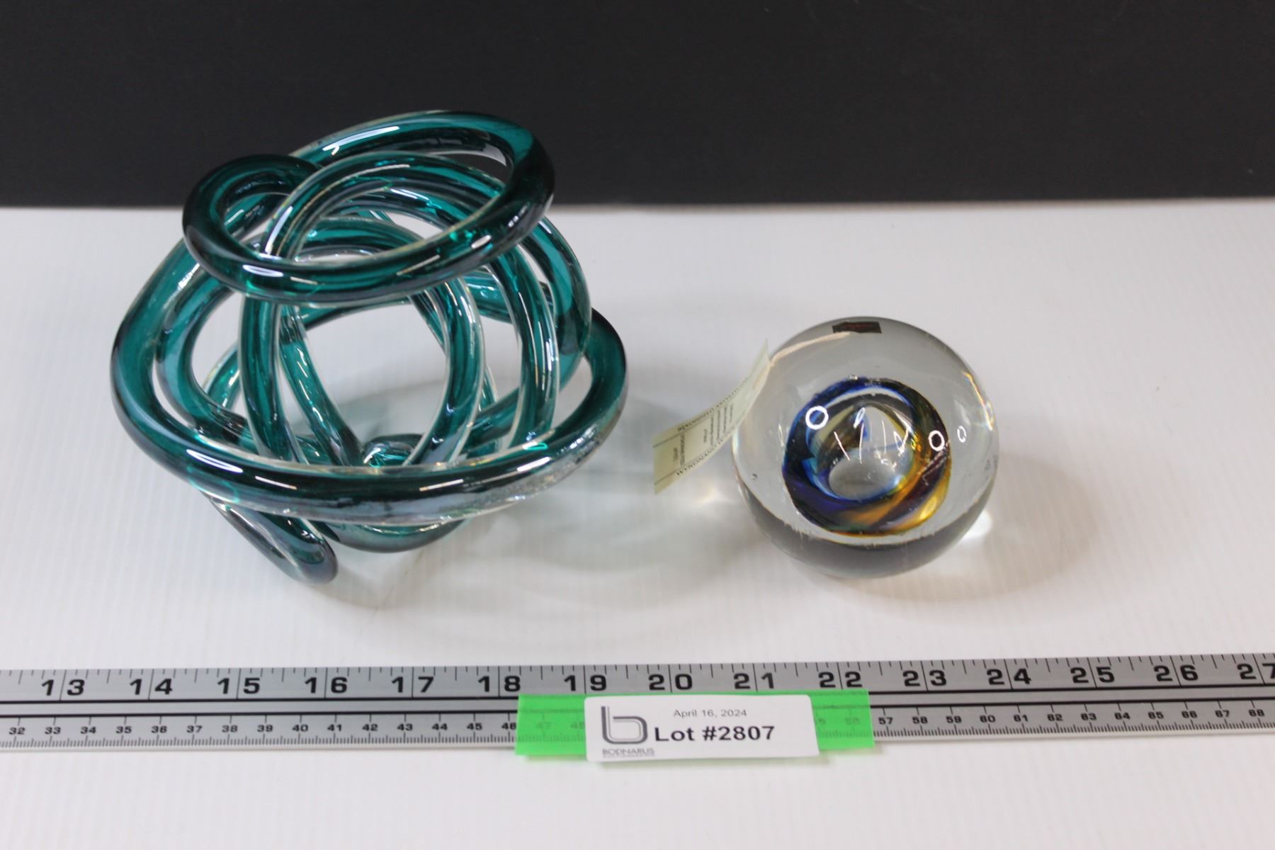 (2) Art Glass: Glass Tube Art Ornament - 5" x 6"; Cat's Eye Marble Paper weight Artist Signed