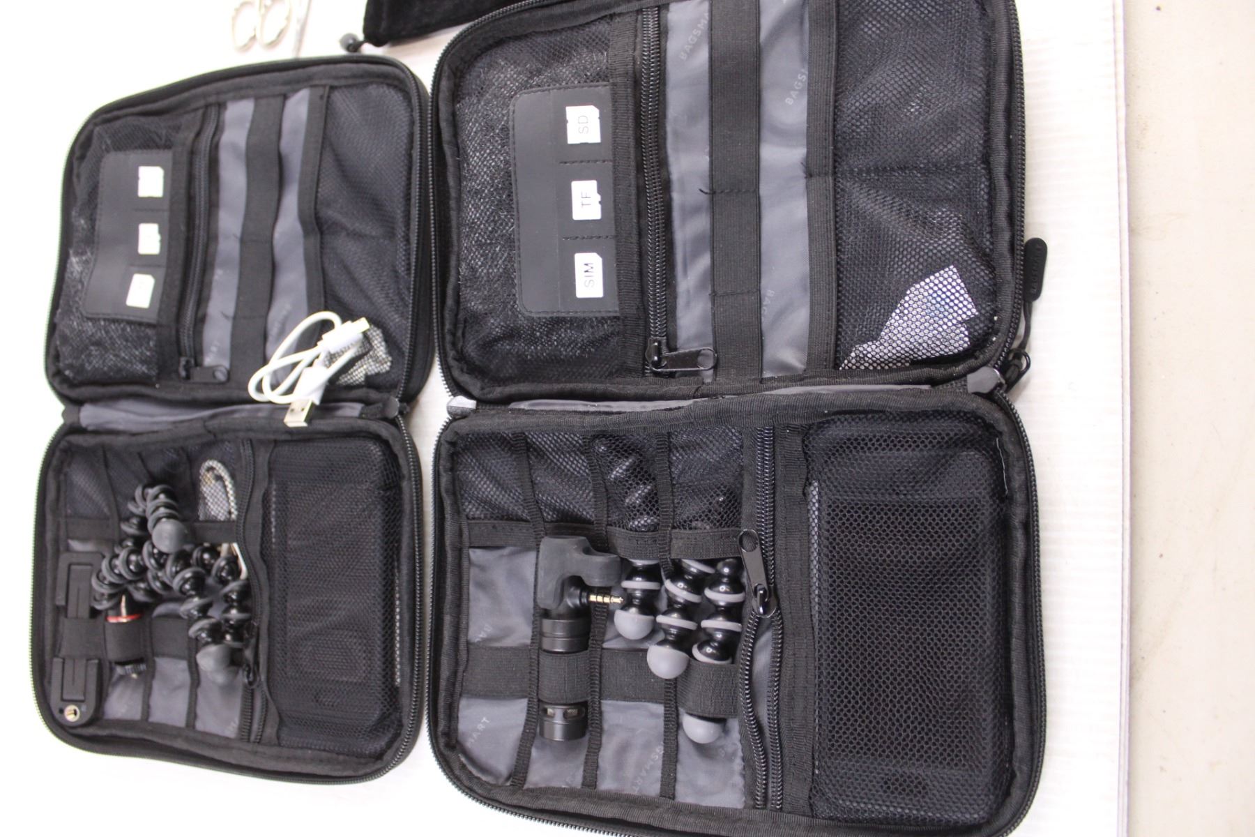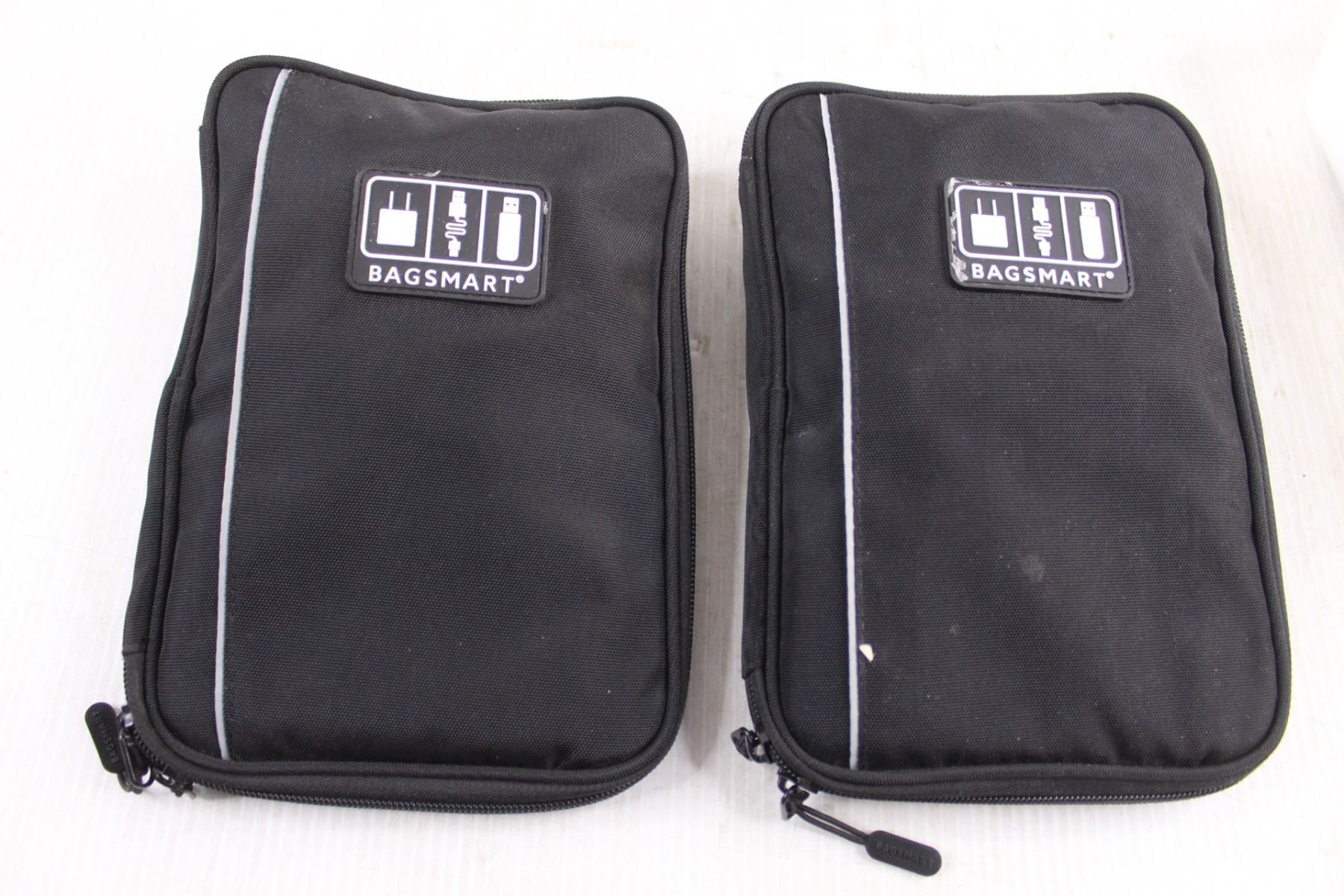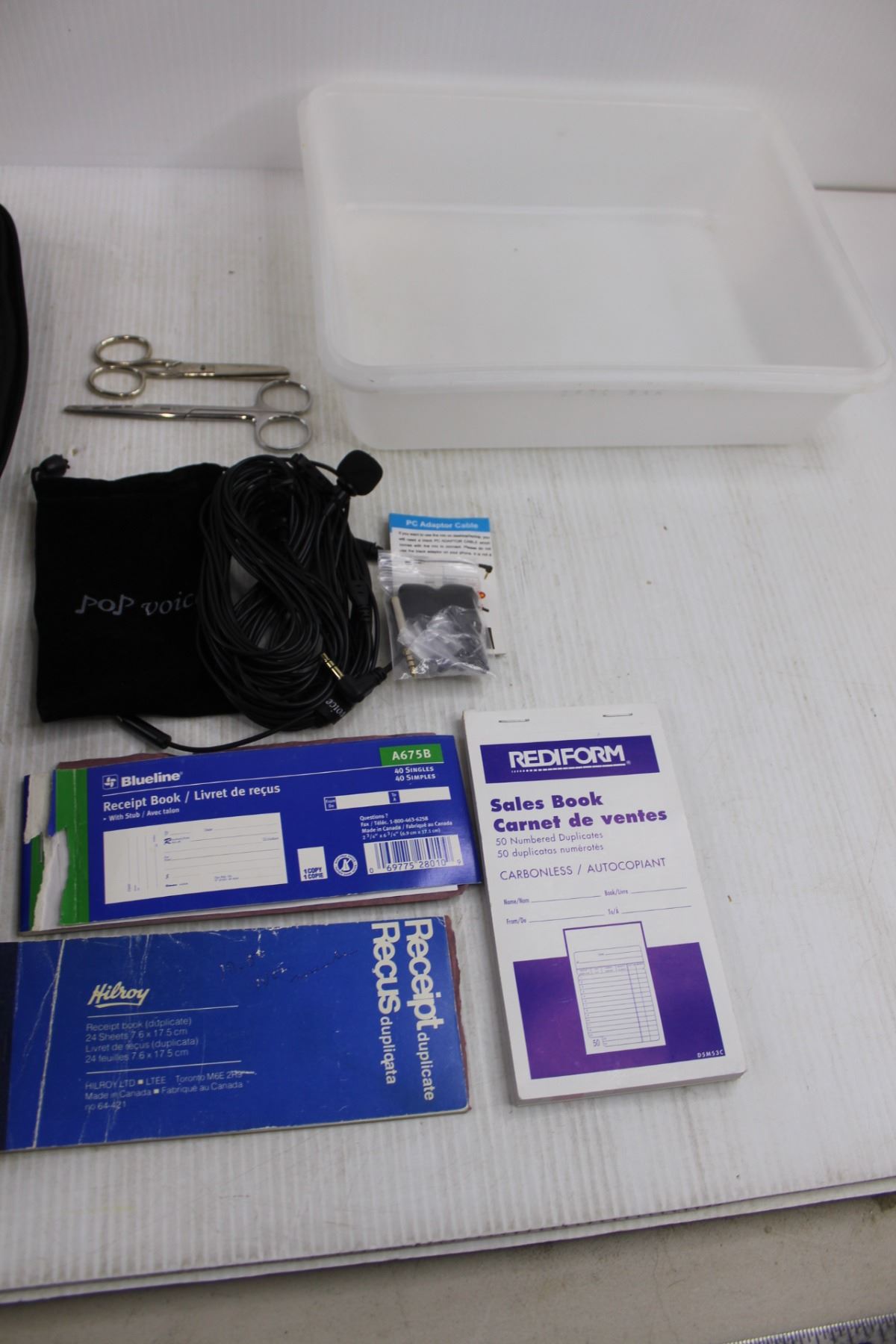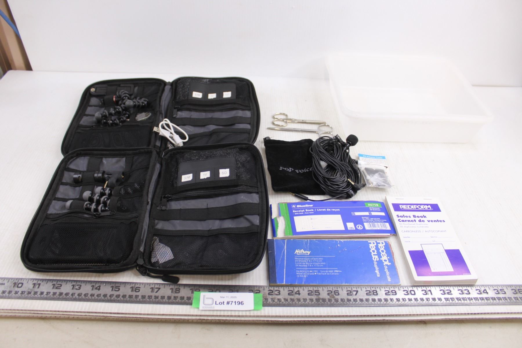(2) Bagsmart Tote for Electronics with Contents, Pop Voice Mics, Receipt Books , Scissors, Tray