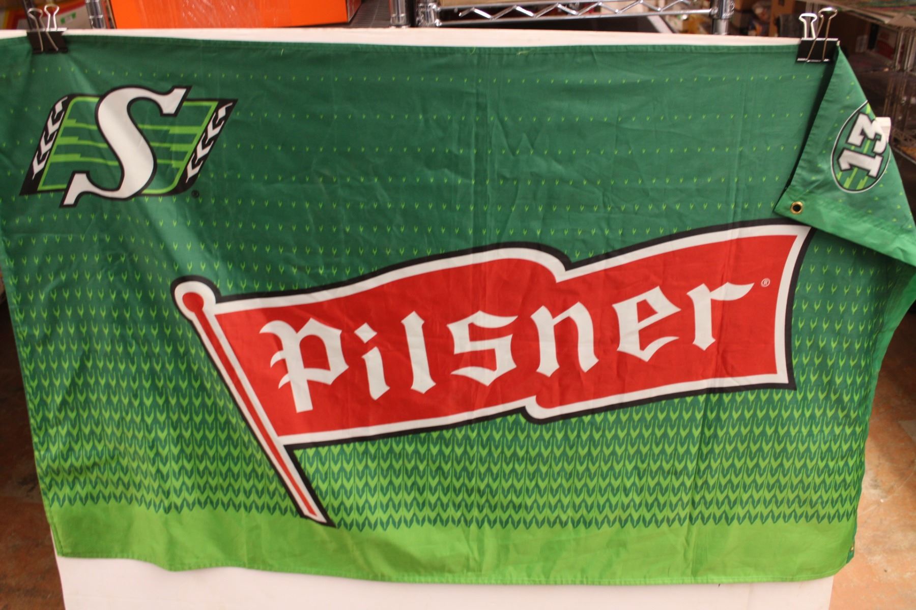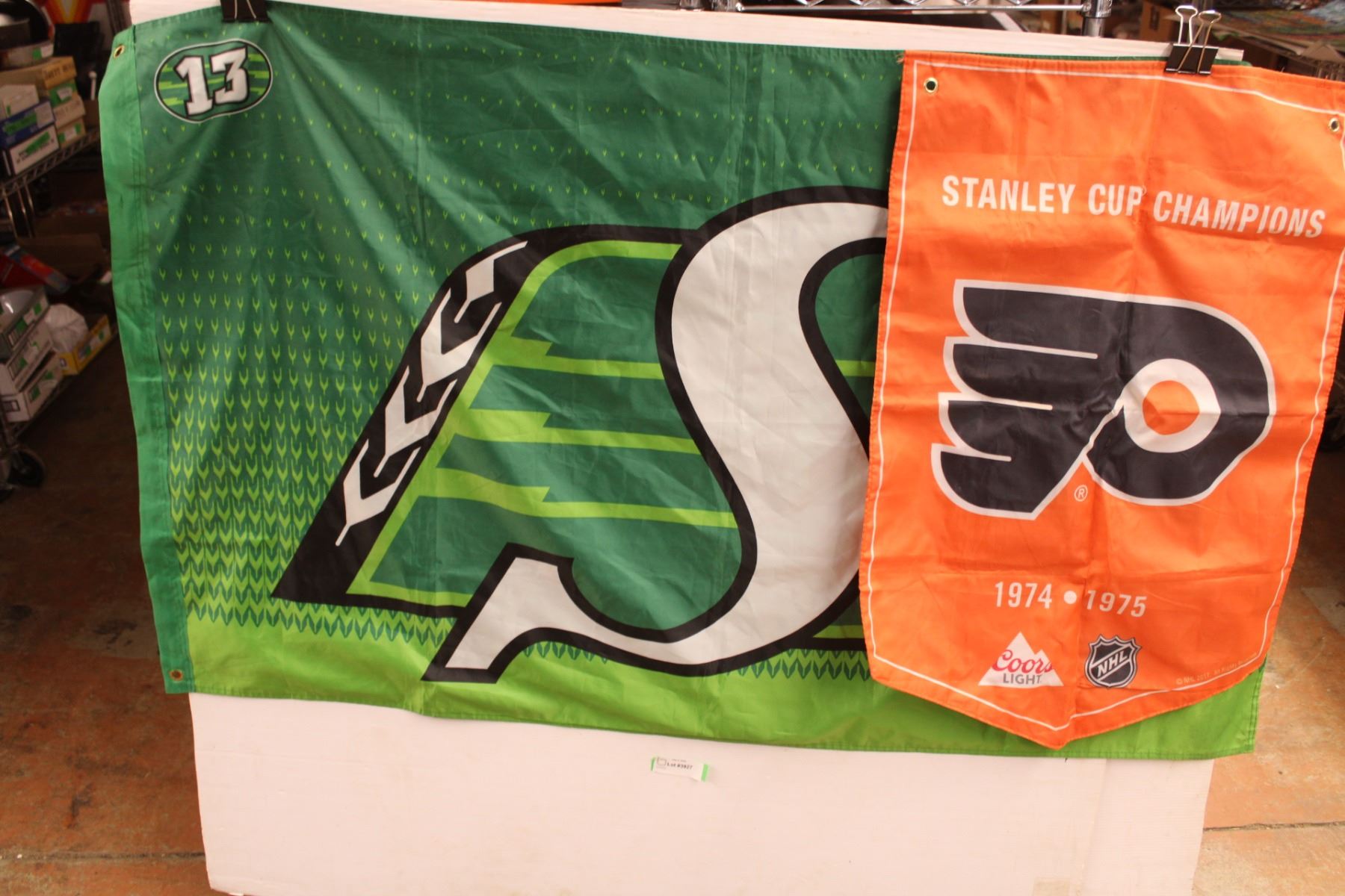 (2) Banners (Saskatchewan Roughriders/Pilsner 5' x 3', Philadelphia Flyers 1974-75 Stanley Cup Champions 33" x 23")