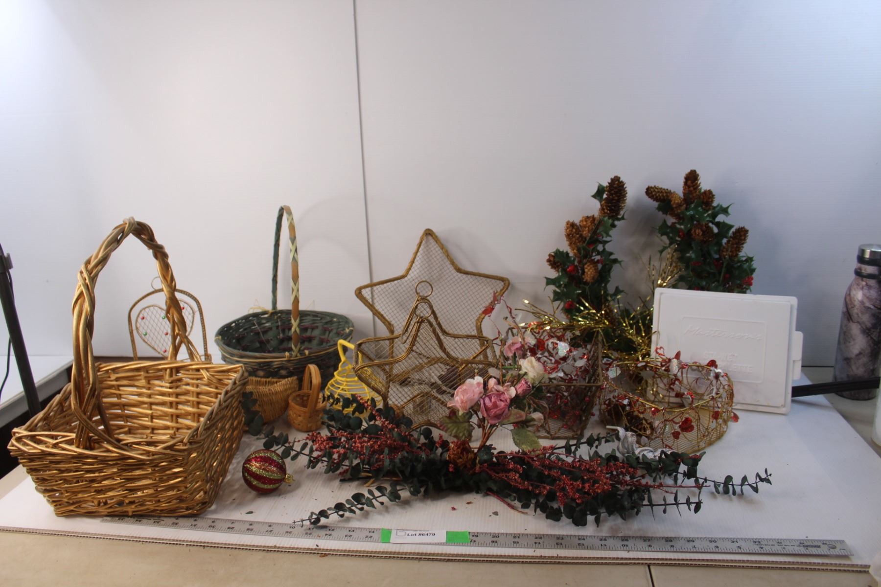 (2) Baskets, Wreath, Christmas Ornaments, Misc.