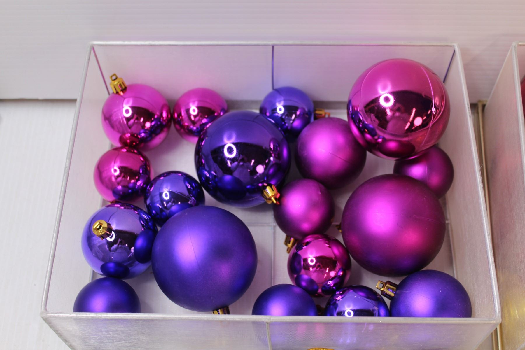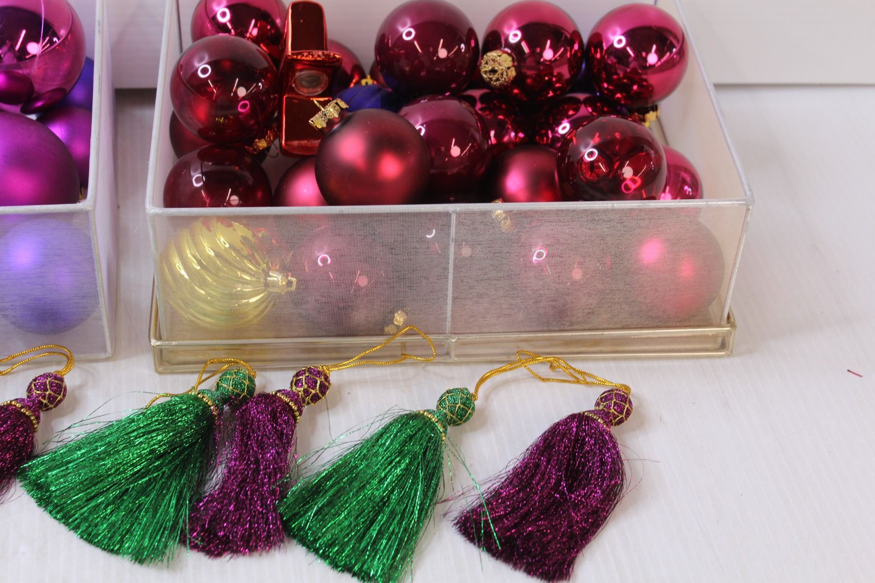 (2) Baskets of Plastic & Glass Purple, Pink, Red Christmas Ornaments, (8) Purple & Green Tassels