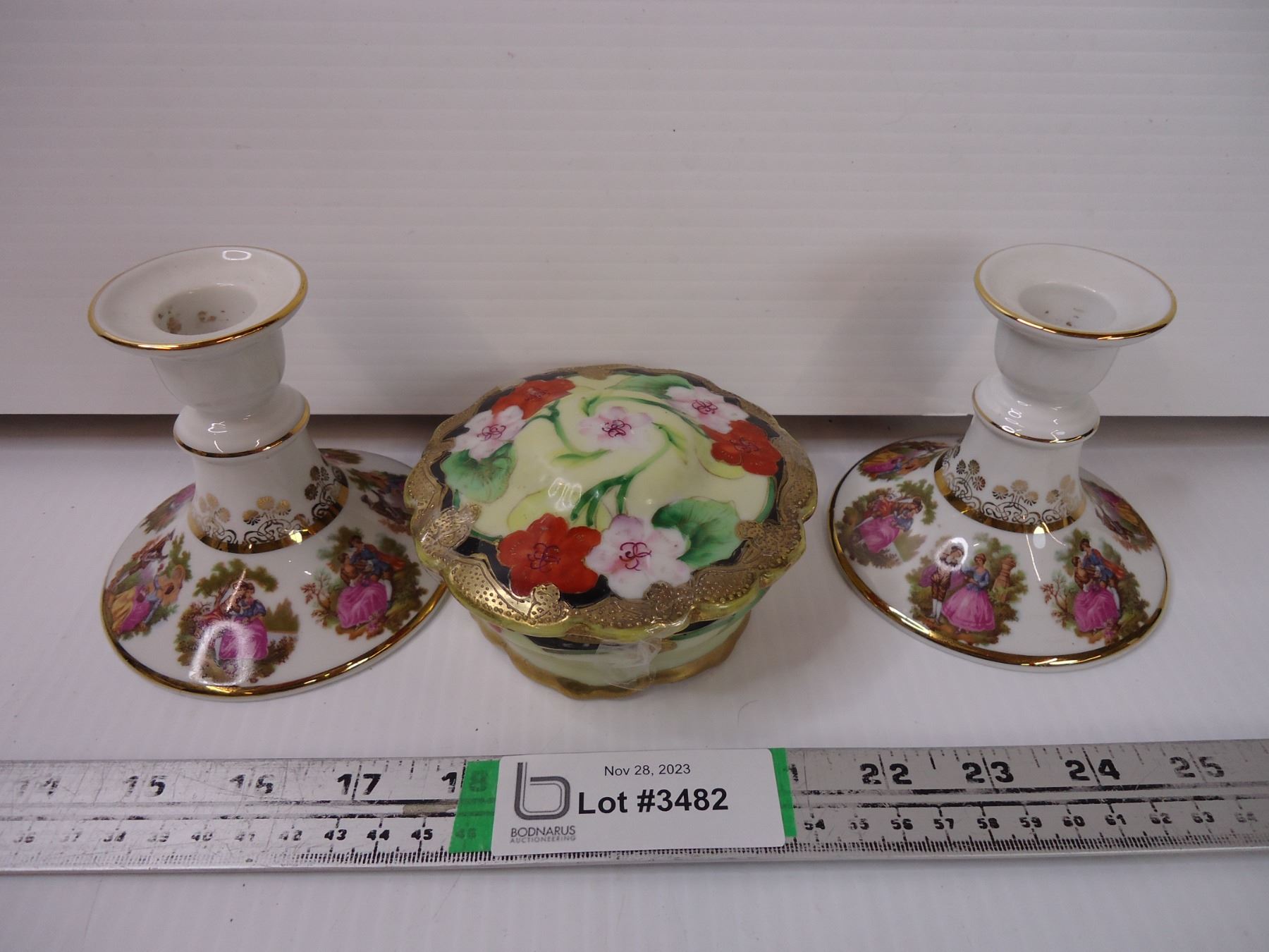 (2) Bayreuth(West Germany) Candle Holders and Vintage Nippon Roses Trinket Dish