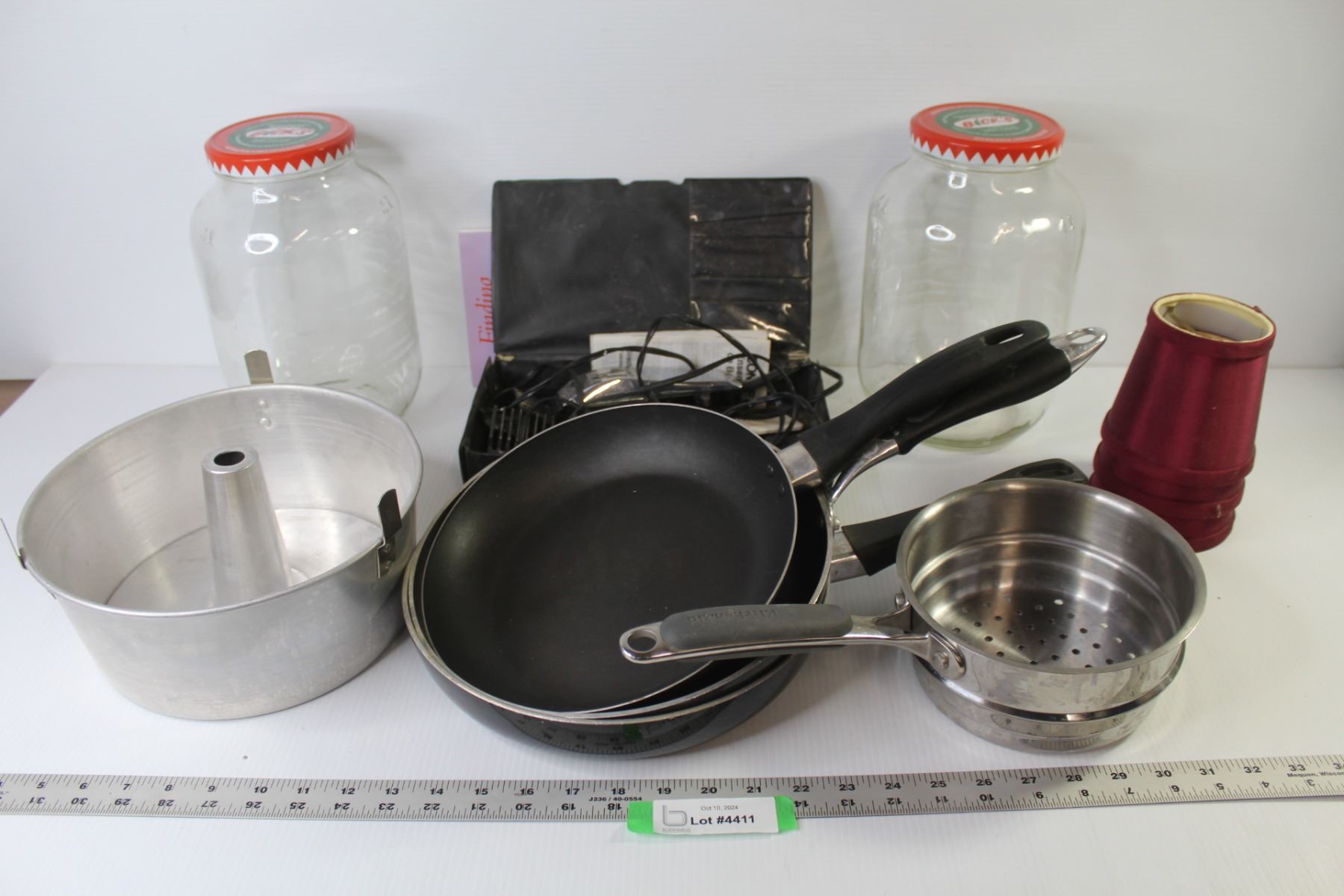(2) Bick's Pickle Jars, Conair Home Barber Set, (3) Small Lampshades, (3) Frying Pans, Angel food Ca