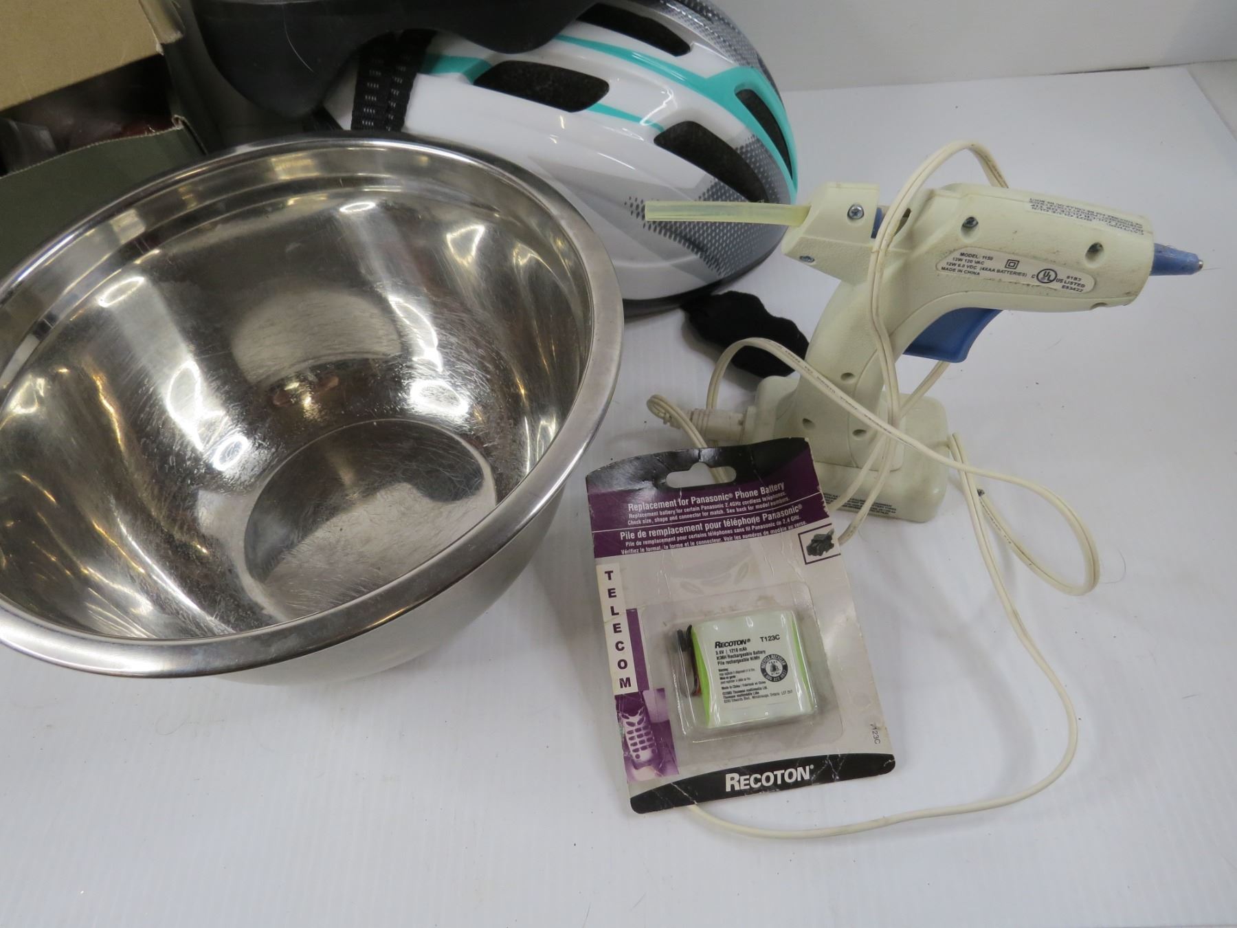 (2) Bicycle Helmets - Speakers & Microphones - Metal Bowl - Phone Replacement Battery - Power Bar - Box of Crafting Items - Glue Gun
