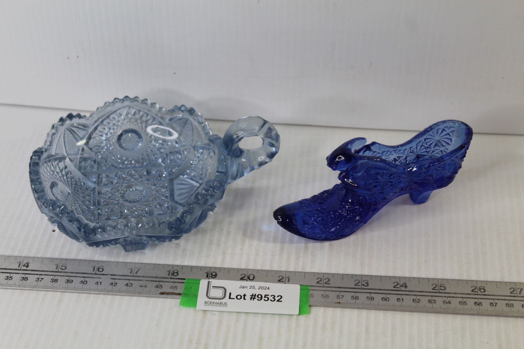 (2) Blue Cut Glass Dishes - Finger Dish - Glass Boot