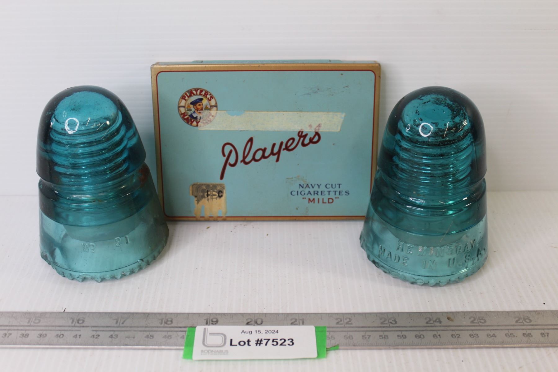 (2) Blue HemmingRay Glass Insulators (have chips) - Player's Cigarette Tin