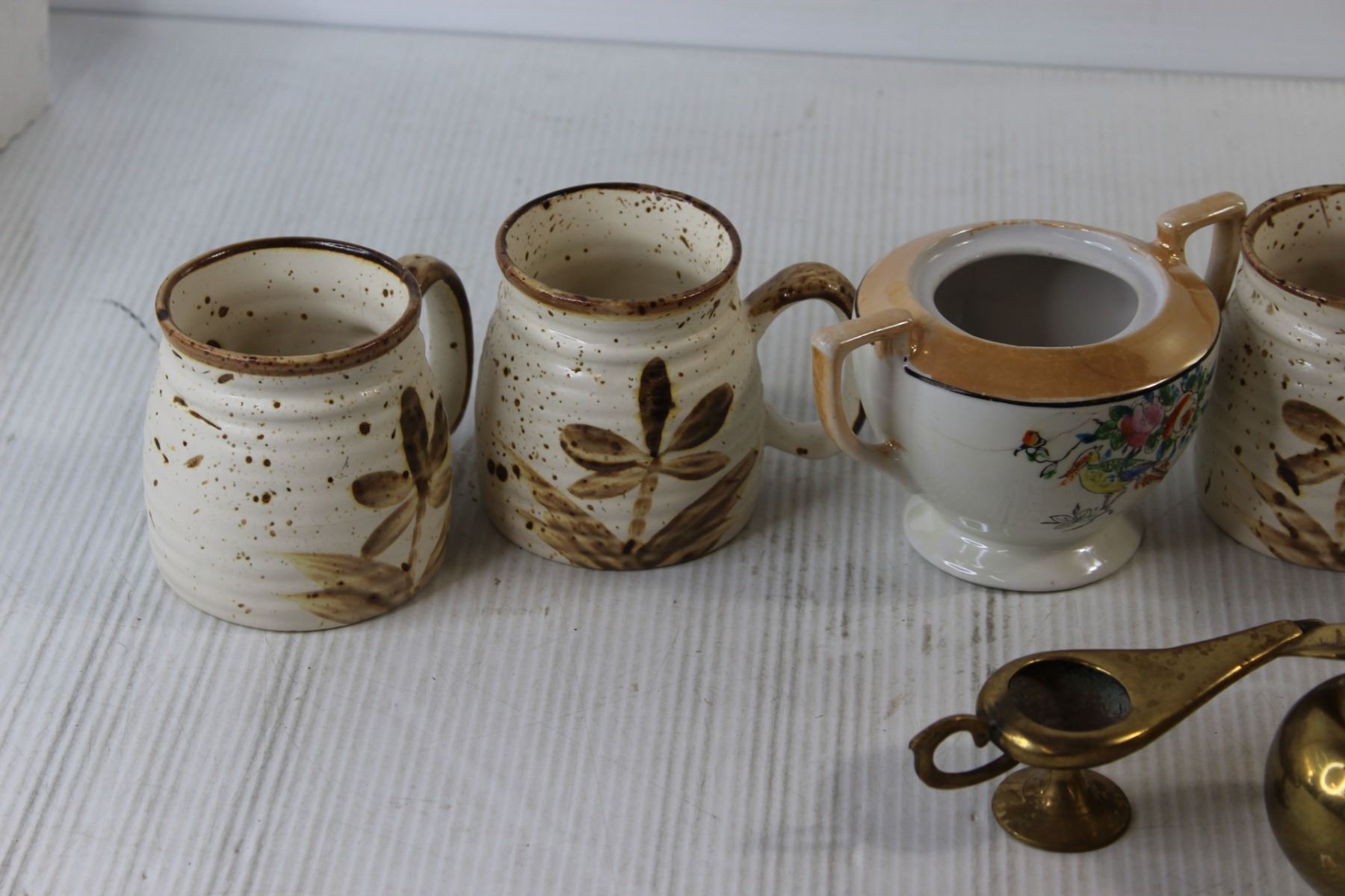 (2) Brass Trinkets, (4) Coffee Mugs, Sugar Holder