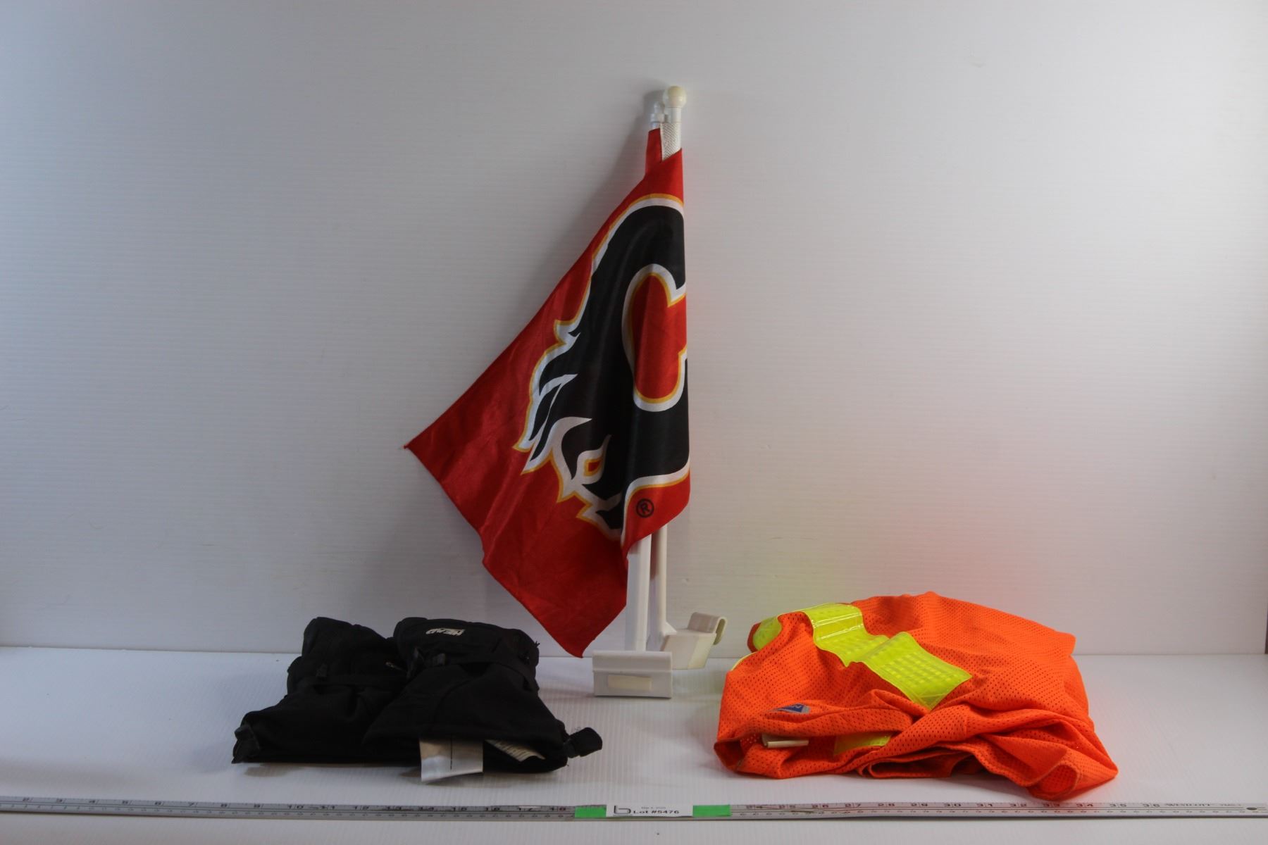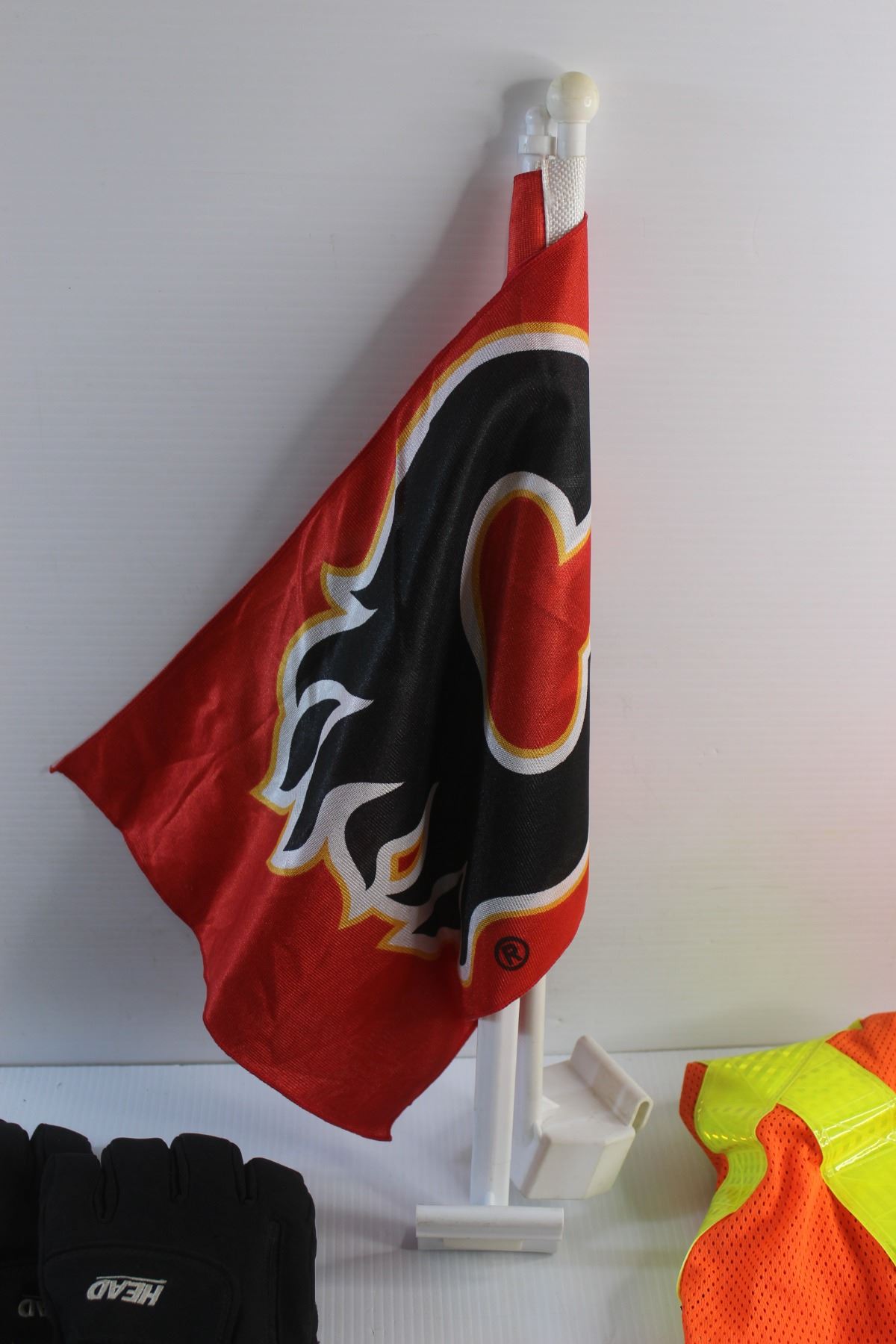 (2) Calgary Flames Flags, Winter Gloves and Reflective Safety T Shirt - Size L