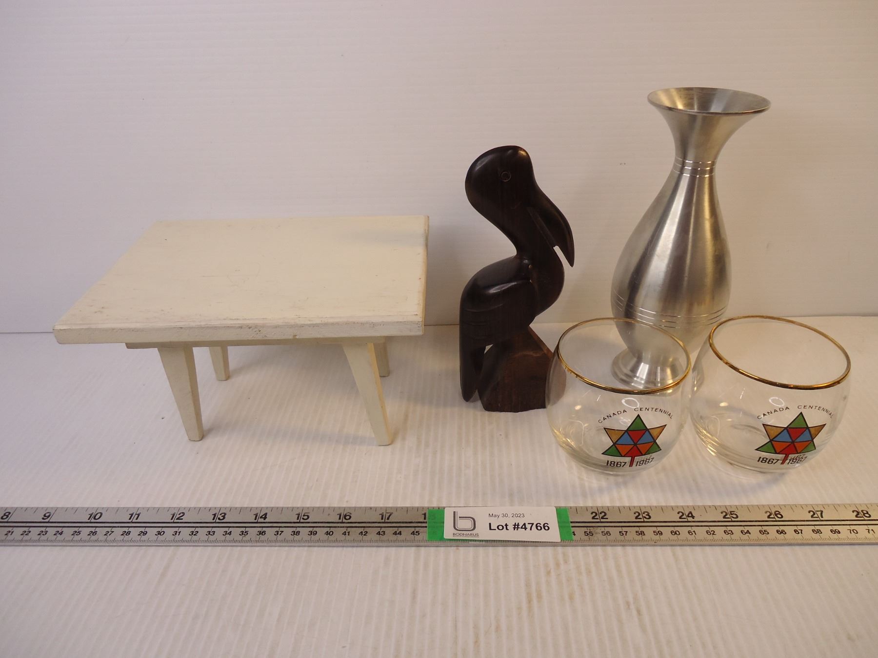 (2) Canada Highball Glasses, Vase, Wood Carving, Homemade Table