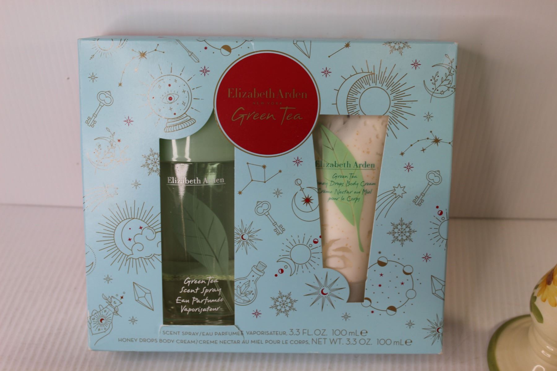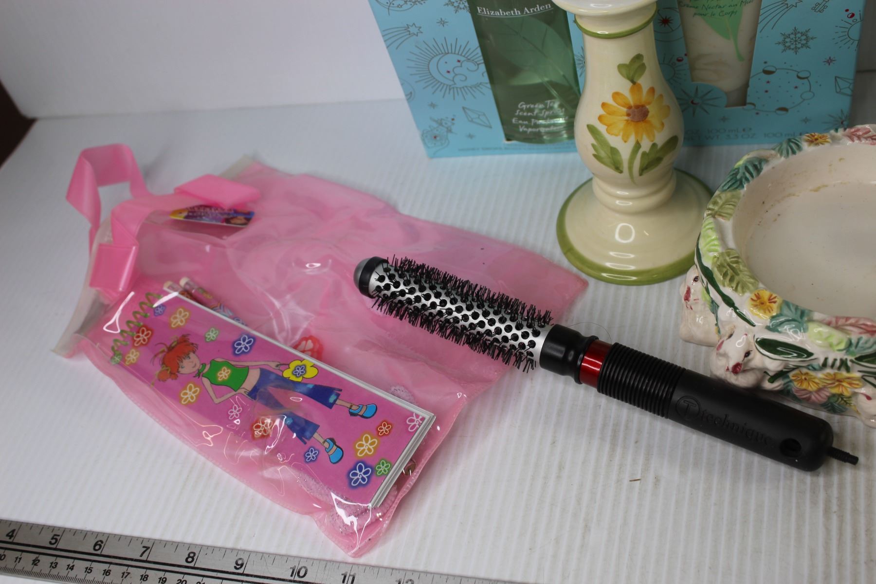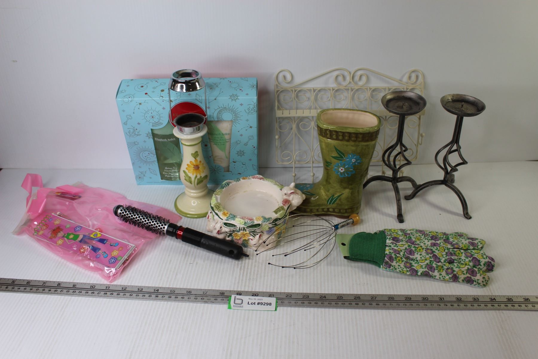 (2) Candle Holders - Garden Gloves - Metal Key Holder - Boot Vase - Elizabeth Arden Beauty Products - Pencil Case - Misc. Items
