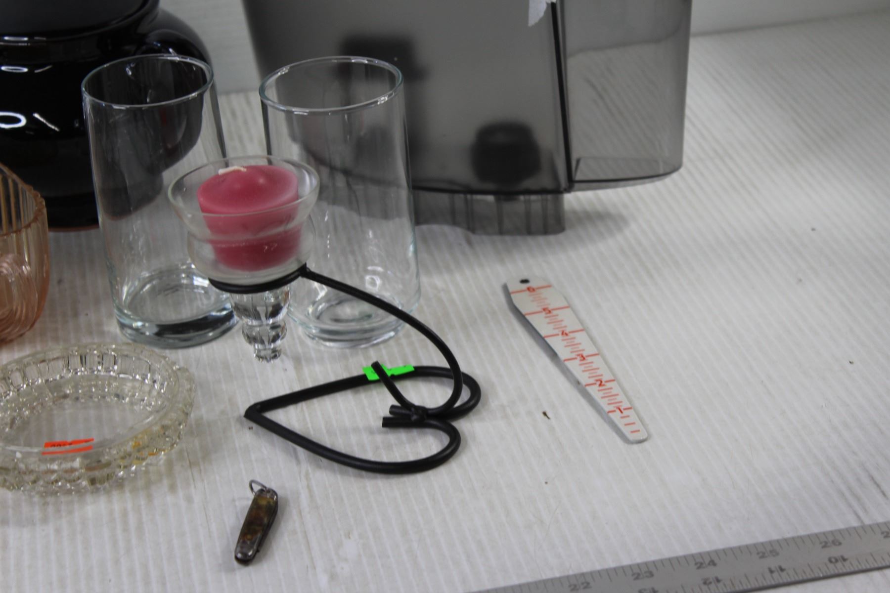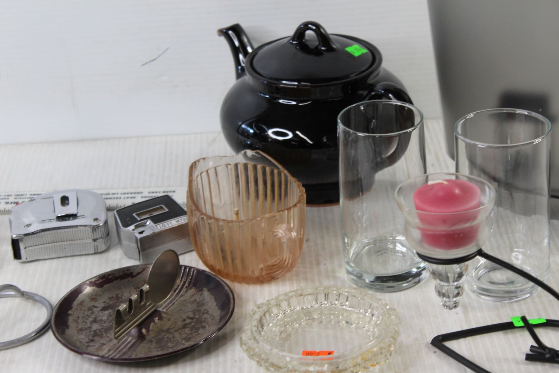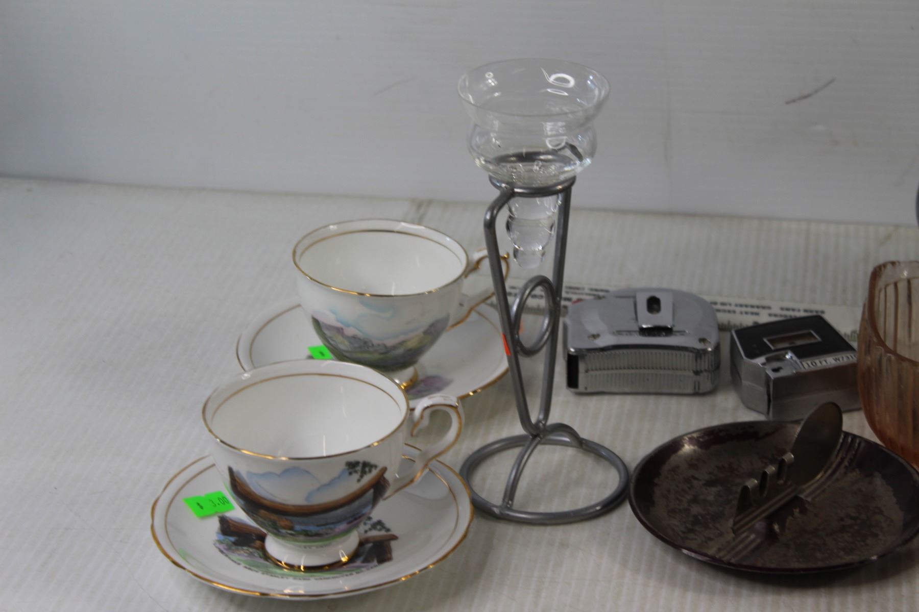 (2) Candle Holders, teapot, (2) Glass Cups, Ash Tray, (2) China Cups With Saucers, Misc.