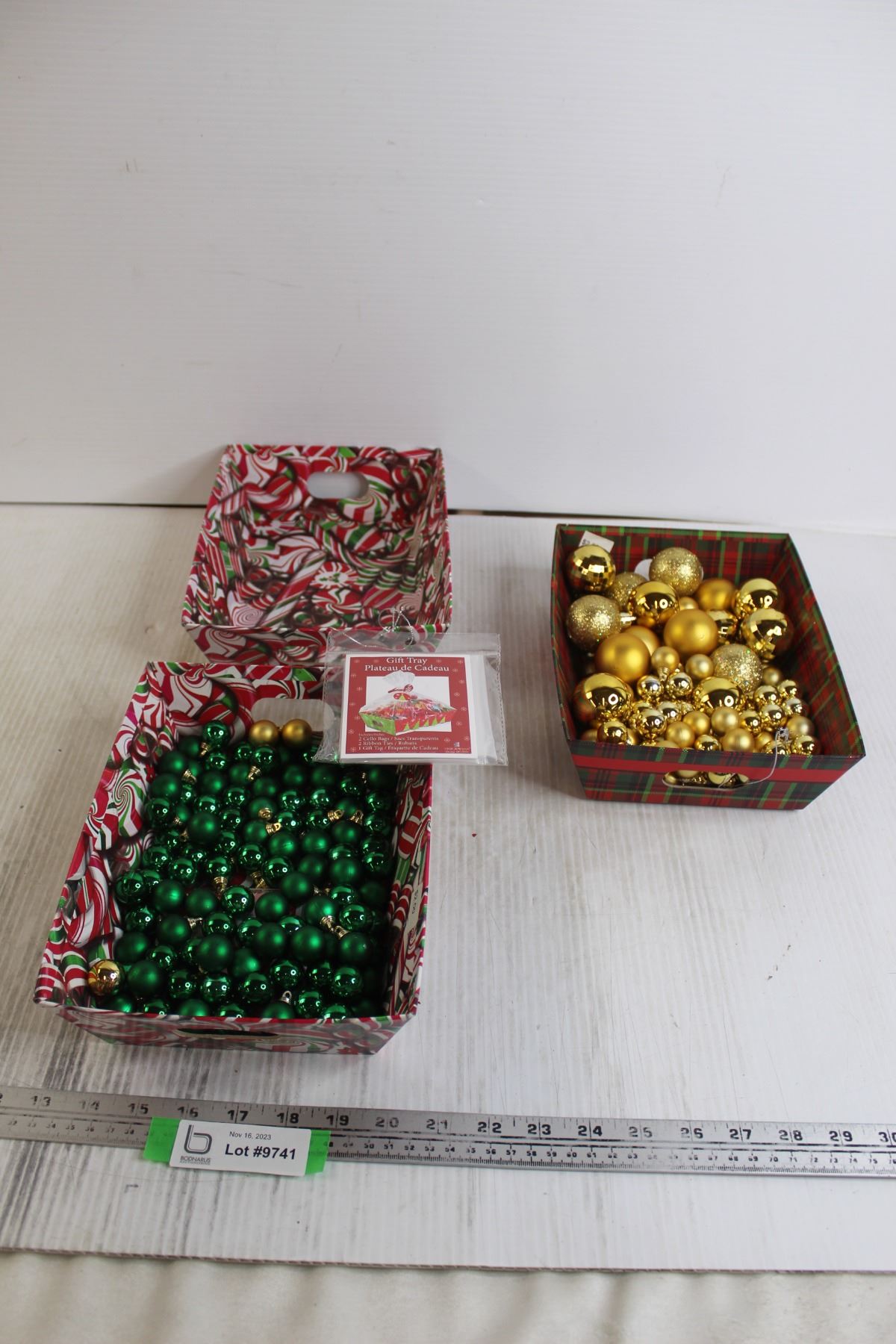 (2) Candy Cane Trays, Plaid Tray, (30+) Assorted Yellow and Green Ornaments