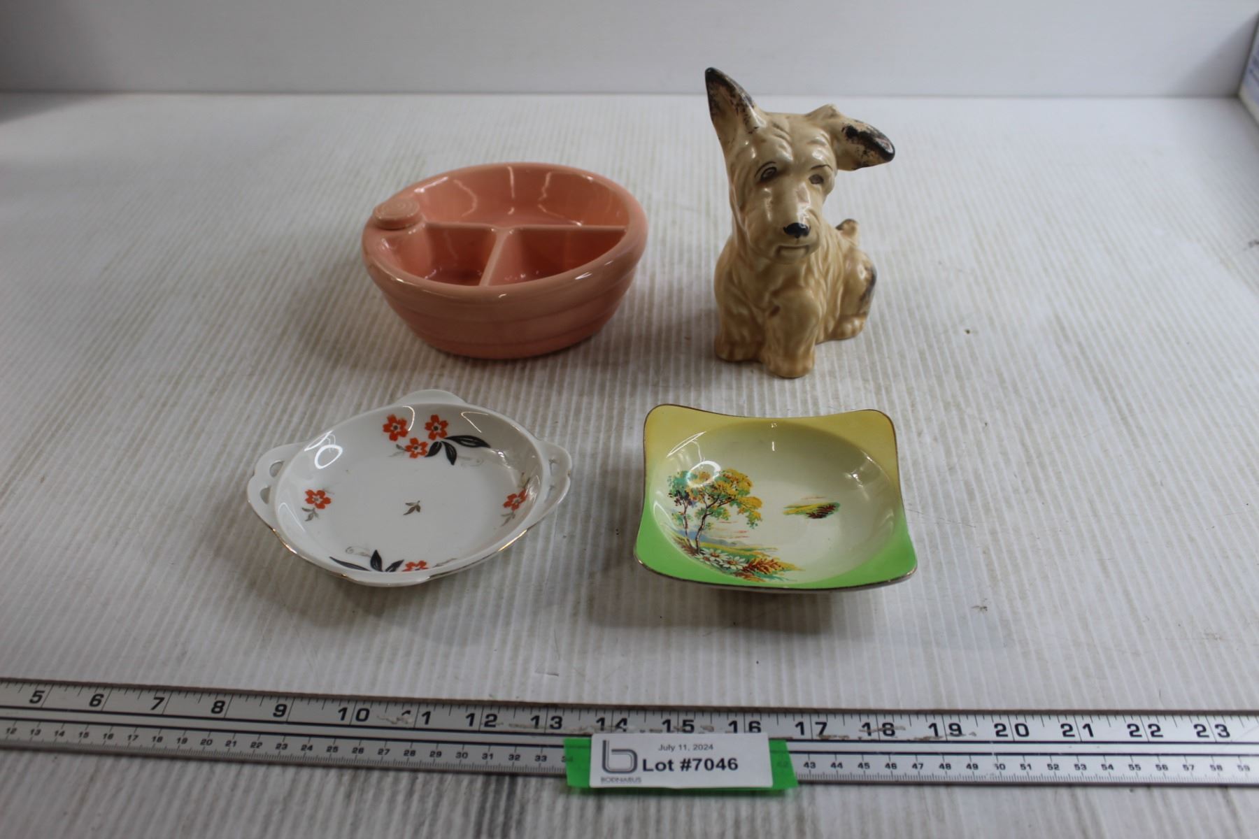 (2) Candy Dishes, 1940s Baby Warming Dish and Dog Statue