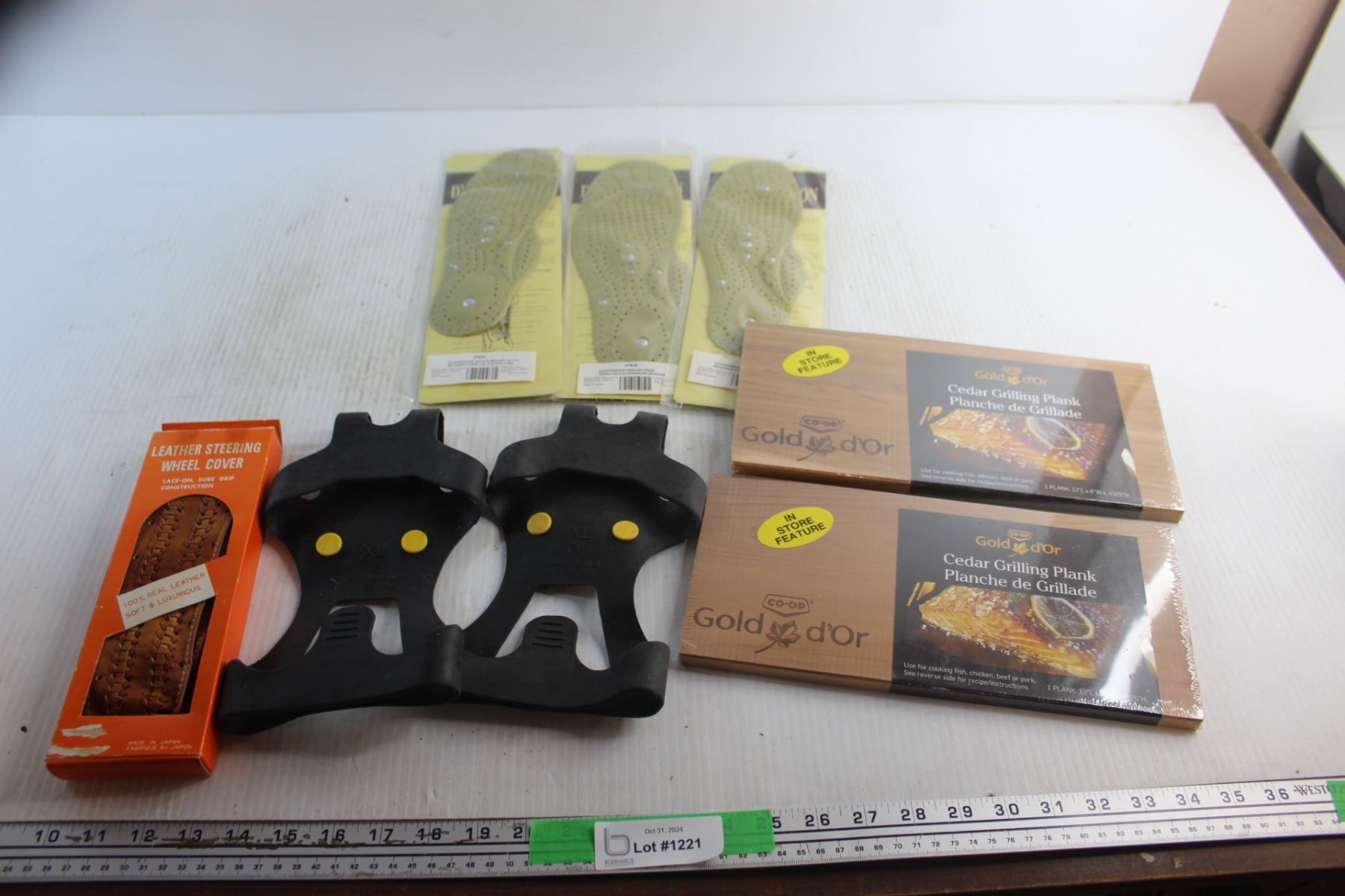 (2) Cedar Grilling Planks, Leather Steering Wheel Cover, Acupuncture Insoles and Pair of Ice Tractio