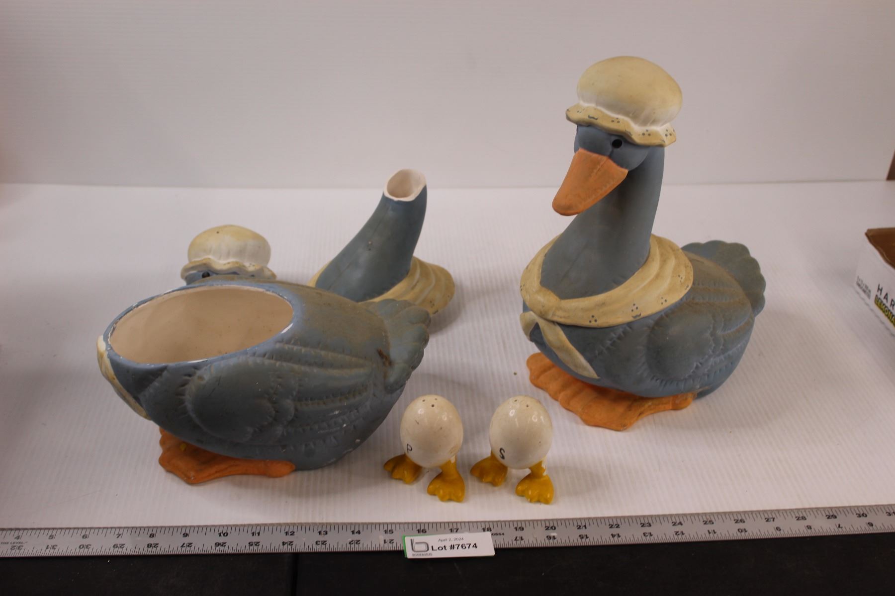 (2) Ceramic Houseware Ducks ((1) Broken), Salt and Pepper Shaker Eggs