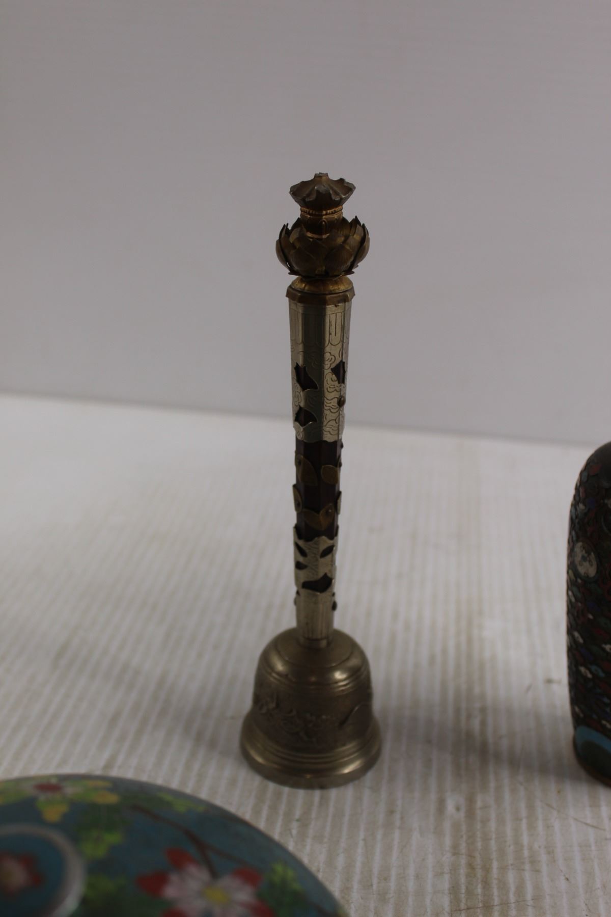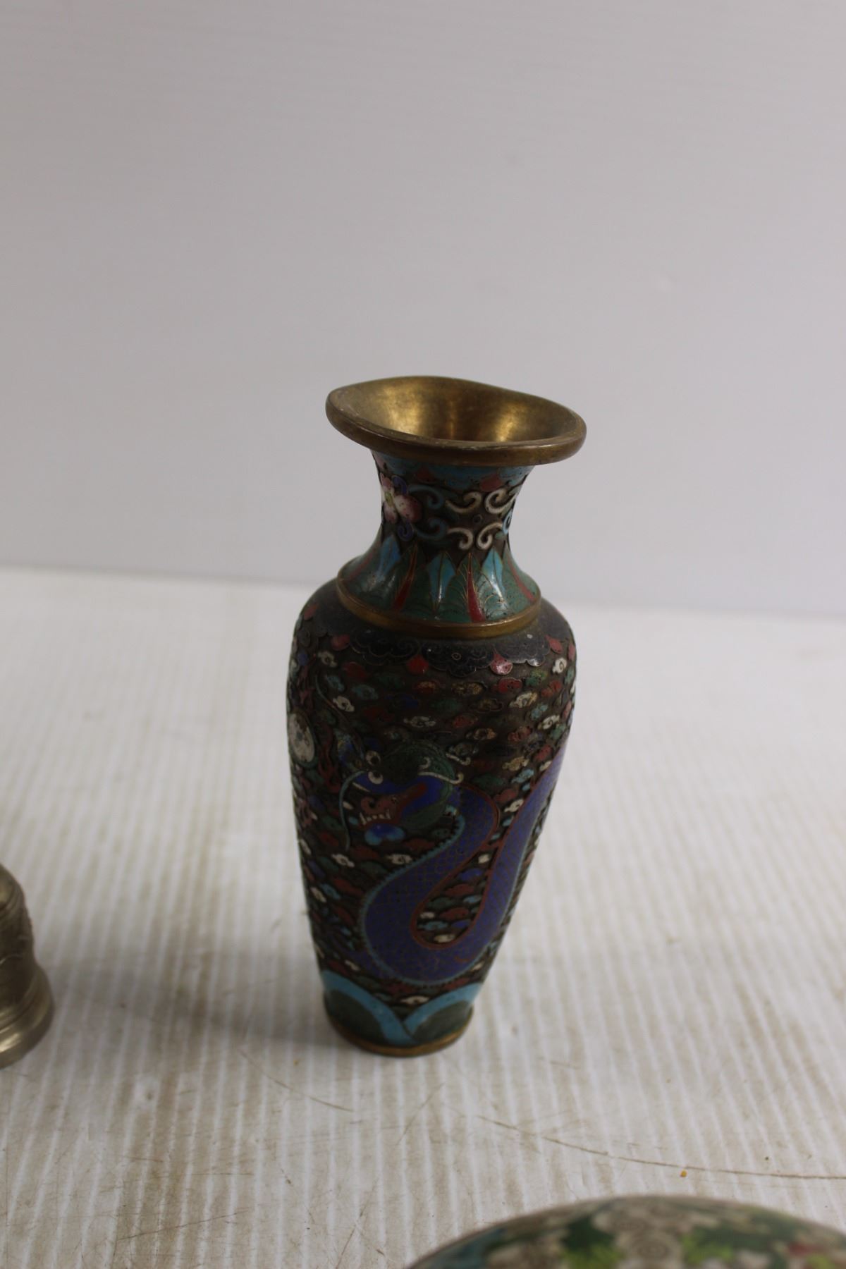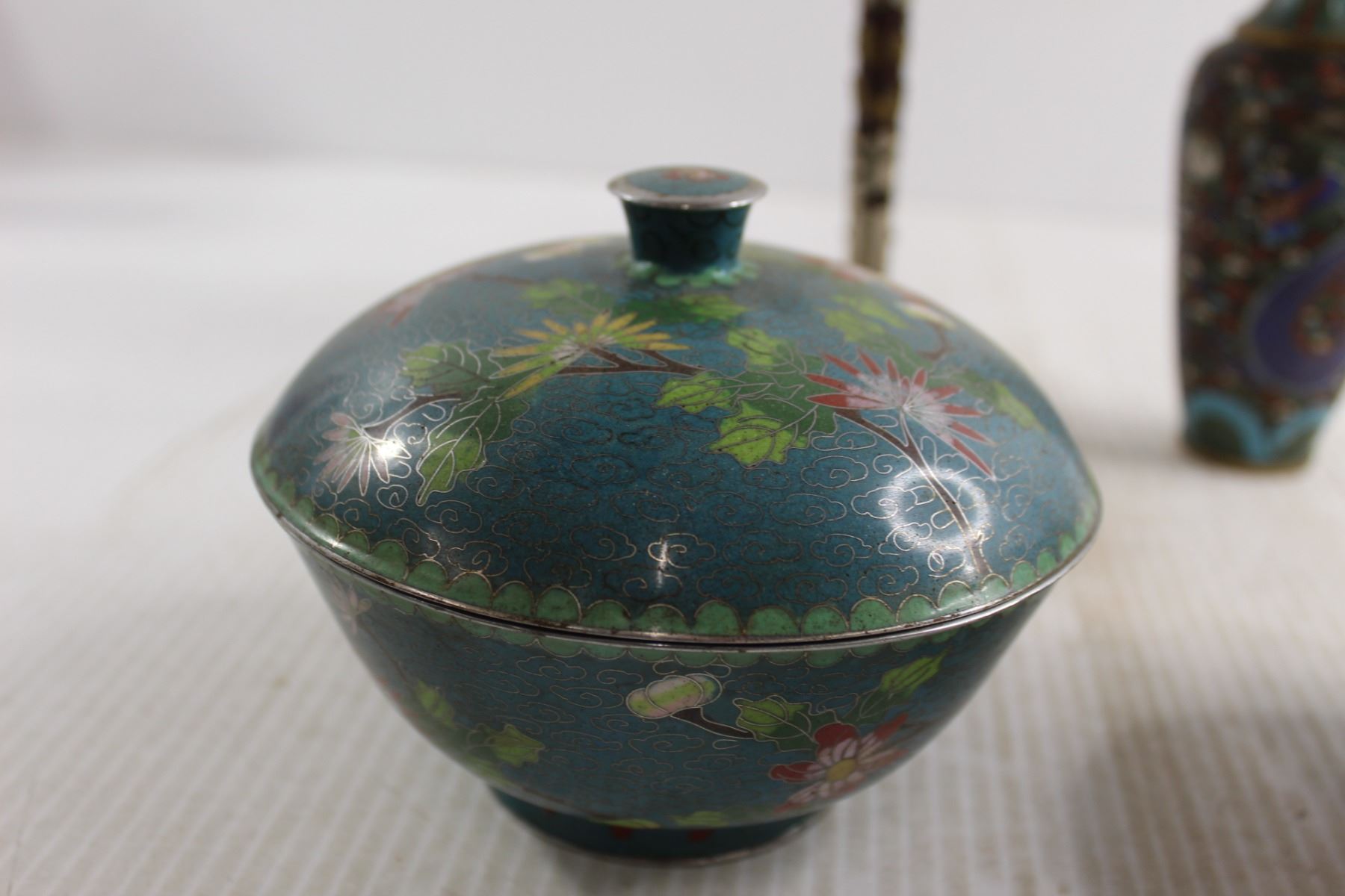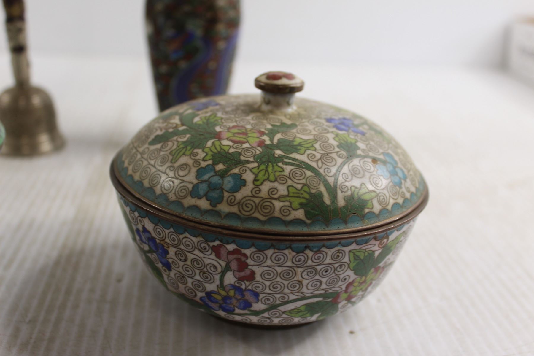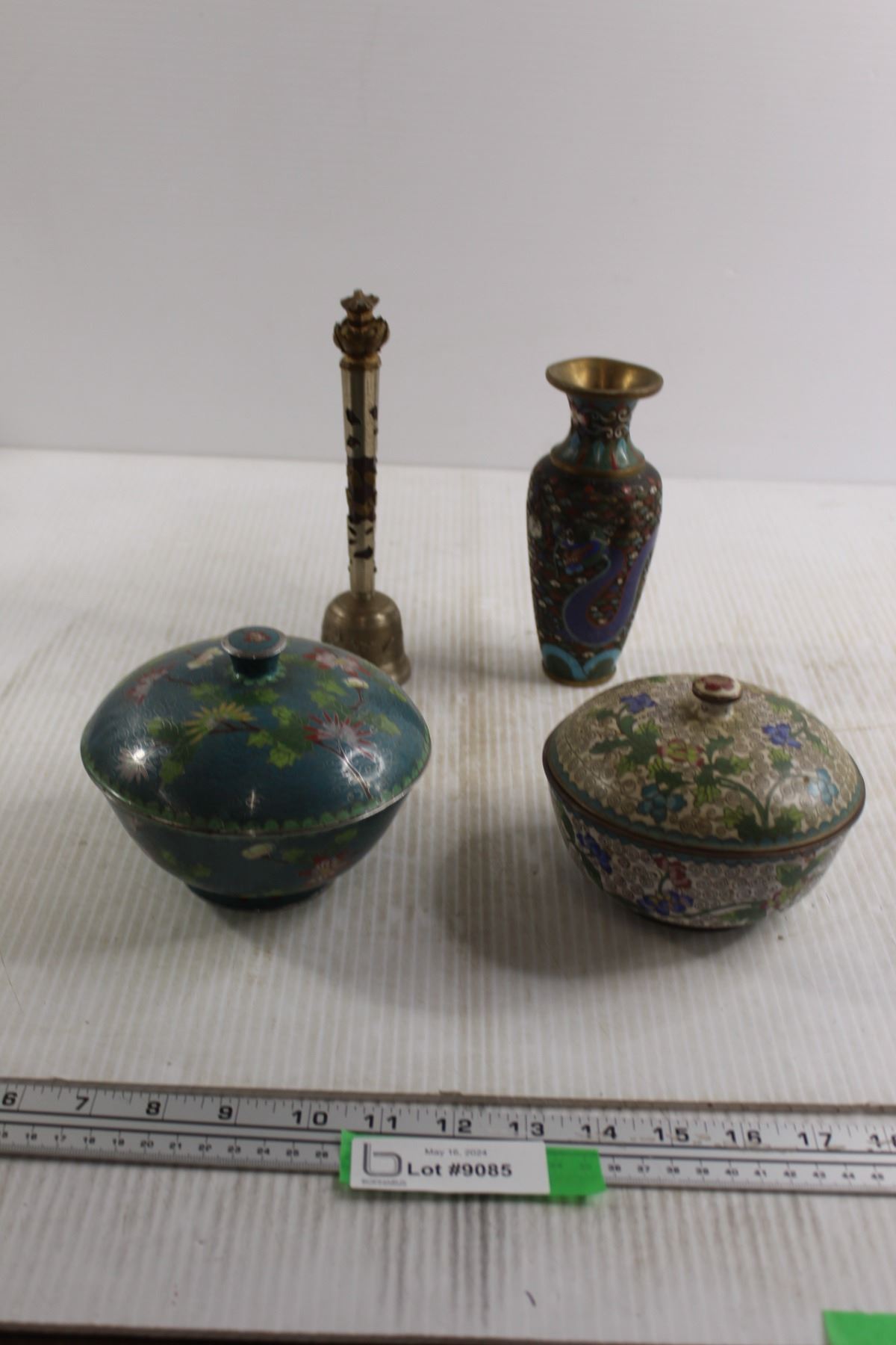 (2) Chinese Cloisonne Bowls with Lids, Vase, and Bell