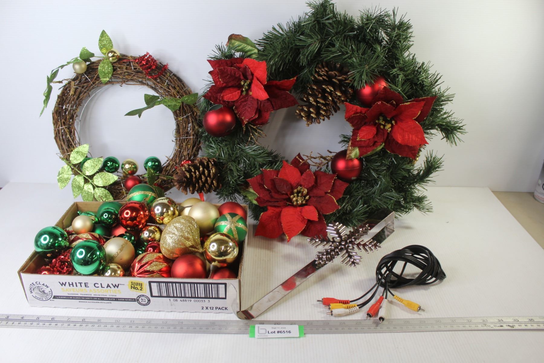 (2) Christmas Wreaths - Ornaments - Stereo Wires - Door Hook