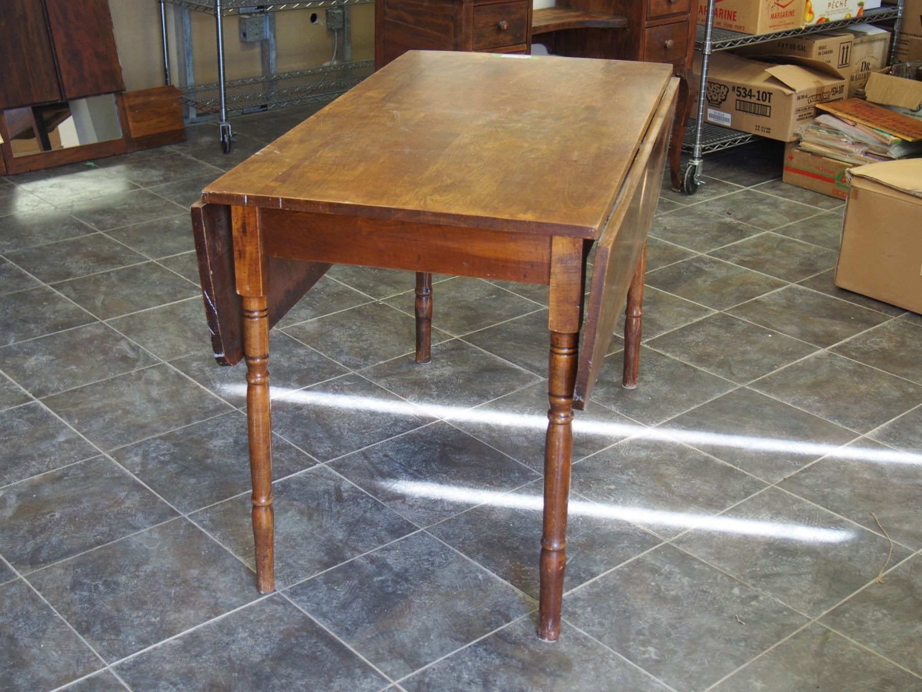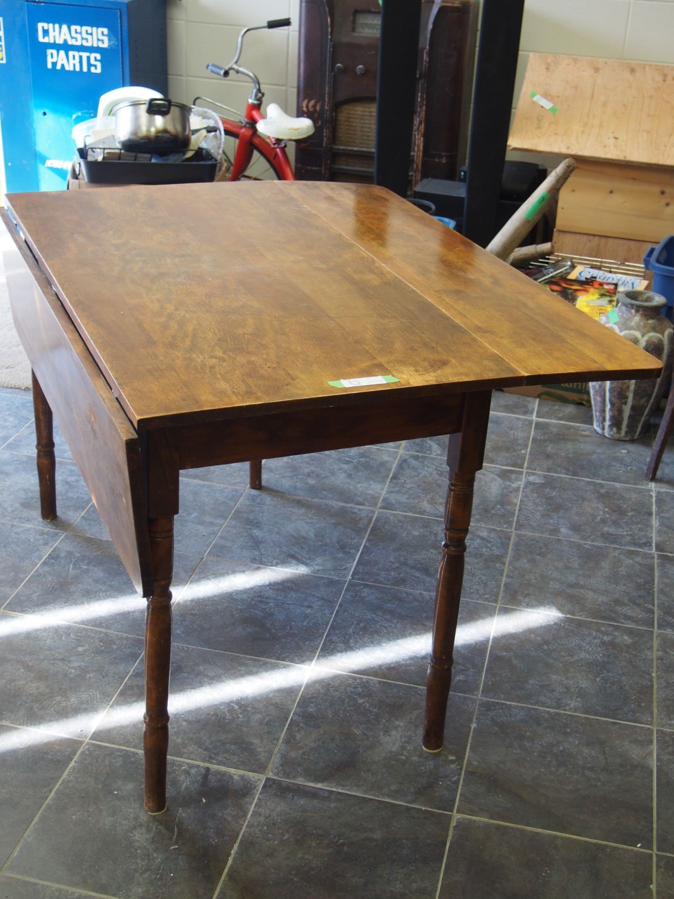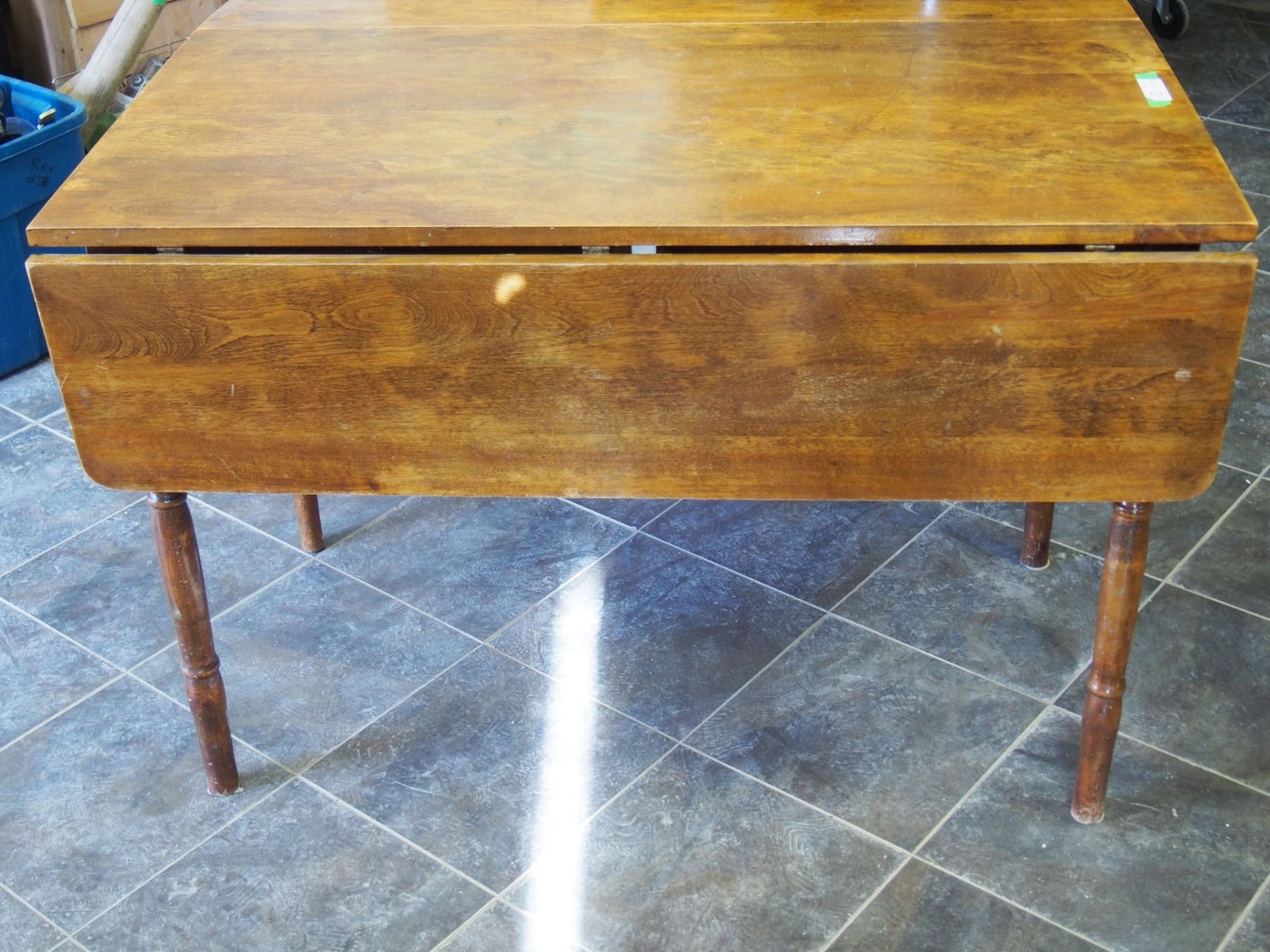 2 DROPLEAF TABLE (46 IN LONG 24 IN WIDE CLOSED) (2 LEAVES 11 IN EACH) (1 PIECE IS MISSING THAT HOLDS THE ONE LEAF UP