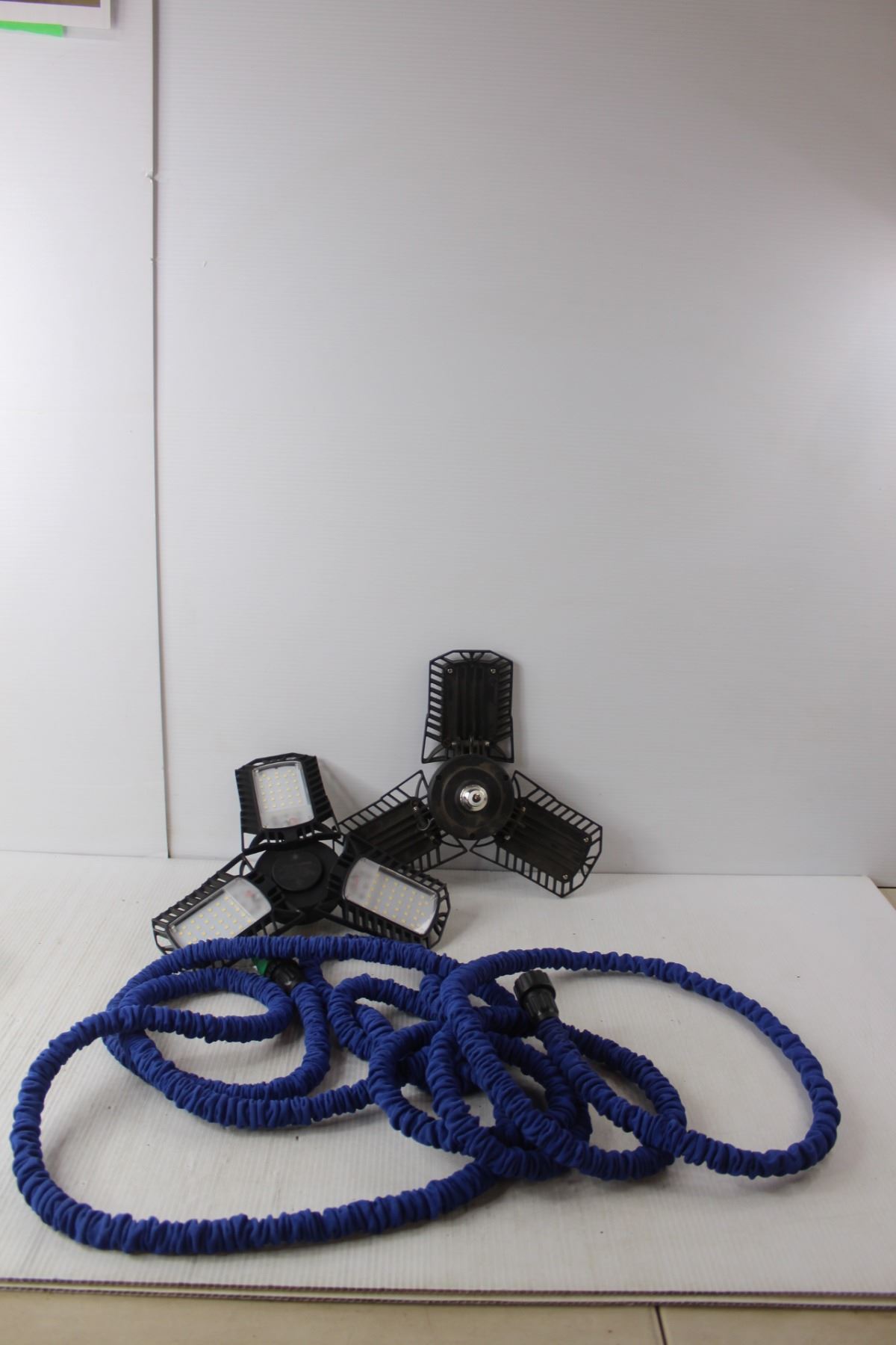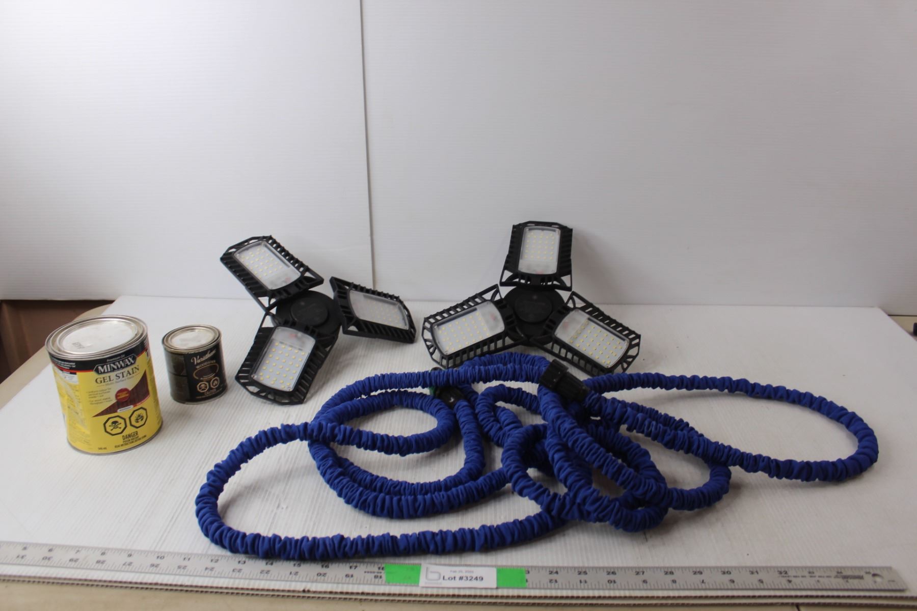 (2) Deformable Garage Lights, Wood & Glass Stains, Extendable Garden Hose
